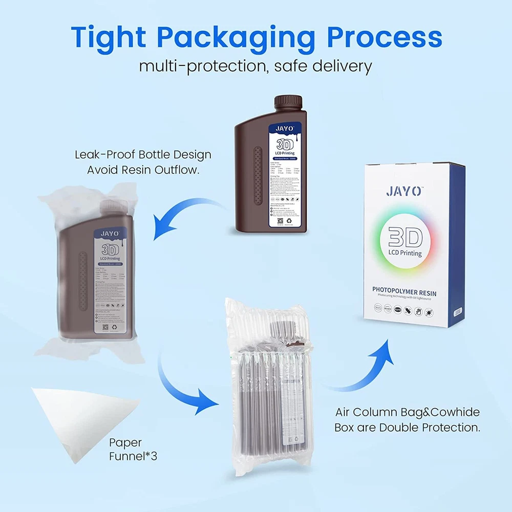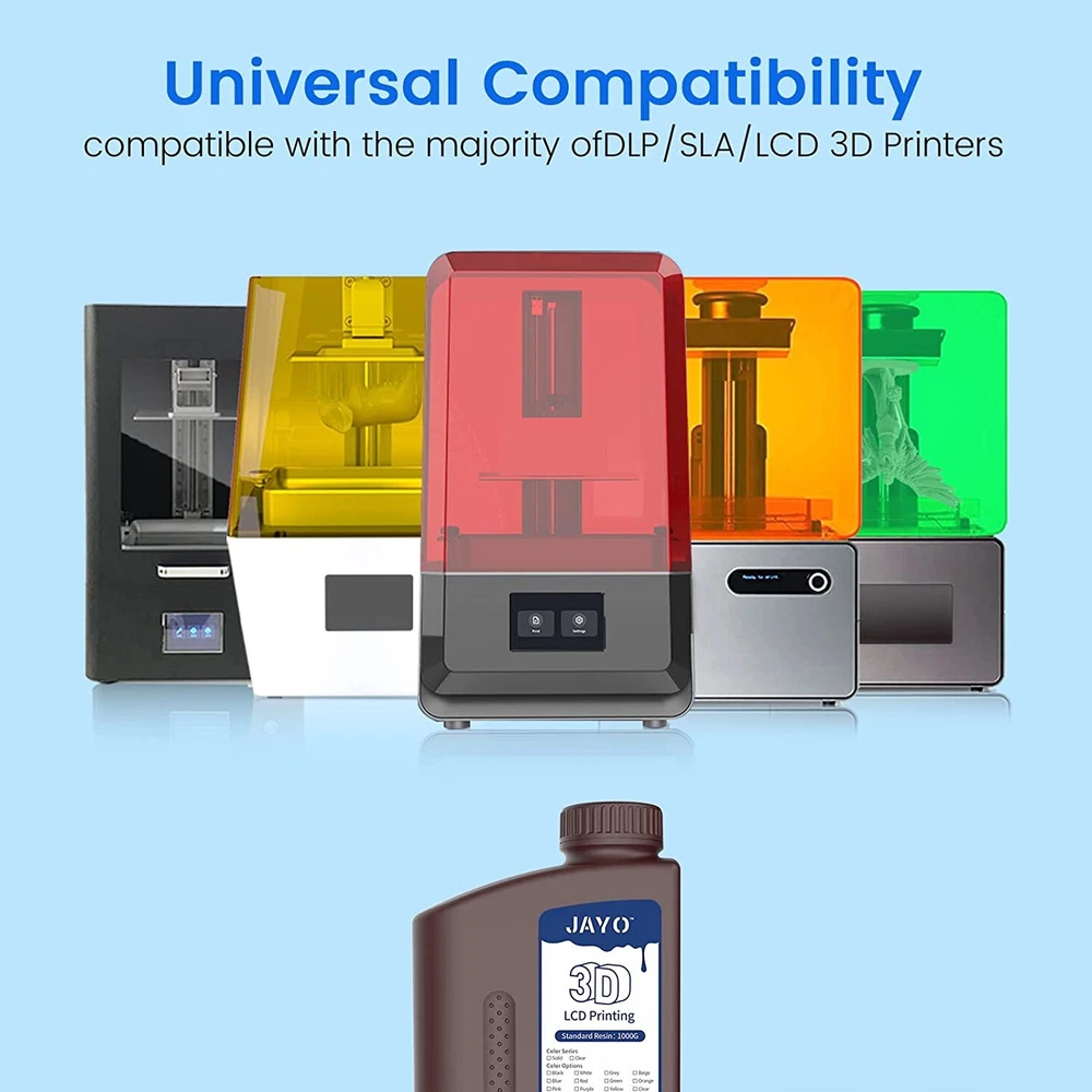 JAYO 14K High Precision 3D UV Resin 405nm For LCD / DLP / SLA 3D Resin Printer 14K Ultra-high Precision Resin - JAYO 14K 3D printer standard resin, the details of the printed resin model are super delicate and shows excellent results. The matte texture makes the 3d printed resin model more expressive and vivid. It is very suitable for printing figures that need to show rich details. Premium 3D Printing Rapid Resin - The upgraded matte 405uv 3D printer photopolymer resin has stronger light resistance and can more accurately display the details of the resin printed model. After rapid curing, the original color and effect of the resin are maintained, improving the success rate of printing. Low Shrinkage 3D Printing Resins - JAYO 3d resin R&D team focuses on improving the printing stability of 3D resin and reducing the volume shrinkage during the curing process. With JAYO 14K 3D resin, the printed model will not prone to deformation or cracking after wash and curing. Low Odor 405nm UV Photopolymer Resin - After testing, JAYO 3D 14K standard resin has a lower printing odor compared to other 3D resins in the market, providing 3D resin users with a more comfortable printing environment. JAYO resin is also easy to use and can easily clean the print model with alcohol or ethanol. Widely Compatible 3D Resin - JAYO has independent production lines for various 3d resins, such as JAYO red wax resin, standard resin, upgraded standard resin, water-washable resin, ABS-like resin, nylon resin, etc. JAYO 3D resins are suitable for most resin 3D printers on the market. Type 14K Standard Resin Easy to Clean with Alcohol Weight 1KG Features 14K Ultra-high Precision, Matte Texture, Super Delicate, Lower Printing Odor Curing Wavelength 395-405nm Surface Hardness 80-84 D Molding Shrinkage 6%-8% Elongation at Break 10% Bending Strength 10 Mpa Bending Modulus 1224 MPa Bottom Exposure Time RGB Screen: 40-100 s Mono Screen: 30-80 s Layers Exposure Time RGB Screen: 6-15 s Mono Screen: 2-3.5 s 3D Printer Resin