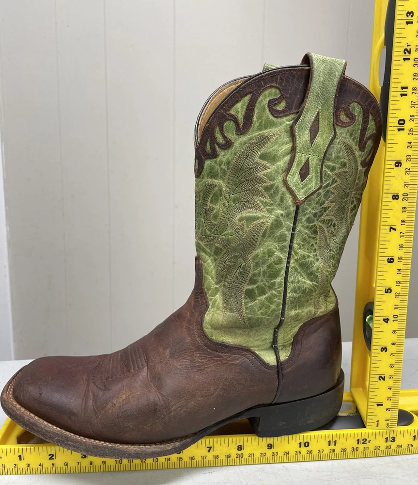 Style: Western Color: Green Shoe Width: EE Model: JBM6005 Theme: Cowboy, Western Shoe Shaft Style: Mid-Calf Closure: Pull On Brand: J.B. Dillon Accents: Embroidered US Shoe Size: 8.5 Pattern: Western Type: Boot Toe Shape: Square Toe Character: Boots Department: Men Upper Material: Leather Features: Comfort