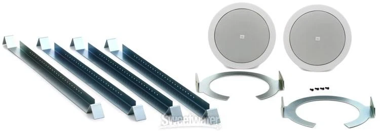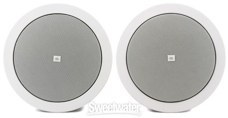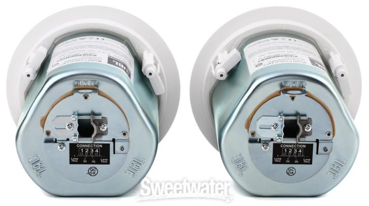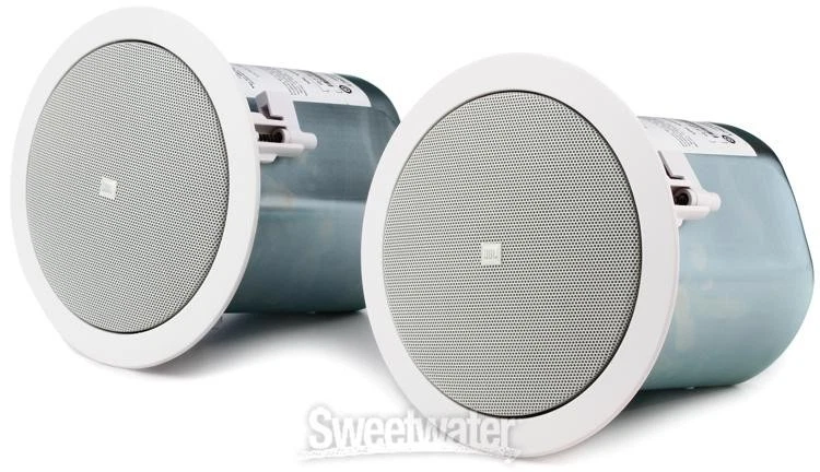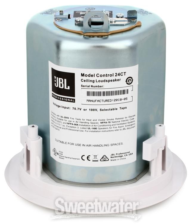 Great Sound — Invisibly Need great sound without the visual clutter or cable mess? JBL's Control 24CT ceiling speakers deliver clean, crisp audio, and are perfect for office installations, surround sound, or a secondary speaker system in another room. JBL engineers have done all the hard work, making installation a breeze.Outstanding Sound Control 24CT's 16 ohm impedance allows use of multiple speakers in parallel without having to resort to a pricey constant voltage distributed system. An aluminum voice coil former provides enhanced cooling for increased long-term power handling, while the coaxially mounted .75-inch titanium coated tweeter gives you clear, extended highs. The tweeter is diffraction-loaded for broad, even listening-area coverage: the 130-degree dispersion pattern allows you to use fewer speakers, giving you a simpler, less expensive installation!Durable components Control 24CT's computer-tweaked ported enclosure serves up warm, smooth bottom end. The Control 24CT's 4-inch woofer sports a polypropylene-coated cone and a Sweetwater is an Authorized JBL Dealer Genuine New Item Sweetwater's 2-year warranty JBL Control 24CT 4-inch Ceiling Speakers with Transformer (Pair) 4" 2-way 80W Ceiling 70 Volt Speaker - White Great Sound — Invisibly Need great sound without the visual clutter or cable mess? JBL's Control 24CT ceiling speakers deliver clean, crisp audio, and are perfect for office installations, surround sound, or a secondary speaker system in another room. JBL engineers have done all the hard work, making installation a breeze. Outstanding Sound Control 24CT's 16 ohm impedance allows use of multiple speakers in parallel without having to resort to a pricey constant voltage distributed system. An aluminum voice coil former provides enhanced cooling for increased long-term power handling, while the coaxially mounted .75-inch titanium coated tweeter gives you clear, extended highs. The tweeter is diffraction-loaded for broad, even listening-area coverage: the 130-degree dispersion pattern allows you to use fewer speakers, giving you a simpler, less expensive installation! Durable components Control 24CT's computer-tweaked ported enclosure serves up warm, smooth bottom end. The Control 24CT's 4-inch woofer sports a polypropylene-coated cone and a pure butyl-rubber surround for long life - even in high-humidity climates. Want more bass? No problem: simply extend your low-frequency output by adding a Control Contractor subwoofer. JBL: Top-quality pro audio the name JBL has long been associated with top-quality pro audio, and their Control Contractor Series loudspeakers benefit from this extensive expertise. JBL offers a range of surface-mount, in-ceiling and in-wall solutions that give you complete control over any architectural, aesthetic or system performance requirement. So if you need easy-to-install wide-coverage compact ceiling loudspeakers for background or foreground music or a music-plus-paging system, look no further than the JBL Control 24CT. JBL The Control 24CT Features: Coaxially mounted 4-inch woofer with butyl-rubber surround and .75-inch titanium-coated polyester tweeter High power, wide frequency response and low distortion for high SPL capability Wide coverage allows for fewer speakers, reducing your system cost Packaged with grille, backcan and tile rails for fast installation Includes a multitap transformer for 70V/100V systems Specification Detail Powered No Power Configuration 2-way Quantity Pair LF Driver Size 1 x 4" HF Driver Size 1 x 0.75" Power Rating 80W 70V/100V Output 70V/100V: 30W, 15W, 7.5W, 3.7W (70V only) Impedance 16 ohms Frequency Range 80Hz-20kHz (-10dB) Crossover Frequency 3.5kHz Maximum Peak SPL 102dB Horizontal Coverage Angle 130 Degrees Vertical Coverage Angle 130 Degrees Enclosure Material Medium Impact Polystyrene Application Indoor Mounting Options In-ceiling Height 7.7" Width 7.7" Depth 5.3" Weight 6 lbs. RETURN INFORMATION We want you to be completely happy with your purchase from Sweetwater. If you are not satisfied with your product, you may return it for a refund of the purchase price within 30 days. If your purchase was eligible for Free Shipping, the shipping cost will be deducted from your credit or refund. Returns must be in the complete and original packaging with all accessories and complete documentation (Owner's Manual, warranty card, quick start guides, etc.), show no signs of wear or use, and include a Return Authorization number or be subject to a restocking fee.