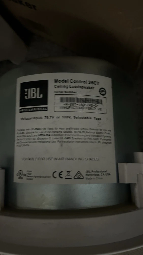 Brand: JBL Model: JBL Control 26CT Type: Ceiling Speaker Audio Inputs: Stereo L/R RCA Color: White Item Height: 210 mm Connectivity: Wired Compatible Model: Control 26CT Driver Size: 6 in RMS Power: 150 W