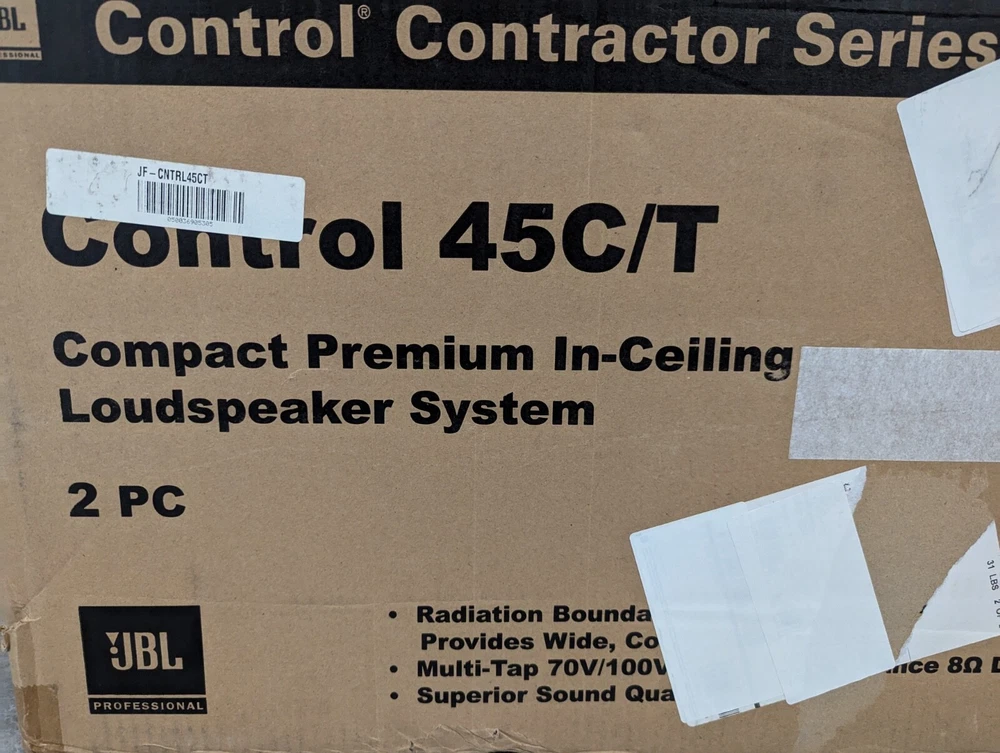 The JBL Control 45C/T is a premium in-ceiling loudspeaker system designed for high-quality audio in commercial and residential spaces. This compact 2-piece set delivers exceptional sound clarity with wide coverage, making it perfect for background music or paging applications. With a sleek, low-profile design and robust construction, it’s ideal for installations requiring superior performance and aesthetics. Built for versatility, it supports 70V/100V distributed systems and low-impedance operation.