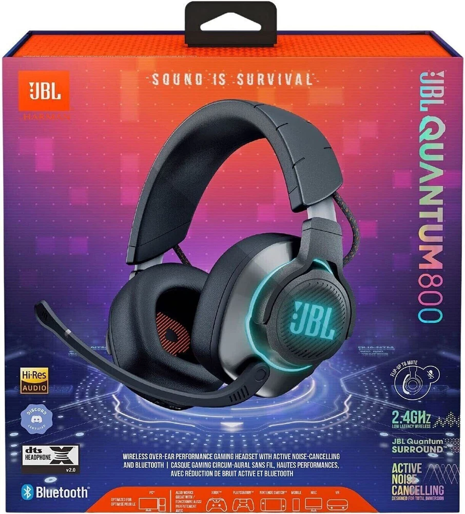 BRAND NEW. STILL IN PLASTIC. Immerse yourself in your favorite games with the JBL Quantum 800 wireless over-ear gaming headset in black. This headset features a comfortable headband and ear-cup design for extended gaming sessions. With Bluetooth connectivity, you can enjoy seamless wireless communication and noise cancellation for clear communication with your teammates. The boom microphone and two earpieces provide superior audio quality, while the sleek black design adds a stylish touch to your gaming setup. Whether you're a professional gamer or just starting out, the JBL Quantum 800 headset is the perfect choice for an immersive gaming experience.