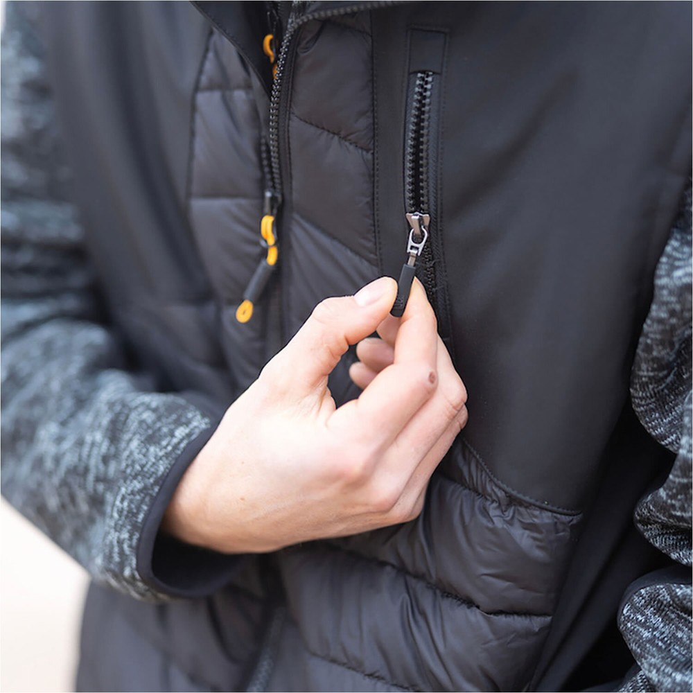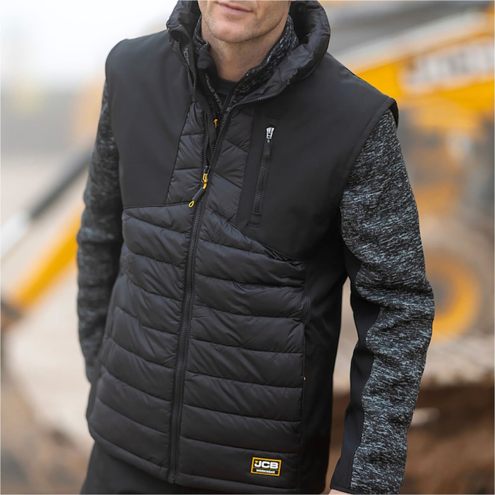 JCB Trade Black Hybrid Padded Gilet The lightweight hybrid padded gilet has a high warmth to weight ratio with no compromise on performance. Stretch softshell panels combine with a padded rip stop body make the jacket easy to move in and extremely warm. Style and comfort combine to deliver a good looking, functional workwear gilet. Fabric: 100% water resistant polyester ripstop fabric, 50gm 100% water resistant polyester twill fleece lined softshell, 320gm Padding: 100% polyester, 140gm Full front black zip Chin guard Left chest pocket with zip 2 side entry zipped pockets JCB branding JCB Trade Black Hybrid Padded Gilet The lightweight hybrid padded gilet has a high warmth to weight ratio with no compromise on performance. Stretch softshell panels combine with a padded rip stop body make the jacket easy to move in and extremely warm. Style and comfort combine to deliver a good looking, functional workwear gilet. Fabric: 100% water resistant polyester ripstop fabric, 50gm 100% water resistant polyester twill fleece lined softshell, 320gm Padding: 100% polyester, 140gm Full front black zip Chin guard Left chest pocket with zip 2 side entry zipped pockets JCB branding JCB Trade Black Hybrid Padded Gilet The lightweight hybrid padded gilet has a high warmth to weight ratio with no compromise on performance. Stretch softshell panels combine with a padded rip stop body make the jacket easy to move in and extremely warm. Style and comfort combine to deliver a good looking, functional workwear gilet. Fabric: 100% water resistant polyester ripstop fabric, 50gm 100% water resistant polyester twill fleece lined softshell, 320gm Padding: 100% polyester, 140gm Full front black zip Chin guard Left chest pocket with zip 2 side entry zipped pockets JCB branding