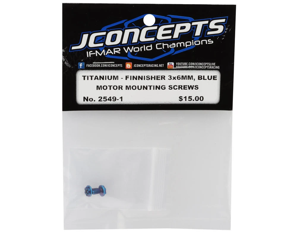 Screws Overview: The JConcepts Finnisher 3x6mm Titanium Motor Mount Screw offers a durable and stylish solution for high-demand applications where a larger head is essential. This precision-machined titanium screw, with its unique, exotic design, is built for motor mounting in both modern and retro one-tenth scale off-road vehicles. Available in two striking colors – burnt blue and stealth black – the Finnisher screw brings both performance and aesthetics to your RC setup. Designed for strength and reduced weight, the JConcepts Finnisher screw is crafted from Grade Five titanium, combining strength and precision in a lightweight package. Its versatile head allows for use with either a two-point-five-millimeter hex driver or a five-point-five-millimeter nut driver, making it an excellent choice for RC enthusiasts looking to upgrade their setups with reliable, quality components. Note: The 3x6mm screw is not compatible with standard RC10B7 motor mounts. Features: JConcepts Finnisher design Precision CNC-machined from Grade 5 titanium Large flange with cuts, holes, and detailed styling Available in burnt blue and stealth black Compatible with both 2.5mm hex and 5.5mm nut drivers Extremely lightweight yet durable Includes: (1) JConcepts Finnisher 3x6mm Titanium Motor Mount Screw About Us | View Store