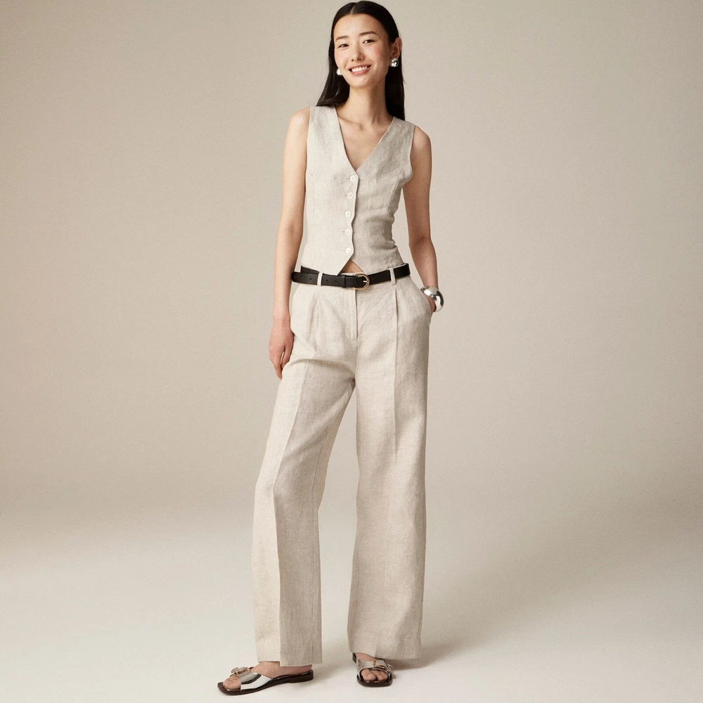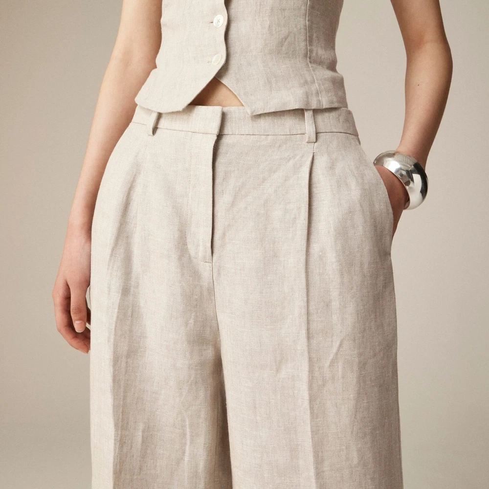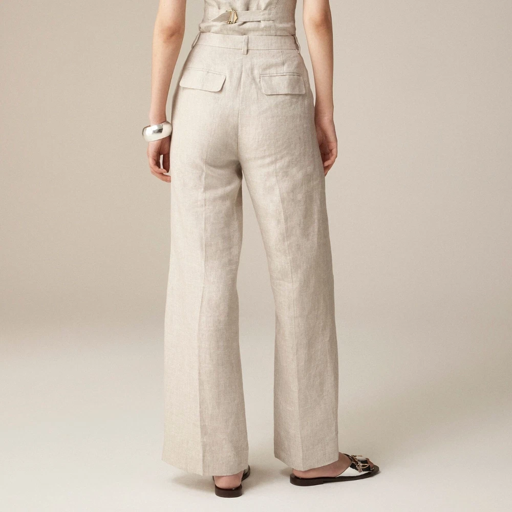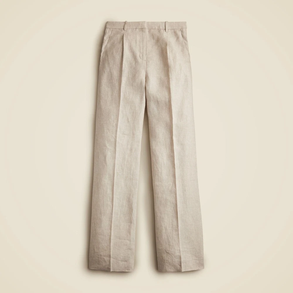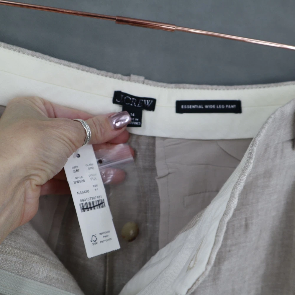 Material: Linen Front Type: Pleated Rise: High (Greater than 10.5 in) Department: Women Leg Style: Wide-Leg Handmade: No Pattern: Solid Vintage: No Personalize: No Fit: Regular Closure: Button, Zip Country/Region of Manufacture: Philippines Season: Fall, Spring, Summer Type: Pants Theme: Beach, Bohemian, City, Nautical, Preppy Seller Notes: “One of the legs has been hemmed to 1/2 inch longer than the other and will need to be re-hemmed.” Brand: J.CREW Size: 14 Accents: Button, Pleated Occasion: Casual, Travel, Workwear Size Type: Regular Garment Care: Machine Washable Features: Breathable, Comfort, Easy Care, Moisture Wicking, Pockets Color: Beige Waist Size: 34 in Inseam: 24.5 in Style: Dress Pants