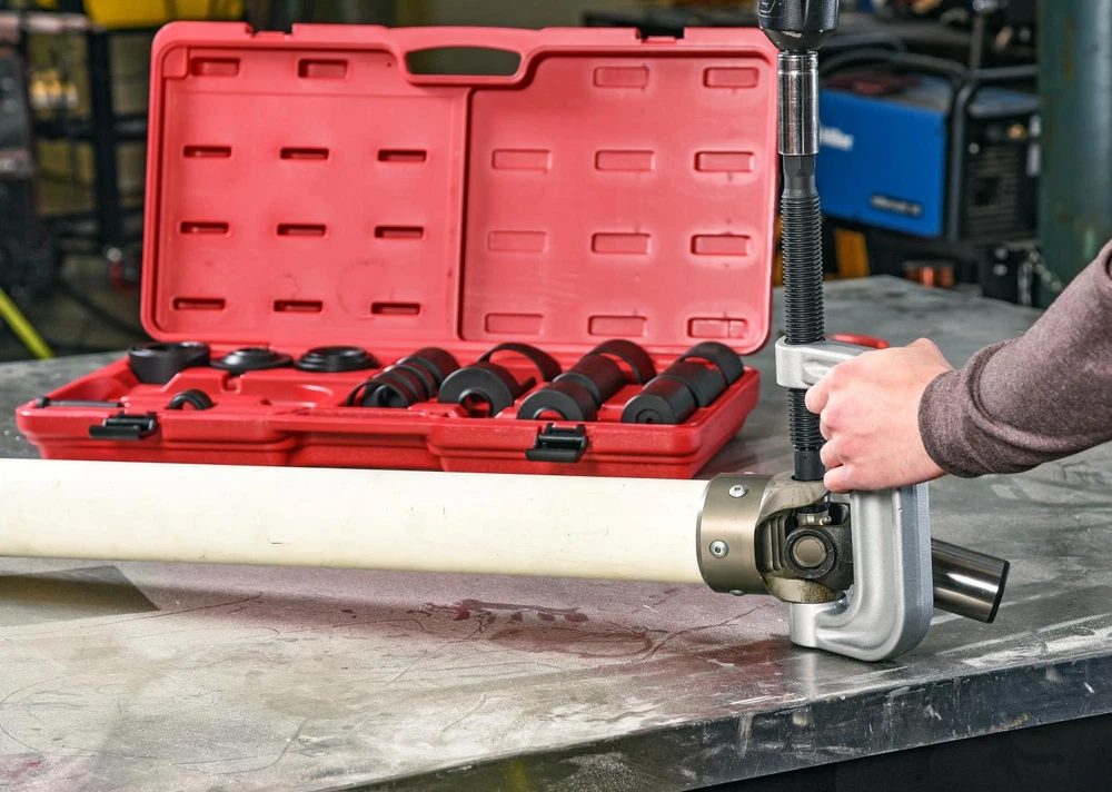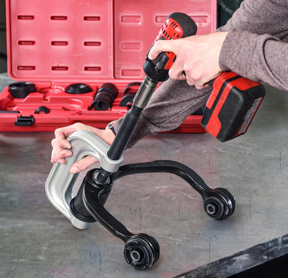Ball Joint Service Kit20-Piece SetRemove/Install Ball Joints, Brake Pins, and U-JointsConstruction: SteelIncludes:(1) C-Press(1) Short Pin(7) Receiving Tubes(3) Adapters(8) Cups(1) Carry Case Parts Breakdown JEGS 555-80639 Ball Joint Service KitMake removing and installing press-fit ball joints, drum brake pins, and u-joints easy with the ball joint service kit from JEGS. This 20-piece kit has most of your needs covered. With a range of tubes, adapters, and cups, designed to fit with the included c-press, you can complete most jobs in the comfort of your garage.JEGS 555-80639 Ball Joint JEGS 80639 Ball Joint Service Kit 20-Piece Set Remove/Install Ball Joints Brake Ball Joint Service Kit 20-Piece Set Remove/Install Ball Joints, Brake Pins, and U-Joints Construction: Steel Includes: (1) C-Press (1) Short Pin (7) Receiving Tubes (3) Adapters (8) Cups (1) Carry Case Parts Breakdown JEGS 555-80639 Ball Joint Service Kit Make removing and installing press-fit ball joints, drum brake pins, and u-joints easy with the ball joint service kit from JEGS. This 20-piece kit has most of your needs covered. With a range of tubes, adapters, and cups, designed to fit with the included c-press, you can complete most jobs in the comfort of your garage. JEGS 555-80639 Ball Joint Service Kit Features: Red plastic blow-molded case securely holds each part in its specific location Designed for press-fit ball joints, will not work with the bolt-in type Fits the 1210 series and larger u-joints Measurements C-Press Opening dimensions: 6 1/8 in. L x 2 1/8 in. D Threaded rod: 9 1/8 in. L x 1.120 in. D Bolt head: 7/8 in. Through opening inside diameter: 1.260 in. Adapters Adapter 1 Side 1 dimensions: 1.720 in. D, 2.230 in. D, 2.720 in. D Side 2 dimension: 0.865 in. D (Fits C-press threaded rod) Inside diameter: 0.945 in. Adapter 2 Side 1 dimensions: 2.225 in. D, 2.720 in. D Side 2 dimension: 0.865 in. D (Fits C-press threaded rod) Inside diameter: 0.0515 in. Adapter 3 Outside diameter: 1.435 in. Stepped flange diameter: 1.220 in. (Fits C-press bottom opening) Inside diameter: 0.815 in. Cups Cup 1: Dimensions: 2 7/8 in. L x 2 in. OD Inside diameter: 1.800 in. Internal depth: 2 3/8 in. Bottom opening diameter: 0.235 in. Cup 2: Dimensions: 3 5/8 in. L x 2.500 in. OD Inside diameter: 2.165 in. Internal depth: 3 1/8 in. Stepped flange dimensions: 2.465 in. OD x 1 in. H Notch dimensions: 1.240 in. W x 5/8 in. H Bottom opening diameter: 0.435 in. Cup 3: Dimensions: 3 3/4 in. L x 1.995 in. OD Inside diameter: 1.780 in. Internal depth: 3 1/8 in. Bottom opening diameter: 0.230 in. Cup 4: Dimensions: 2 in. L x 2 1/2 in OD Inside diameter: 2 1/4 in. Internal depth: 1 1/2 in. Bottom opening diameter: 1.065 in. Cup 5: Dimensions: 3 3/8 in. L x 2.880 in. OD Inside diameter: 2.625 in. Internal depth: 2 7/8 in. Notch: 2 in. L x 2 3/4 in. W Bottom opening diameter: 1.065 in. Cup 6: Dimensions: 7/8 in. L x 2 1/4 in. OD Inside diameter: 1.815 in. Internal depth: 3/8 in. Bottom opening diameter: 0.890 in. Cup 7: Dimensions: 3/4 in. L x 2.240 in. OD Inside diameter: 1.890 in. Internal depth: 1/2 in. Bottom opening diameter: None Cup 8: Dimensions: 2 1/2 in. L x 2. 1/4 in OD Inside diameter: 2 in. Internal depth: 2 in. Stepped flange dimensions: 1/4 in. L x 2.165 in. OD Bottom opening diameter: 1 in. Pin Short Pin Length: 3 in. Head dimensions: 0.875 in. D x 0.255 in. T Long Pin (Installed in C-Press) Length: 3.700 in. Head Dimensions: 0.870 in. D x 0.920 in. T Tubes Tube 1: Dimensions: 1 3/4 in. L x 2 in. OD Inside diameter: 1 3/4 in. Tube 2: Dimensions: 1 3/4 in. L x 2 1/2 in. OD Inside diameter: 2 1/4 in. Tube 3: Dimensions: 2 1/4 in. L x 3 in. OD Inside diameter: 2 3/4 in. Tube 4: Dimensions: 2 1/4 in. L x 3 in. OD Inside diameter: 2 3/4 in. Scalloped dimensions: 1 1/8 in. L x 2 1/2 in. W Tube 5: Dimensions: 2 1/4 in. L x 2 3/4 in. OD Inside diameter: 2.430 in. Tube 6: Dimensions: 2 3/4 in. L x 2 1/2 in. OD Inside diameter: 2 1/4 in. Tube 7: Dimensions: 7/8 in. L x 2 1/2 in. OD Inside diameter: 2 1/4 in. Case Dimensions: 24 3/8 in. L x 13 in. W x 3 5/8 in. D From the iconic mail order catalog to a fully-stocked digital commerce experience, we have built a preferred destination for every gear-head, professional racer, weekend warrior and restoration nut who wants to take their vehicle to the next level. Around here, we don't just sell parts - we rely on them when driving our own cars around racetracks, dirt trails, and interstates across the country. Parts may be our business - but grease, fuel, exhaust, power, and speed are what we live for. Today, more than 350 people are employed by JEGS and the business draws in hundreds of thousands of customers each year. Yet, we maintain the culture stared by Jeg Coughlin from the very beginning: a family-run performance shop that preserves a trusted relationship with each and every customer. From the iconic mail order catalog to a fully-stocked digital commerce experience, we have built a preferred destination for every gear-head, professional racer, weekend warrior and restoration nut who wants to take their vehicle to the next level. Around here, we don't just sell parts - we rely on them when driving our own cars around racetracks, dirt trails, and interstates across the country. Parts may be our business - but grease, fuel, exhaust, power, and speed are what we live for. Today, more than 350 people are employed by JEGS and the business draws in hundreds of thousands of customers each year. Yet, we maintain the culture stared by Jeg Coughlin from the very beginning: a family-run performance shop that preserves a trusted relationship with each and every customer. From the iconic mail order catalog to a fully-stocked digital commerce experience, we have built a preferred destination for every gear-head, professional racer, weekend warrior and restoration nut who wants to take their vehicle to the next level. Around here, we don't just sell parts - we rely on them when driving our own cars arou
