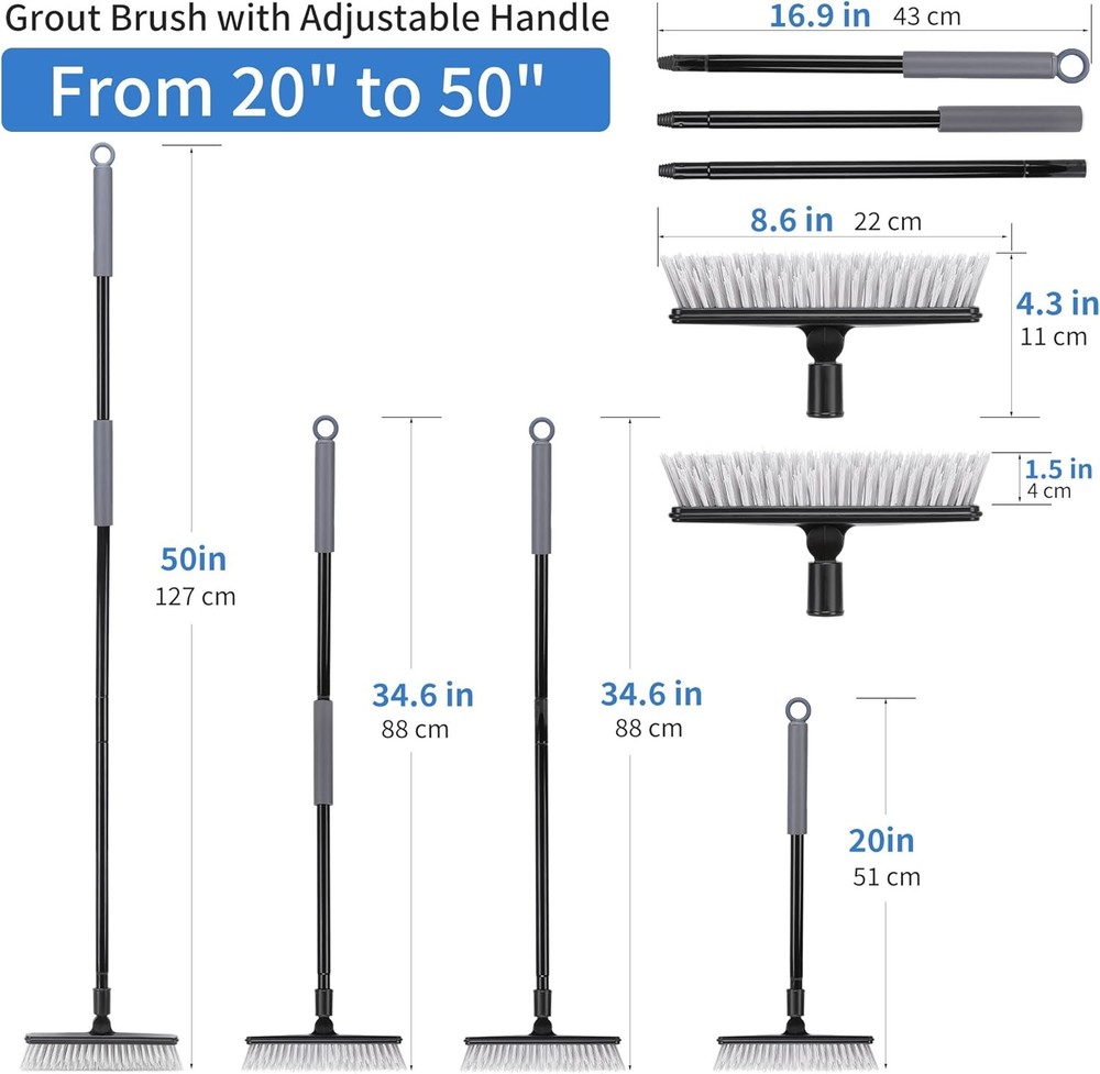 JEHONN 2 Pack Grout Brush with Long Handle 50 Inches, Swivel Floor Black Product Details Brand: JEHONN Color: Black Handle Material: Plastic Specific Uses For Product: Floor Product Dimensions: 17.24"L x 3.85"W x 2.28"H Material: Plastic, Metal Special Feature: Extendable, Hanging Hole Shape: Rectangular Included Components: Handle Surface Recommendation: Floor Number of Items: 1 Item Firmness Description: Hard Item Weight: 1.3 Pounds Manufacturer: JEHONN Unit Count: 1.0 Count Item Weight: 1.34 pounds Item model number: GB-01 2 Pcs V-Shape Grout Cleaning Brush: JEHONN V-shape stiff bristles grout scrub brush fits perfectly into grout lines, gaps, corners and window track. Tired of cleaning tough stains in gaps with toothbrush? This brush would be your best cleaning partner 180°Rotating Head: This grout brush for tile floors features with a 180° swivel grout scrubber head, which allows you to scrub away grimes and dirt from different angle with ease. Package comes with 2 packs of tile brush heads, you can replace for use 50 inches Long Handle: JEHONN shower broom includes 3 metal extension poles, can be extended from 20” to 50”. So you can stand upright for comfortable scrubbing instead of bending over to clean. It helps protect your waist and back from pains Multiple Application: This grout brush cleaner with long handle can tackle grimes and stubborn stains on grout, corners, gaps, window track, baseboards from kitchen, bathroom, shower, hallways, deck, patio, walls Bathroom Scrub Brush: JEHONN has committed to cleaning products for more than 10 years. Want to get a sparkingly clean house? Try this grout scrubber brush