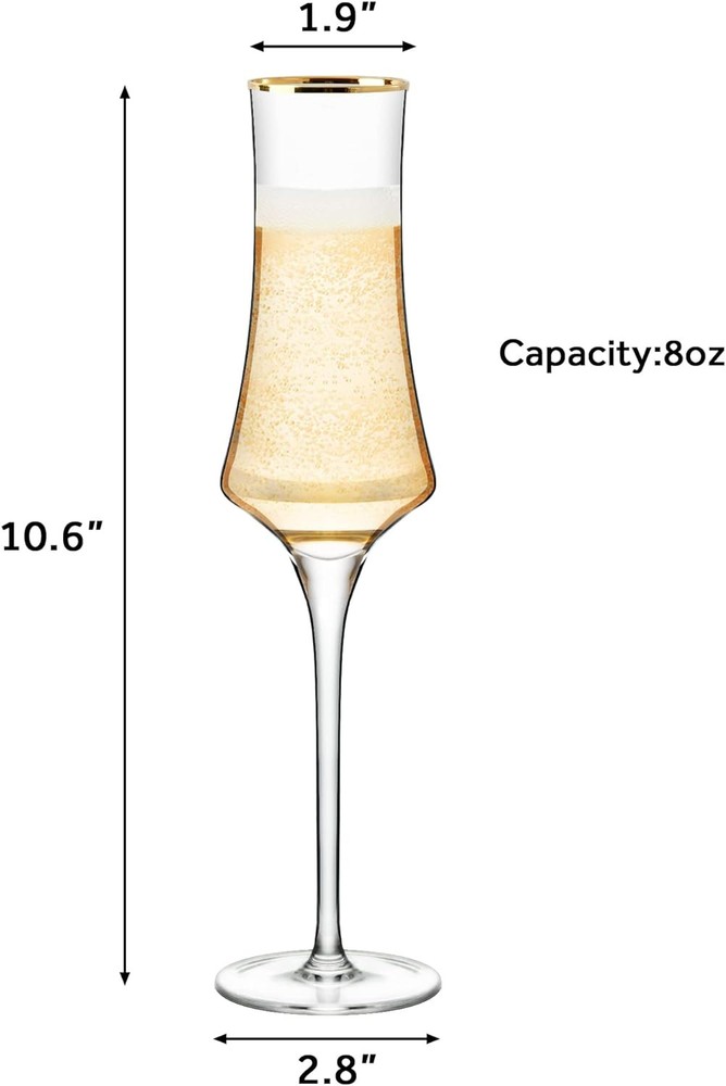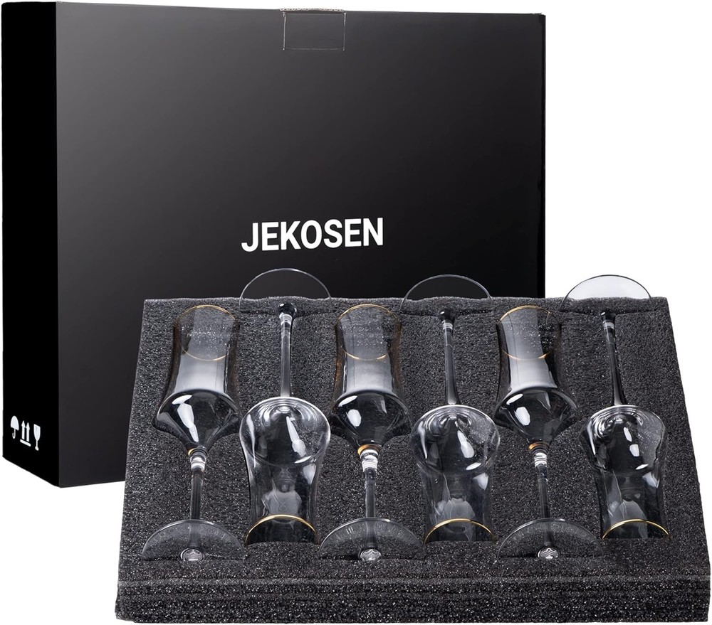 JEKOSEN NEW Champagne Flutes Glasses 8oz Set of 6 Clear Crystal Product Details Brand: JEKOSEN Color: Clear Special Feature: Dishwasher Friendly Style: Champagne-Set of 6-8oz Theme: Holiday Recommended Uses For Product: Home Included Components: Cups Specific Uses For Product: Celebratory Drinkware Shape: flute Pattern: Solid Product Care Instructions: Hand Wash Only Age Range (Description): Adult Material Feature: Recyclable Reusability: Reusable Unit Count: 6 Count Product Dimensions: 3.9"W x 12.8"H Material Type Free: Lead Free Number of Items: 6 Embellishment: Gold Rim Finish Type: Gold Rimmed Manufacturer: JEKOSEN Item Weight: 2.29 pounds Item model number: US--G2308-6pack MaterialCapacity: Glass8 ounces OccasionItem Weight: Wedding1.04 Kilograms Lead-Free: All Products Have Passed Test of SGS which is US FDA Report Shows that Goblet Glasses are Made of Non-lead Crystal With Gold Rim. The Perfect Gift For Celebrate life’s Most Memorable Moments with a Gift that Speaks for Itself – Weddings, Anniversaries, Mothers day, Fathers day, housewarming, or an Engagement Party. Laser Cutting: The Laser Cutting Glass Process Makes Uniform and Thin Rims On Red Wine Glasses, Improving Quality and Flavor of Wine. Comes in a Set of 6, Capacity of 8 ounces. Dishwasher Safe: Completely Dishwasher Safe, The Glasses will not Etch, Cloud or Discolor During the Life of the Glasses.