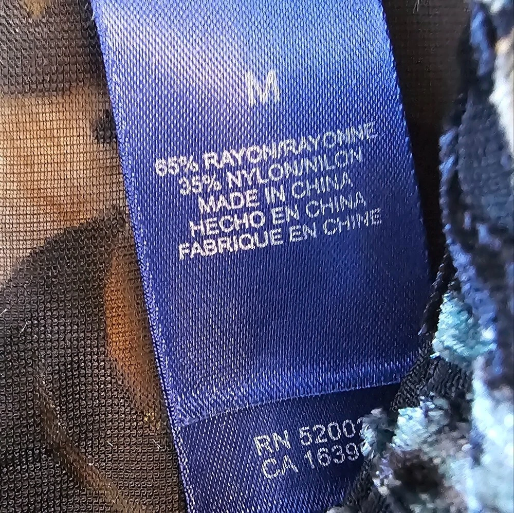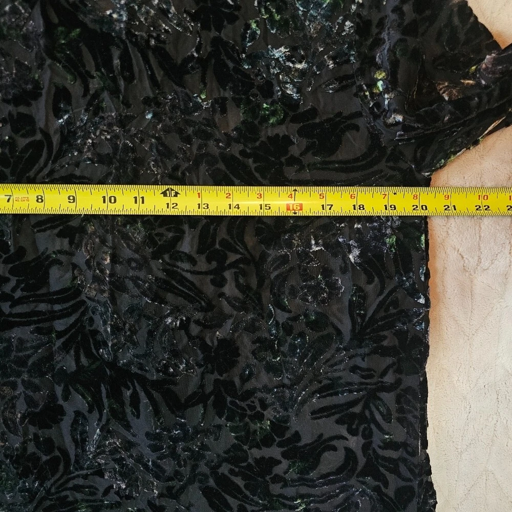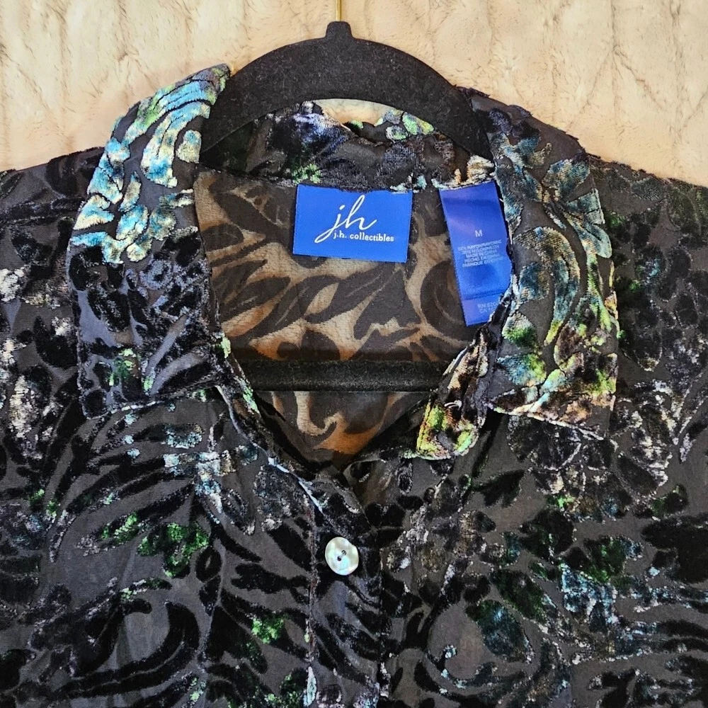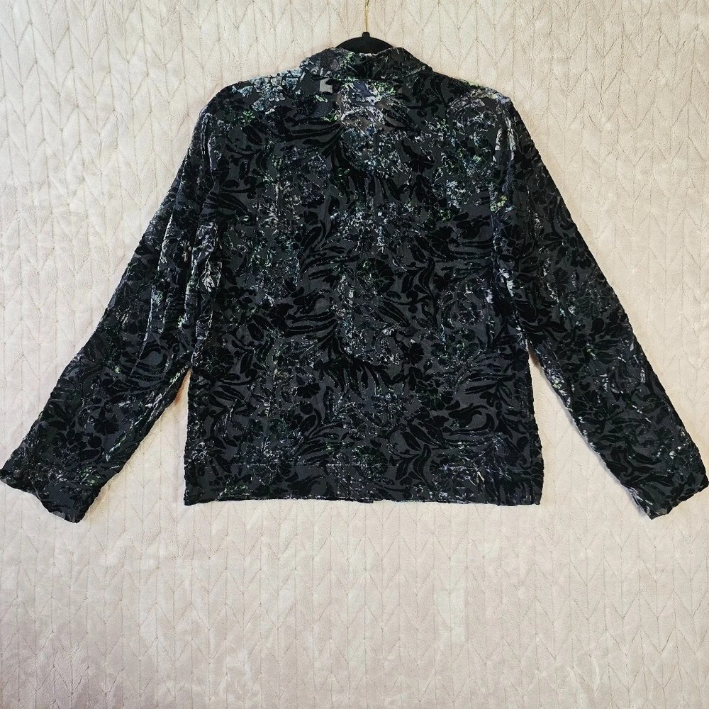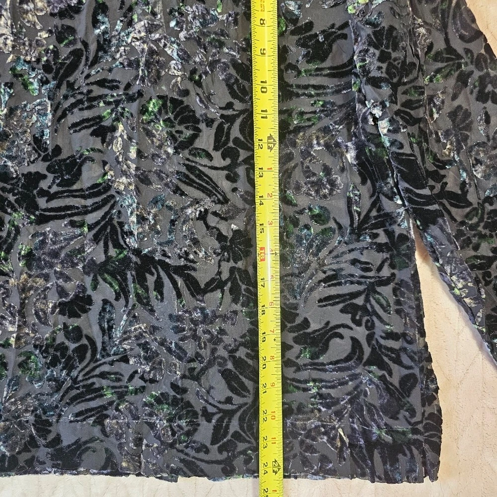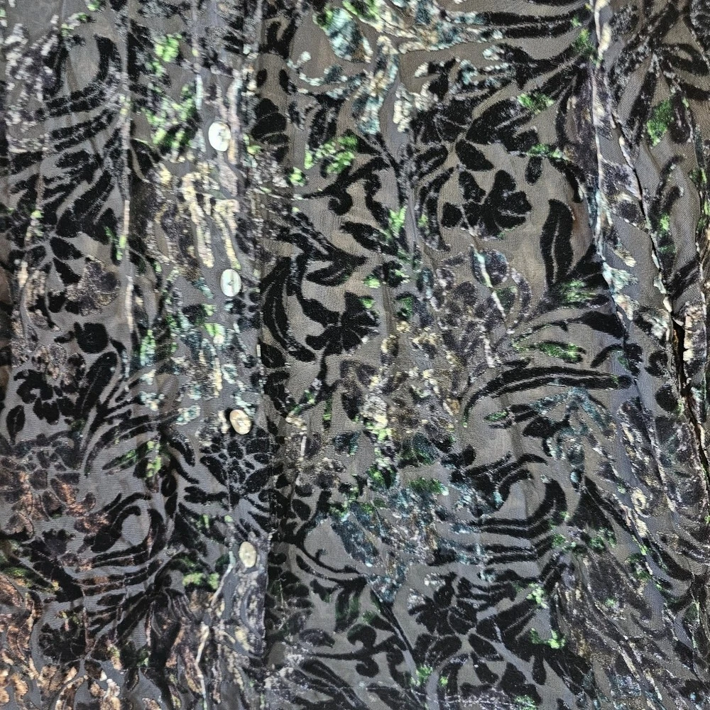 Beautiful sheer velvet burnout button down with mother of pearl buttons. Velvet is black in some areas and iridescent in others. In excellent pre owned condition, see photos for full details.