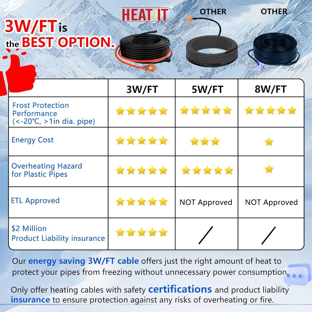 Menu Other Items Feedbacks About Us Contact Us Add To Favorites JHSF 40Ft Self-Regulating Heat Cable for Pipe Freeze Protection, Energy-Saving, Pipe Heat Tape for Metal and Plastic Home Supply Pipes, Keeps Water Flowing at -40°F, ETL Listed, 120V [Pipe Freeze Protection] Pipe Heating Cable, 3 W/ft, energy-efficient design. Safeguard your pipes and reduce electricity costs. Maintains water flow in temperatures as low as -40°F (-40°C). Includes a 2 Ft power cord and heating cable options ranging from 3 Ft to 160 Ft. This product is backed by up to USD 2 million in product liability insurance, providing you with added peace of mind and security in your purchase. [Compatible with Different Pipe Materials] Our water pipe heat cable is versatile, suitable for various pipe types. It works effectively with both metal and plastic water pipes, delivering reliable freeze protection across different materials. Whether it's copper, PVC, or stainless steel, our cable guarantees exceptional performance, ensuring your pipes remain secure and operational even in extreme weather conditions. [ETL Certified Safety] Our Self-Regulating Heating Cable is ETL certified, ensuring top-notch quality and safety. This certification confirms that our water line heat tape meets rigorous industry standards for performance and safety. Rest assured in the reliability of our pipe heat cables, providing exceptional freeze protection for your water pipes. Don't settle for less—choose a product that excels in both quality and safety. [High-Tech Self-regulating Heating Technology] Our water pipe heat tape features self-regulating technology, automatically adjusting heating power in response to ambient conditions, ensuring it never overheats or causes burns. This intelligent functionality optimizes energy usage, ensuring efficient and dependable pipe freeze protection. [Efficient Integrated Thermostat] Our pipe heat trace features a built-in thermostat, activating at 38℉(3℃) and deactivating at 50℉(10℃). This intelligent system regulates power output, operating only when needed for optimal energy efficiency. Rest assured, your water pipes are protected from freezing while minimizing energy usage. [Easy Installation and Versatile Length Range] Our pipe heat tape is designed for easy installation, with pre-installed features for user convenience. Whether straight, spiral, or overlap, it adapts effortlessly to your needs. Available in lengths from 3ft to 160ft, it offers versatile options for various applications, from residential to industrial. Product Description 1 Self-Regulating Tech 2 Automatic Thermostat 3 ETL Approved 1 Length Selection 2 Test Before Installation 3 Four Steps to Install HEATIT Pipe Freeze Protection Series You can Choose Add to Cart Add to Cart Add to Cart Add to Cart Add to Cart Add to Cart Add to Cart Customer Reviews 4.5 out of 5 stars 3,921 4.5 out of 5 stars 3,921 4.4 out of 5 stars 44 5.0 out of 5 stars 2 4.6 out of 5 stars 3,063 4.5 out of 5 stars 656 4.6 out of 5 stars 408 Price $22.99 $ 22 . 99 $29.99 $ 29 . 99 $28.99 $ 28 . 99 $13.99 $ 13 . 99 $14.99 $ 14 . 99 $34.89 $ 34 . 89 $45.99 $ 45 . 99 Output @ 50°F(10°C) 3W/FT 5W/FT 5W/FT 7W/FT 7W/FT 5W/FT 5W/FT Build-in Thermostat ✔ ✔ ✘ ✔ ✔ ✘ ✘ Application Pipe Freeze-protection Pipe Freeze-protection Pipe Protection/Roof De-icing Pipe Freeze-protection Pipe Freeze-protection Pipe Protection/Roof De-icing Pipe Protection/Roof De-icing Cable Structure Self regulating Self regulating Self regulating Regular (Constant wattage) Regular (Constant wattage) Self regulating Self regulating Certification ETL ETL ETL ETL,CSA ETL,CSA ETL ETL Cold Lead 2 Ft with Light Indicator Plug 3 Ft with Light Indicator Plug 6 Ft with Light Indicator Plug 3 Ft with Light Indicator Plug 2 Ft with Light Indicator Plug 3 Ft with Light Indicator Plug 3 Ft with Light Indicator Plug Heated Cable Length 3FT to 120FT 3FT to 160FT 2FT to 130FT 3FT to 30FT 3FT to 80FT 6FT to 150FT 6FT to 150FT Spiral,Wrap or Cross ✔ ✔ ✔ ✘ ✘ ✔ ✔ NON-water-filled Pipes ✔ ✔ ✔ ✘ ✘ ✔ ✔ Dimension Width: 0.32"| Thickness: 0.22" Width: 0.32"| Thickness: 0.22" Width: 0.32"| Thickness: 0.22" Width: 0.49"| Thickness: 0.2" Width: 0.31"| Thickness: 0.21" Width: 0.32"| Thickness: 0.22" Width: 0.3"| Thickness: 0.2" Item Specification Item model number 40 ft Part Number 6947881590234 Style 40 ft Mounting Type Ceiling Mount Item Package Quantity 1 Color Black Material Type 3W/FT Product Dimensions 22 x 4 x 4 inches Material 3W/FT Country of Origin China Batteries Required? No Item Weight 2.2 pounds Batteries Included? No Special Features Durable Size 40 ft Is Discontinued By Manufacturer No Included Components 1 Dimensions Shipping Returns Additional Info Product Dimensions: 4.0 inches x 22.0 inches x 4.0 inches. Weight: 2.2 lb Fast shipping is very important for us. Our standard shipping service is FREE. Your order will be shipped within 1-3 business days upon full payment received. Most items are delivered within 3-5 business days, however, please allow 3-10 business days. We are shipping only to USA. We only ship to the confirmed Paypal address. We reserve the right to cancel any order for any reason at any time. We are not responsible for undeliverable addresses. We offer a 30 day return policy from checkout winning date. Your satisfaction is guaranteed! If for any reason you are unhappy with your item, just return it within 30 days for a full refund, minus shipping cost. Please contact us prior to initiating a return so that we can issue you a refund authorization. Items defective upon receipt must be packaged in their retail packaging as if new and returned with a detailed description of the problem. Return shipping fees are not refundable. We reserve the right to decline any returns if the above guidelines are not followed. All of our items, unless otherwise stated, will only run on 120 volts. Please check to make sure your country complies with these speci