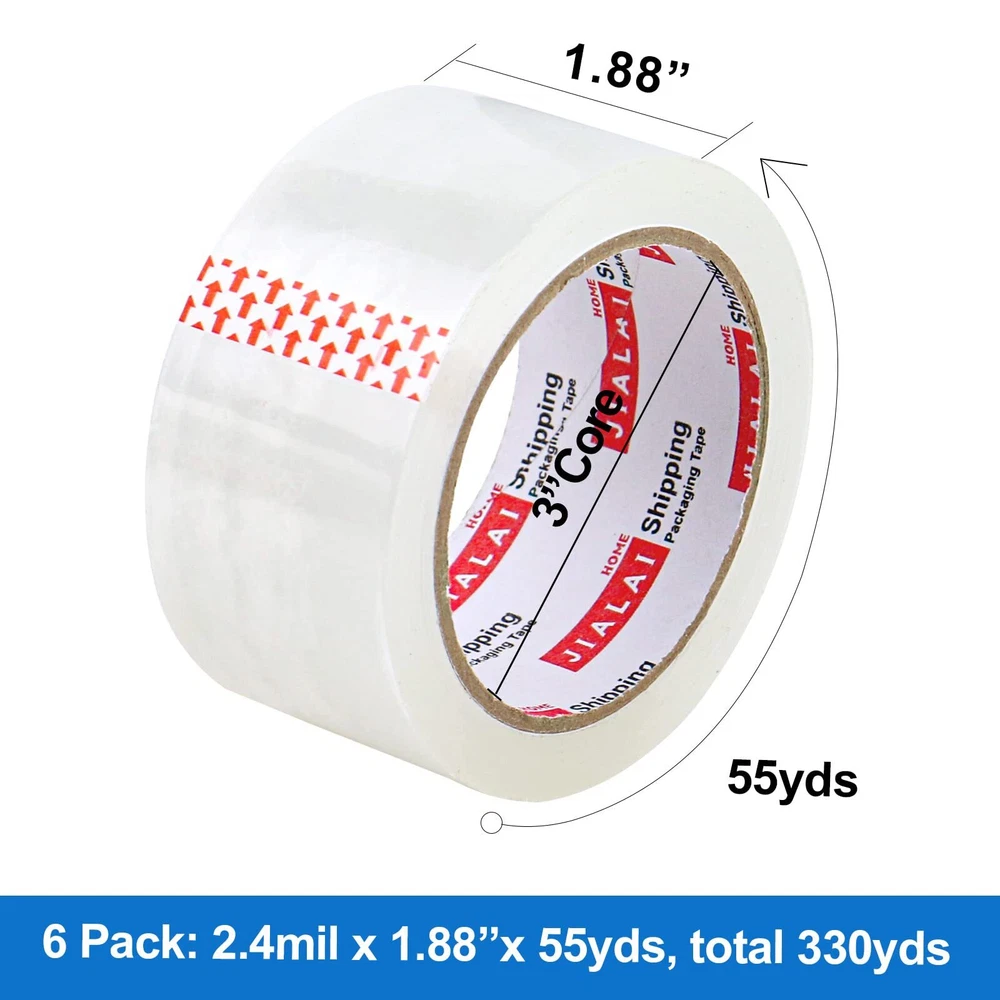 PREMIUM QUALITY:2.4 Mil thick, each roll includes 1.88 inches x 55 yards . Clear tape with strong adhesive that will adhere to your boxes for months and keep your contents safe STANDARD SIZE:The heavy duty packaging tape can be used with any tape guns and hand held tape dispenser with a 3 inch core MULTI PURPOSE:Tape can be used on a variety of surfaces and items. Perfect for all your moving, shipping and storage needs EASY TO USE: Transparent packing tape has strong tenslie stretch, will not split out rip during application and will not peal off, use with easily and save your packing time TAPE DISPENSER:Packaging tape refill rolls with a simple 3inch cutter, can help us work better and more convenient