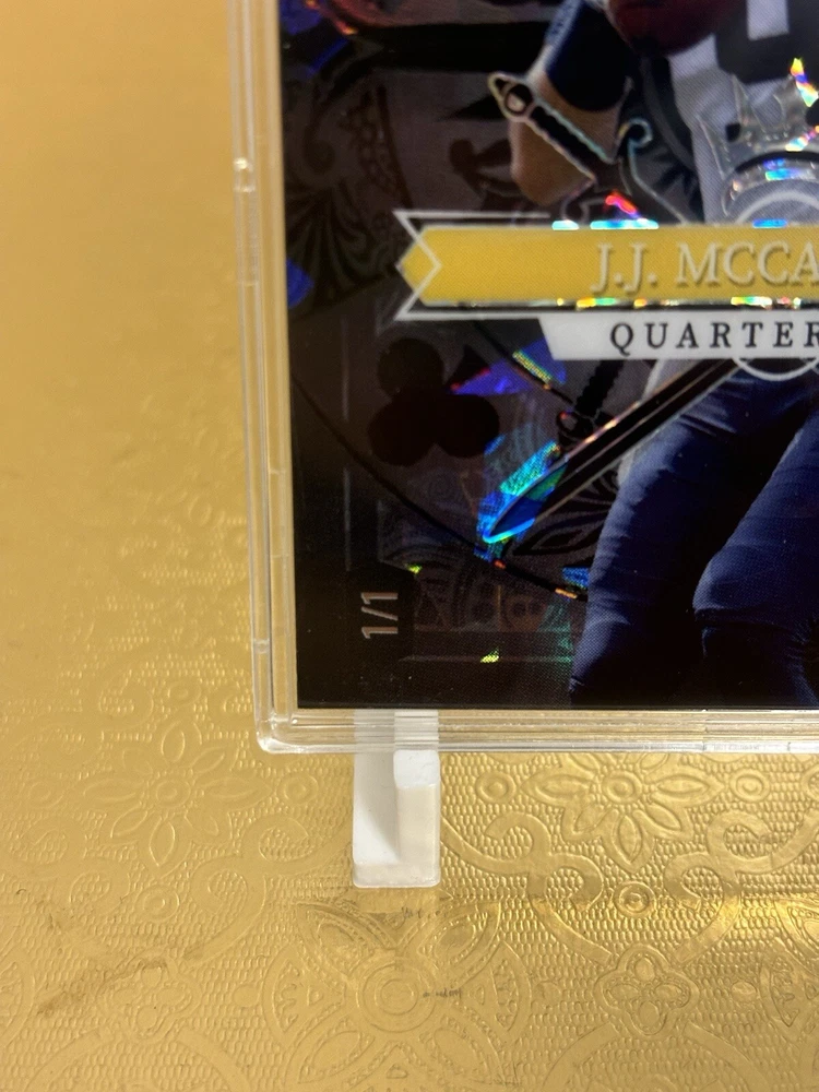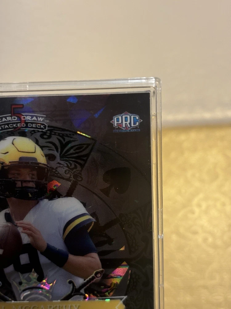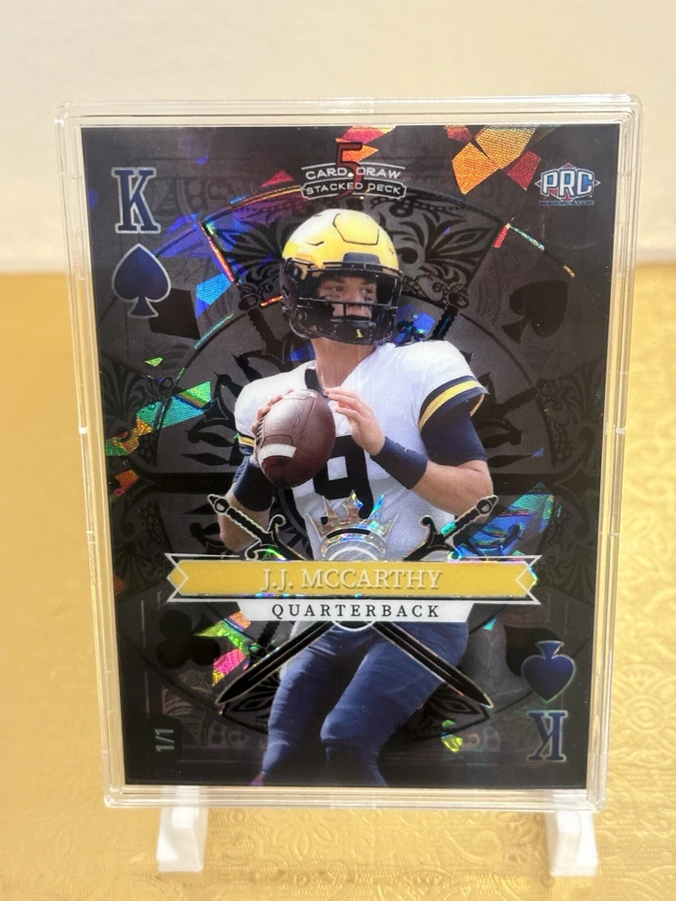 This J.J. McCarthy RC trading card is a must-have for any avid collector. The card features a stacked deck design with a black Ice parallel variety, and is serial numbered as a short print rookie card. This 5 card draw card is from the Wild Card manufacturer, and is part of the National Collegiate Athletic Association (NCAA) and National Football League (NFL) leagues. The card is printed in 2023 and features the University of Michigan and Minnesota Vikings teams. With a print run of only 1, this card is a rare find for any fan of J.J. McCarthy or football in general. Don't miss out on the opportunity to add this unique sports trading card to your collection