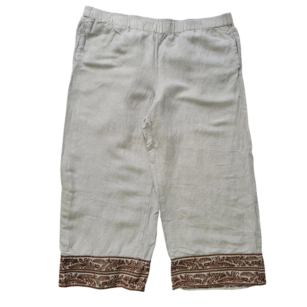 J.Jill Size L Linen Blend Embroidered Hem Wide Leg Pants Pull On Off White Brown Off-white / cream color pull on casual pants from J.Jill Decorative brown leaf embroidery detail on ankle hems Elastic Waist Pockets Wide Leg Cropped -Materials: 57% Linen, 43% Rayon -Excellent, pre-owned condition. No visible stains, flaws or tears. No to minimal signs of previous wear. Measurements included in photos - please inquire if more are needed. All offers considered - make one today! Approximate Measurements: Waist: 32" Rise: 10" Inseam: 22"