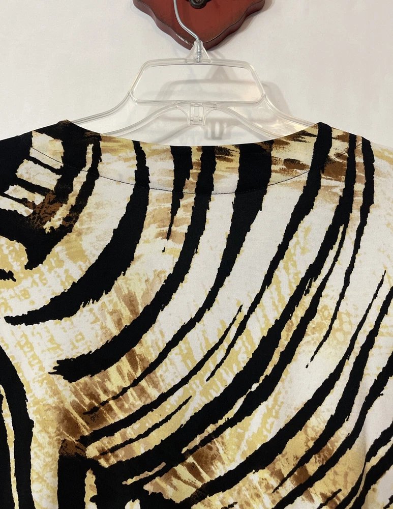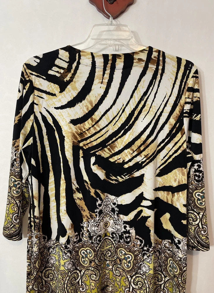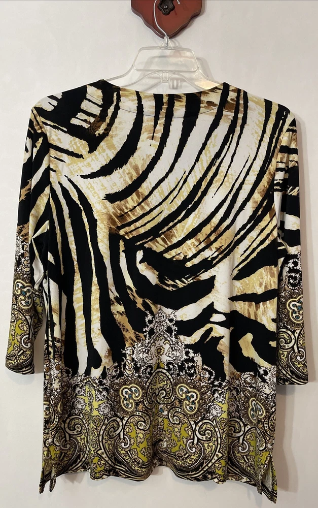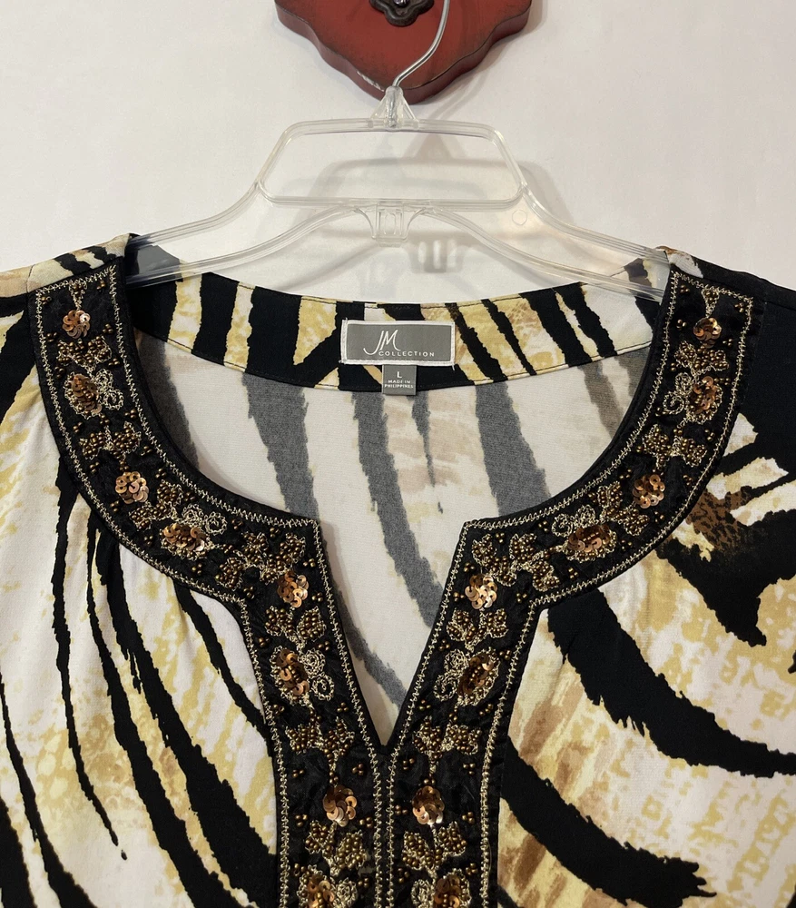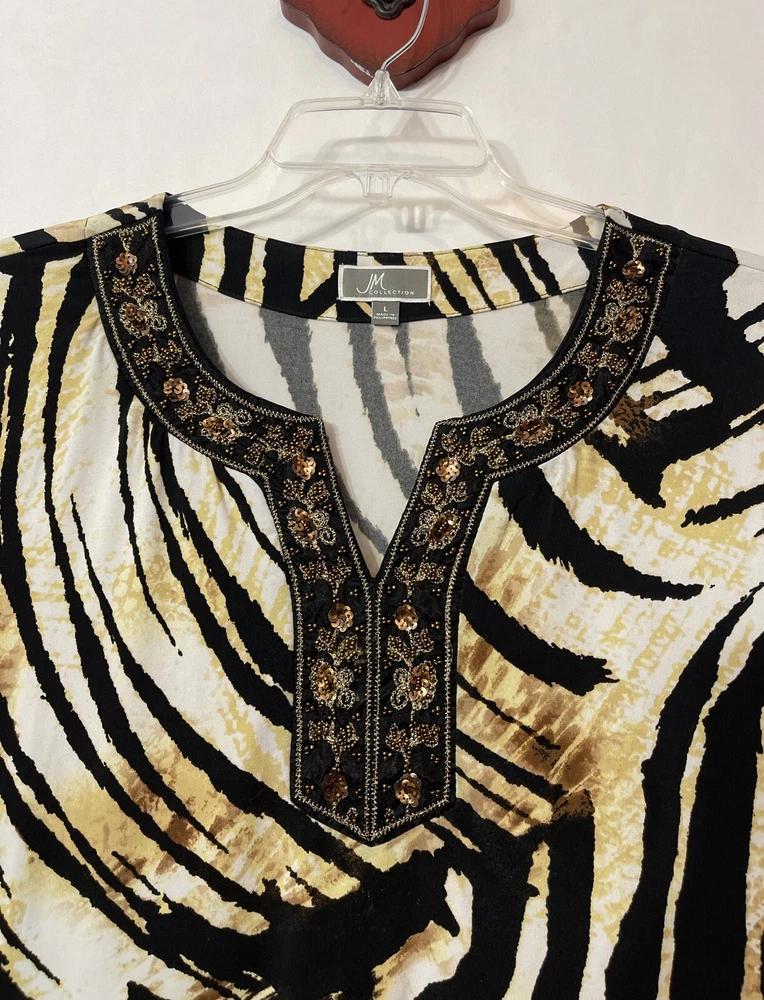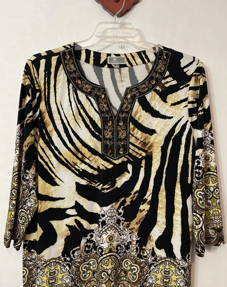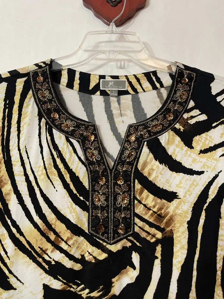 JM Collection presents a stylish Women's Brown Animal Print V-Neck Tunic Blouse in size Large. The blouse features a lively multicolor animal print, a comfortable 3/4 casual sleeve, and a flattering V-neckline. It is crafted from a soft blend of polyester and spandex, making it stretchy and comfortable to wear. The blouse is accented with beaded and rhinestone embellishments, adding a touch of glamour to the overall design. This easy-care top is suitable for all seasons and can be paired with different bottoms to create various looks. Length: 29 inches. Chest: 21 inches across laying flat.