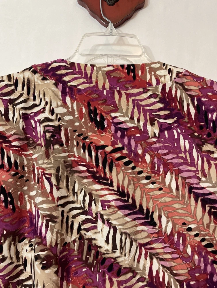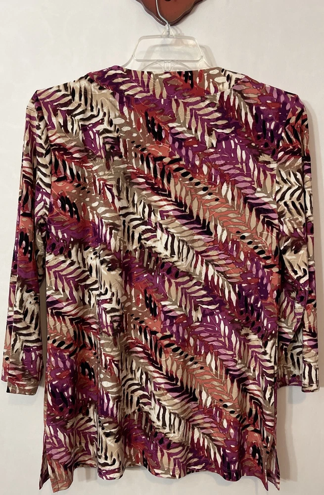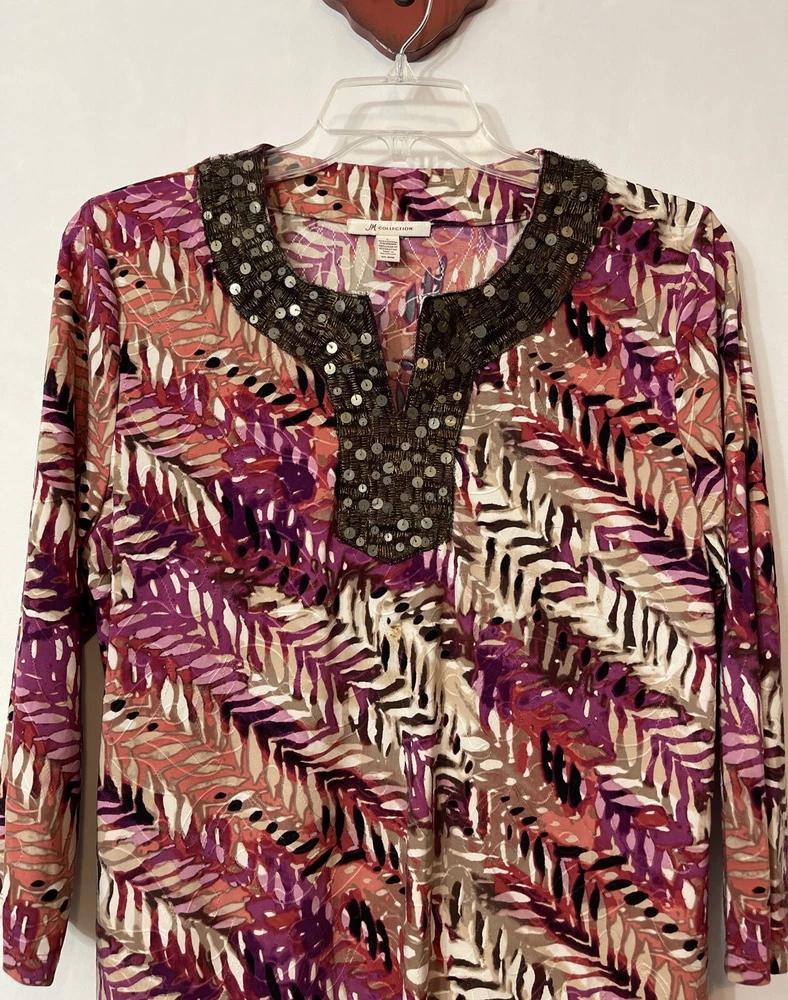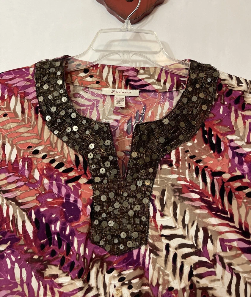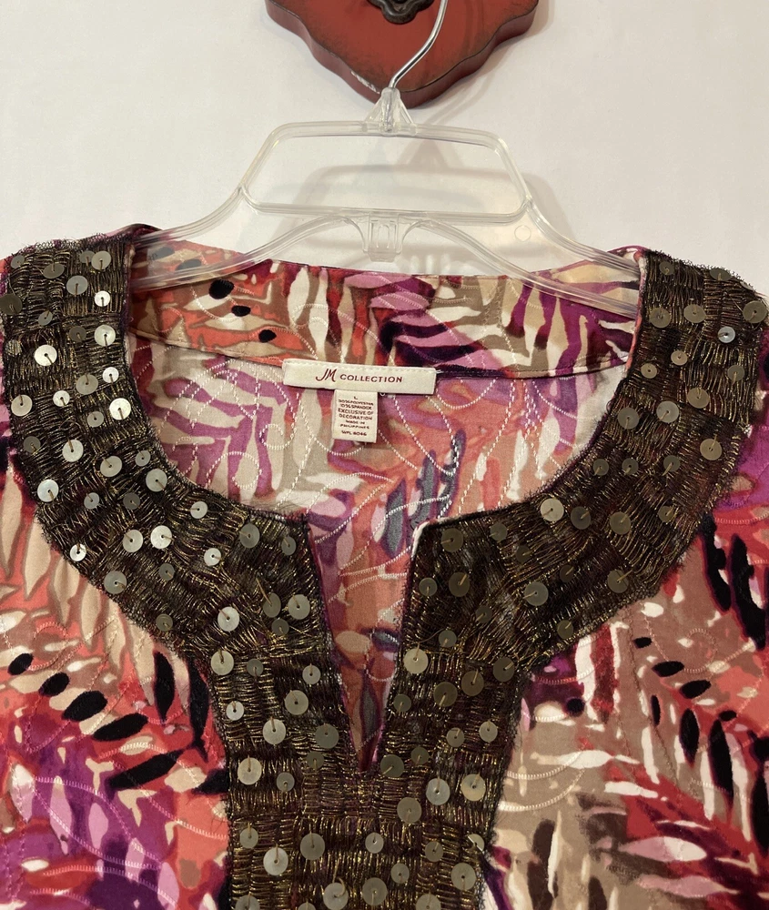 Elevate your wardrobe with the JM Collection Women's Large V-Neck Sequined Tunic-Style Blouse. The blouse features a stunning multicolor striped pattern with embroidered accents and sequin details, adding a touch of glamour to any outfit. The 3/4 sleeves and V-neckline create a classic and timeless look, while the polyester and spandex material provides a comfortable and stretchy fit. This tunic-style blouse is perfect for any season, with its collarless design and all-season features. The blouse is a great addition to any collection, and it will surely become a favorite. Length: 28 inches. Chest: 20 inches across laying flat.