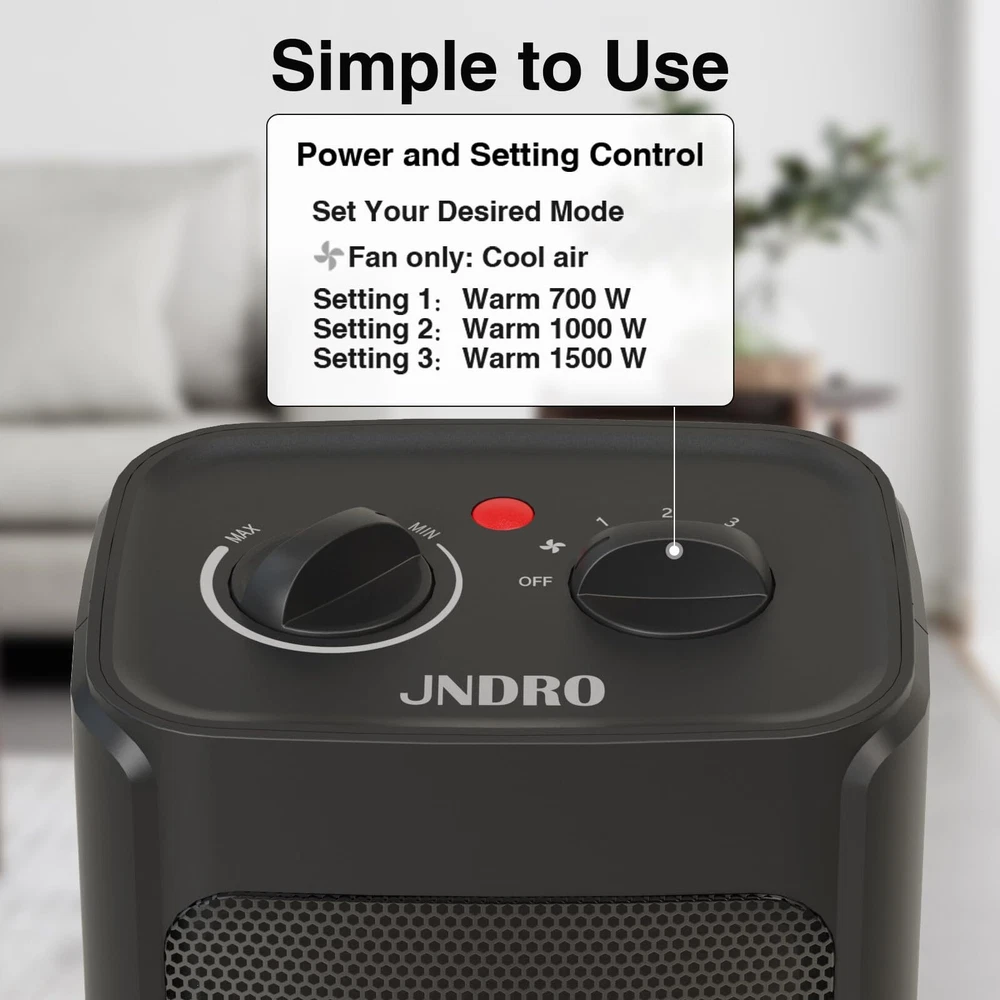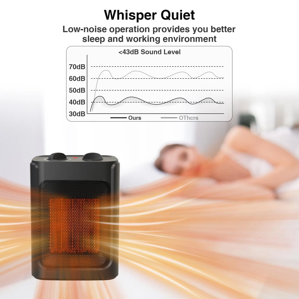 2 in 1 Heater and Air Fan:The small heater offers two heat settings, 1500W or 750W, along with a cooling fan function, making it usable in both winter and summer. The heater's thermostat control automatically shuts off the heating element when the preset temperature is reached, and it reactivates the heater when the temperature falls below the thermostat setting. Multiple Safety Protections:The space heater is constructed from flame-resistant materials, utilizing an upgraded version of ABS material that enhances flame resistance, effectively mitigating any risk of fire hazard. The Overheat Protection feature automatically shuts down the heater when it reaches a critical temperature. The tip-over protection system also deactivates the heater if accidentally tipped over; upon righting the heater, it resumes operation. Compact and Portable:The heater for indoor use measures 6.2 inches x 7 inches x 10.2 inches and weighs 2.9 pounds. It comes with a 6-foot power extension cord and an integrated handle, allowing convenient mobility for use in offices, rooms, and on desks. The mini heater is designed to heat up 200 square feet. Quiet and Rapid Heating:The portable heater operates with noise levels below 46 decibels, ensuring a tranquil environment suitable for most individuals to use while sleeping in bedrooms. Employing PTC ceramic heating technology and a high-speed fan, this heater is capable of emitting substantial heat within seconds, rapidly warming spaces of up to 200 square feet. After Sale Service:ETL Certified, Our friendly and reliable customer service will respond to you within 24 hours. You can purchase with confidence, with our 30-day return and 12-month replacement.