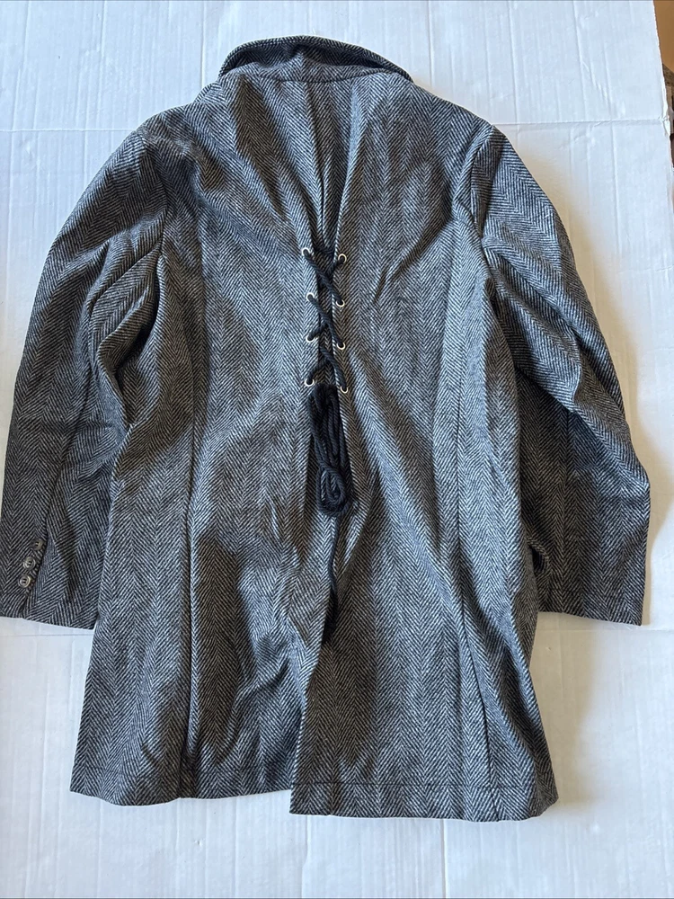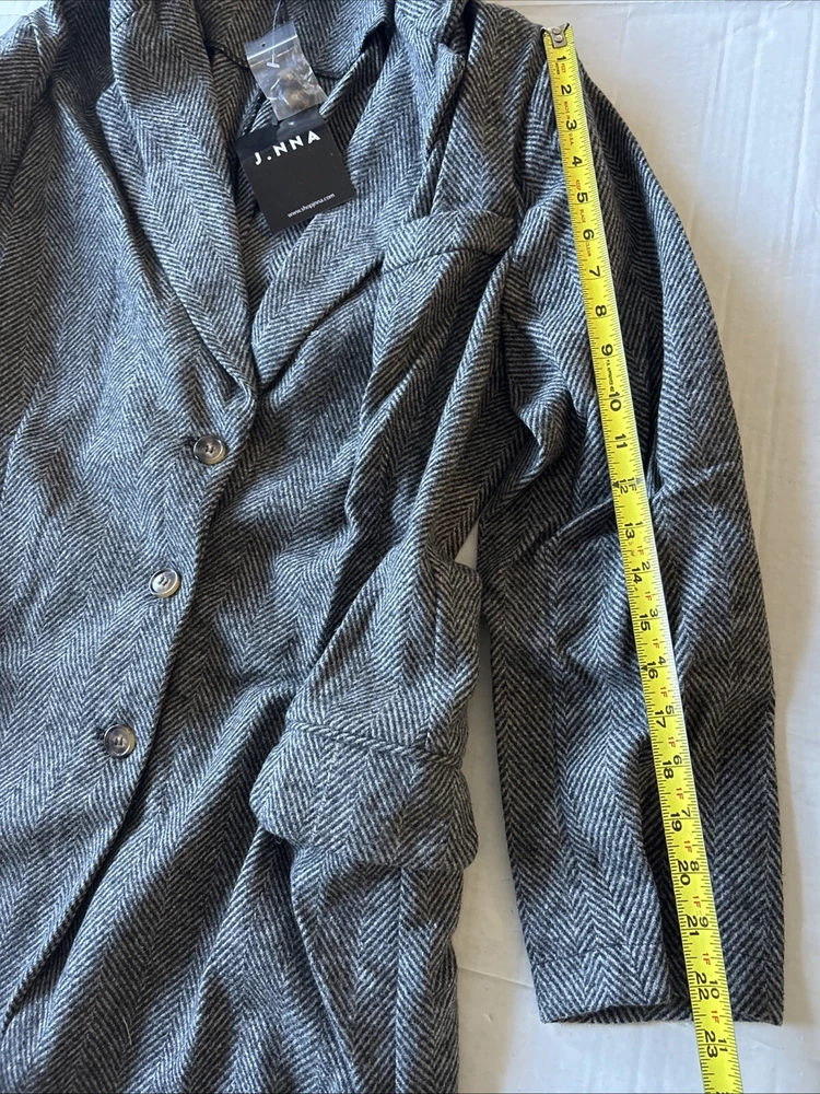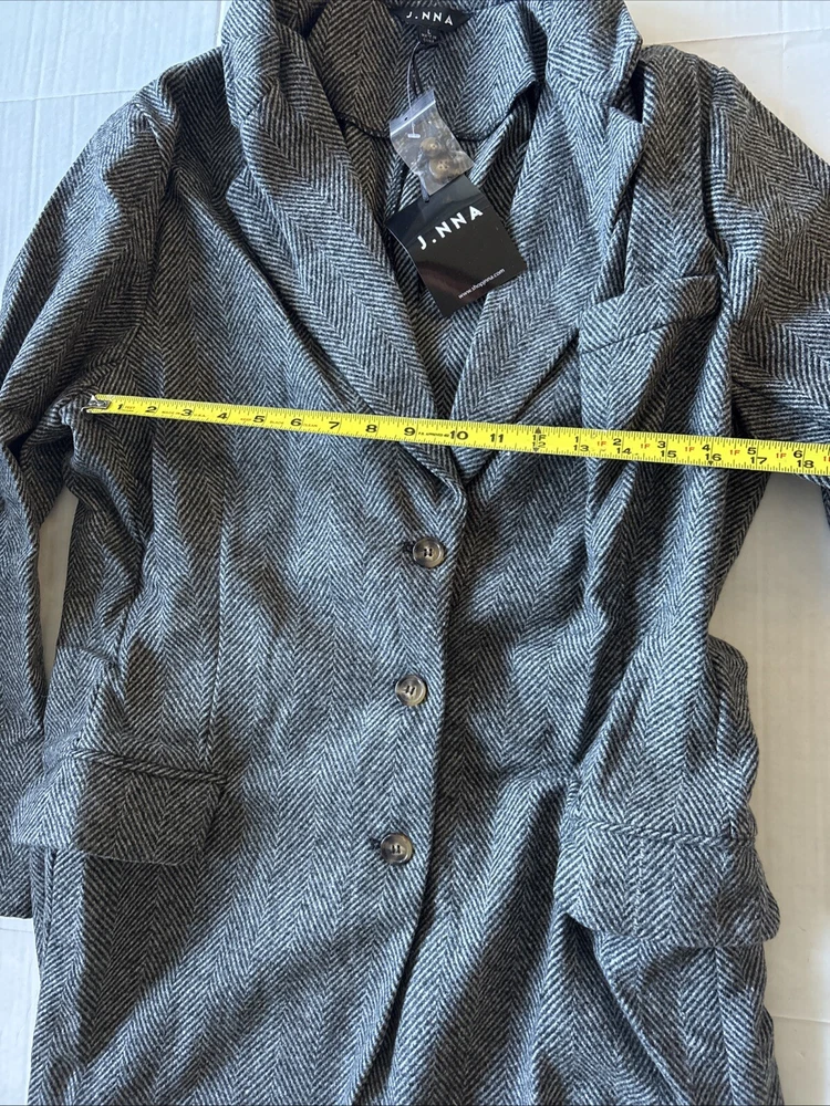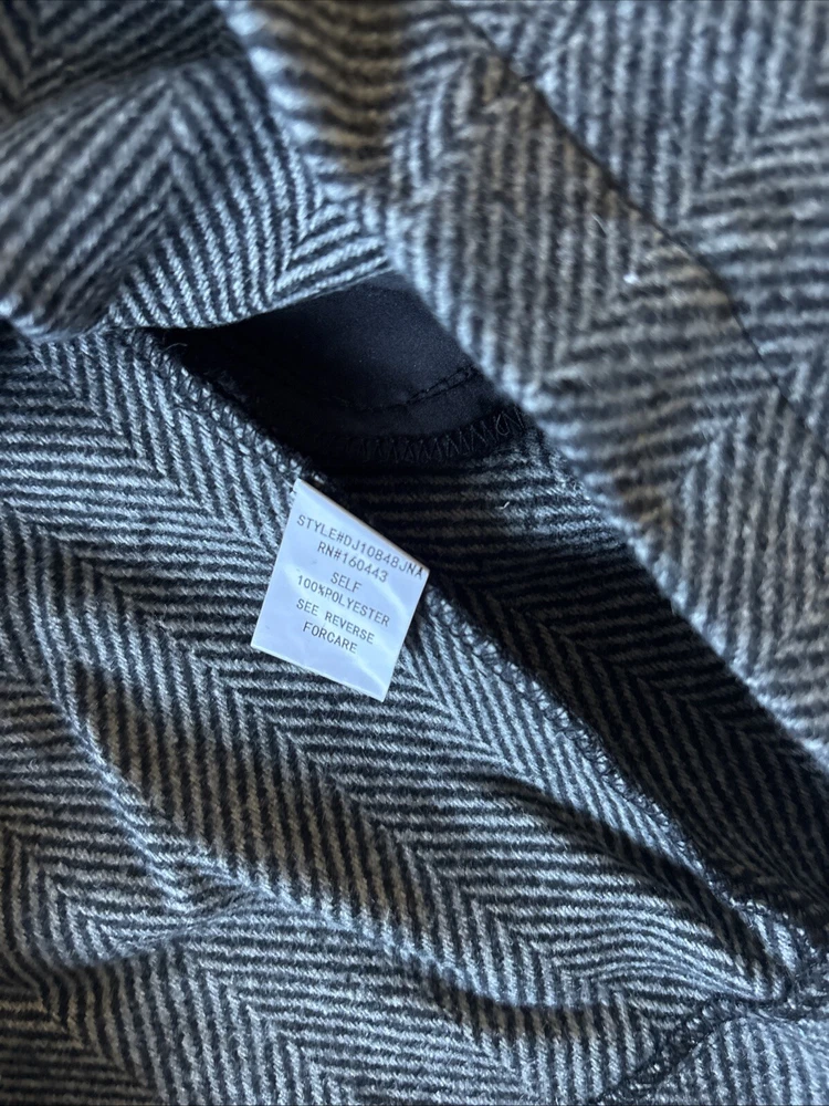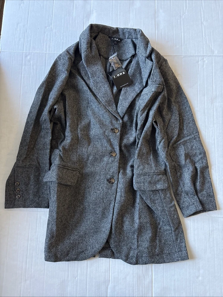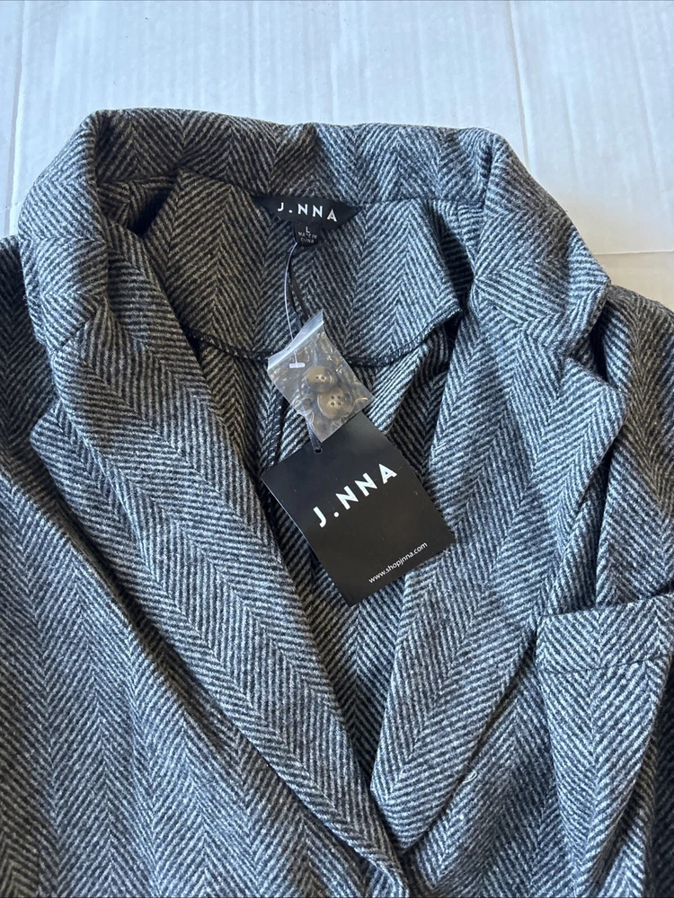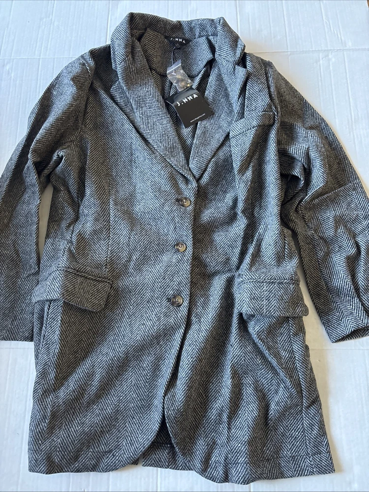 This J.NNA overcoat is a stylish addition to your winter wardrobe. The herringbone pattern on the gray Polyester outer shell material is eye-catching, and the tie closure adds a touch of elegance. The jacket features pockets for convenience and a tie-back detail that enhances the overall look. The lining is also made of Polyester, ensuring that the coat is warm and comfortable to wear. The jacket is perfect for the fall and winter seasons and is available in a size L. The star theme adds a unique touch to the coat, making it stand out from other overcoats. This J.NNA coat is a must-have for any fashion-forward woman who wants to stay warm and stylish during the colder months.