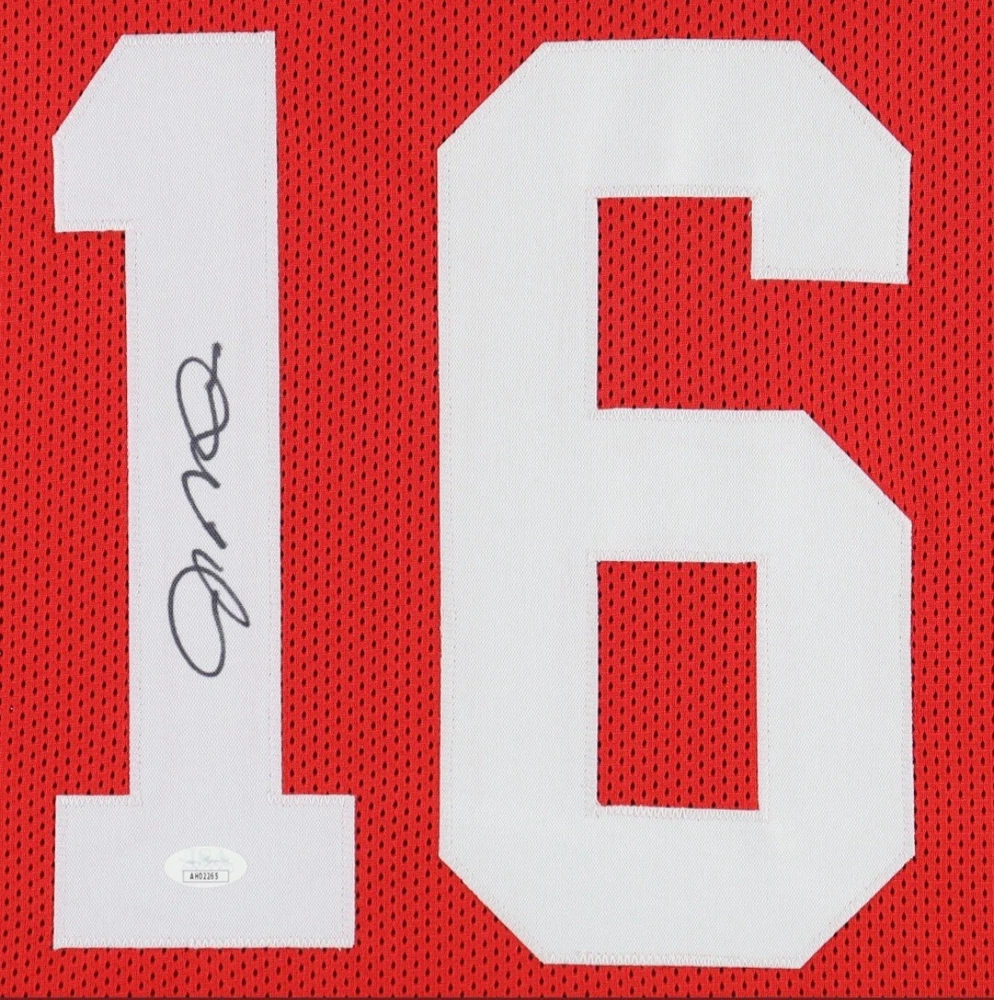 JOE MONTANA (49ers red ) Signed Autographed Framed Jersey JSA