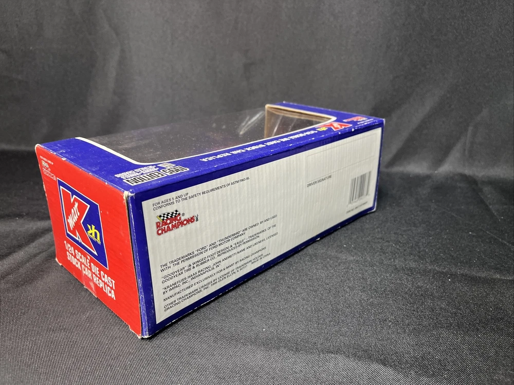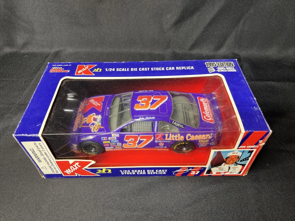 This is a 1:24 scale diecast model of a 1995 Ford Thunderbird #37 car driven by John Andretti for Little Caesars in NASCAR. The Racing Champions manufactured car is multi-colored and features the Cars character family. It is not autographed and is a collectible bank. Used-packing may show signs of wear. SB