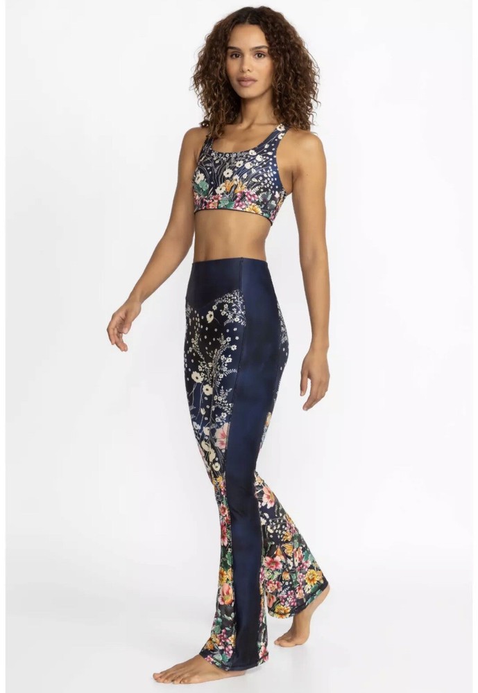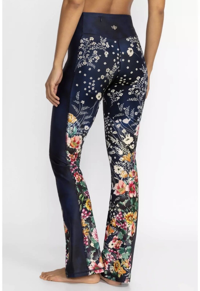 These Johnny Was Size-S leggings feature a floral pattern in multicolor. The high-rise waist and flared leg design provide comfort and style, making them suitable for travel, activewear, and casual occasions. Made of polyester blend fabric, these leggings have a waist size of 26 inches and inseam of 31 inches. They offer stretch, pockets, and are ideal for activities like cycling, yoga, and running.