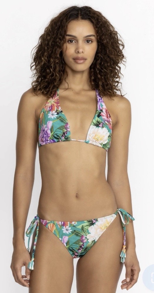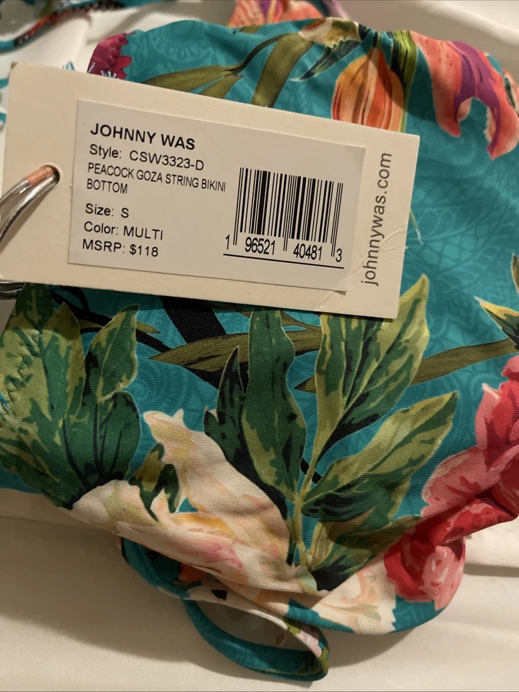 The JOHNNY WAS Size-S Peacock Goza String Bikini Top and Bottom Set is a stylish and colorful 2-piece bikini set designed for women. The geometric pattern, spaghetti strap top, and multicolor design give it a unique and vibrant look perfect for beach days or poolside lounging. The set includes a bikini top with removable pads, a built-in brief, and an adjustable strap for a comfortable fit. The lightweight and quick-drying material ensures you stay comfortable and dry while enjoying the sun and water. Perfect for those who love a tropical, goddess-inspired style.