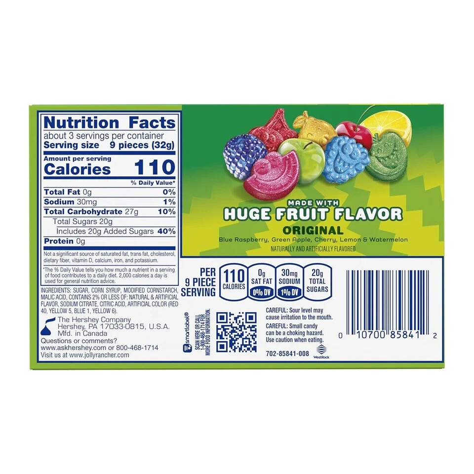 JOLLY RANCHER Sour Gummies Assorted Fruit Flavored 3.5 Ounce (Pack of 1) Product Details Product Dimensions : 1 x 6 x 3.75 inches; 3.84 ounces Item model number : 00010700858412 UPC : 010700858412 Manufacturer : HERSHEY COMPANY Units : 3.5 Ounce Brand: Jolly Rancher Flavor: Assorted Fruit Flavored Item Form: Gummy Unit Count: 3.5 Ounce Number of Items: 1 Contains one (1) 3.5-ounce box of JOLLY RANCHER Sour Gummies Assorted Fruit Flavored Candy Soft and chewy gummy candies bursting with sweet, sour original fruity flavors like watermelon, green apple, cherry, lemon and blue raspberry for snack time at home, at work and on the road An exciting assortment of chewy gummies candy in a movie box ready to satisfy your snacking needs and keep each deliciously sour piece fresh Bring a shareable box of delectably sweet and sour gummy treats to birthday parties, New Year's bashes, wedding celebrations and baby shower candy buffets An unbelievably delicious gummy selection featuring bold colors and even bolder fruit flavors to brighten up your Valentine's Day, Christmas, Halloween and Easter candy selections A mix of five fruity favorites for the whole family in just one box of chewy gummies? You wouldn't have thought it possible if you didn't know JOLLY RANCHER gummies candy. This box of sour fruit flavored gummies offers fun, flavorful fruity shapes each member of the family will be happy to choose from. Featuring blue raspberry, green apple, cherry, lemon and watermelon flavors, JOLLY RANCHER sour gummies offer a combination of the undisputed original flavor classics you already know and love.