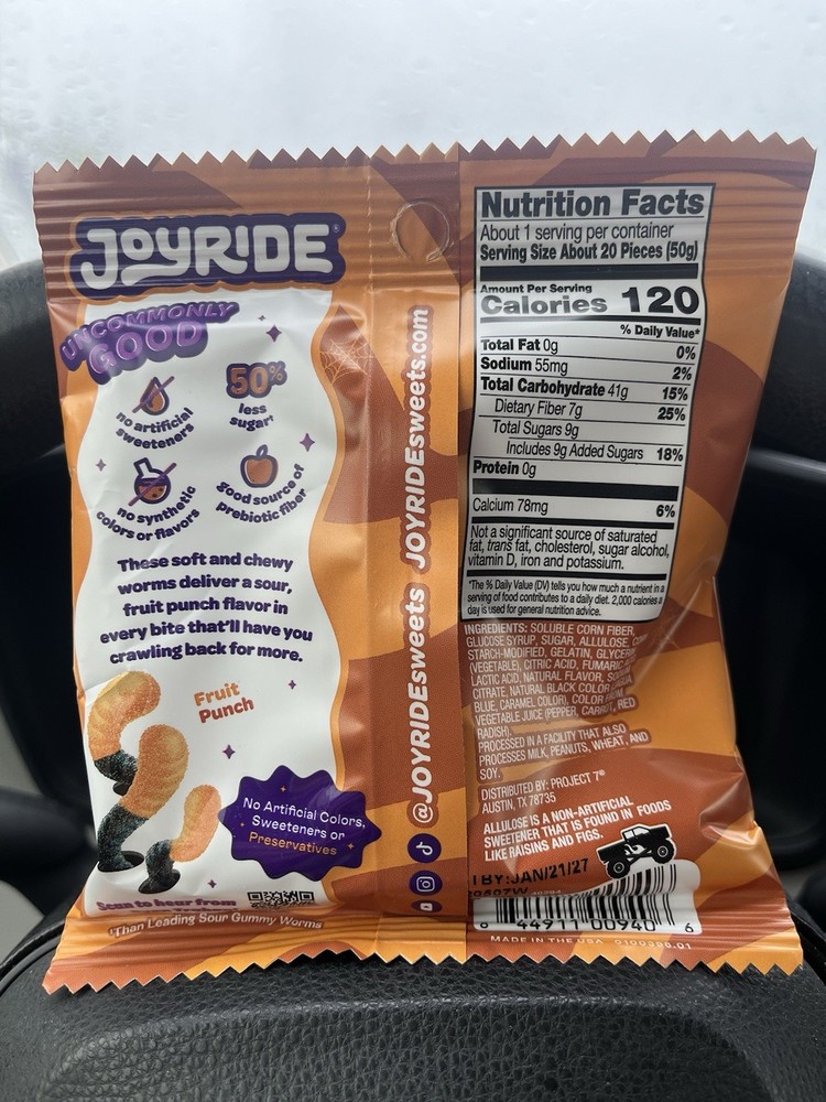 Type:GummyForm:StripsPackaging:BagFood Aisle:PantryState of Readiness:Ready to EatProduct:CandyAllergens:Wheat CoconutBrand:JOYRIDECalories per Serving:70Serving Size:32 GramsNet weight:3.5 OuncesExpiration Date:November 12 2026Package Quantity:1Number of Servings:3Contains:Wheat
