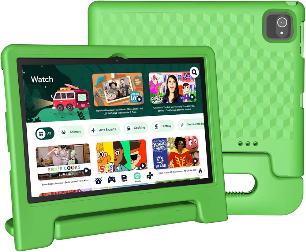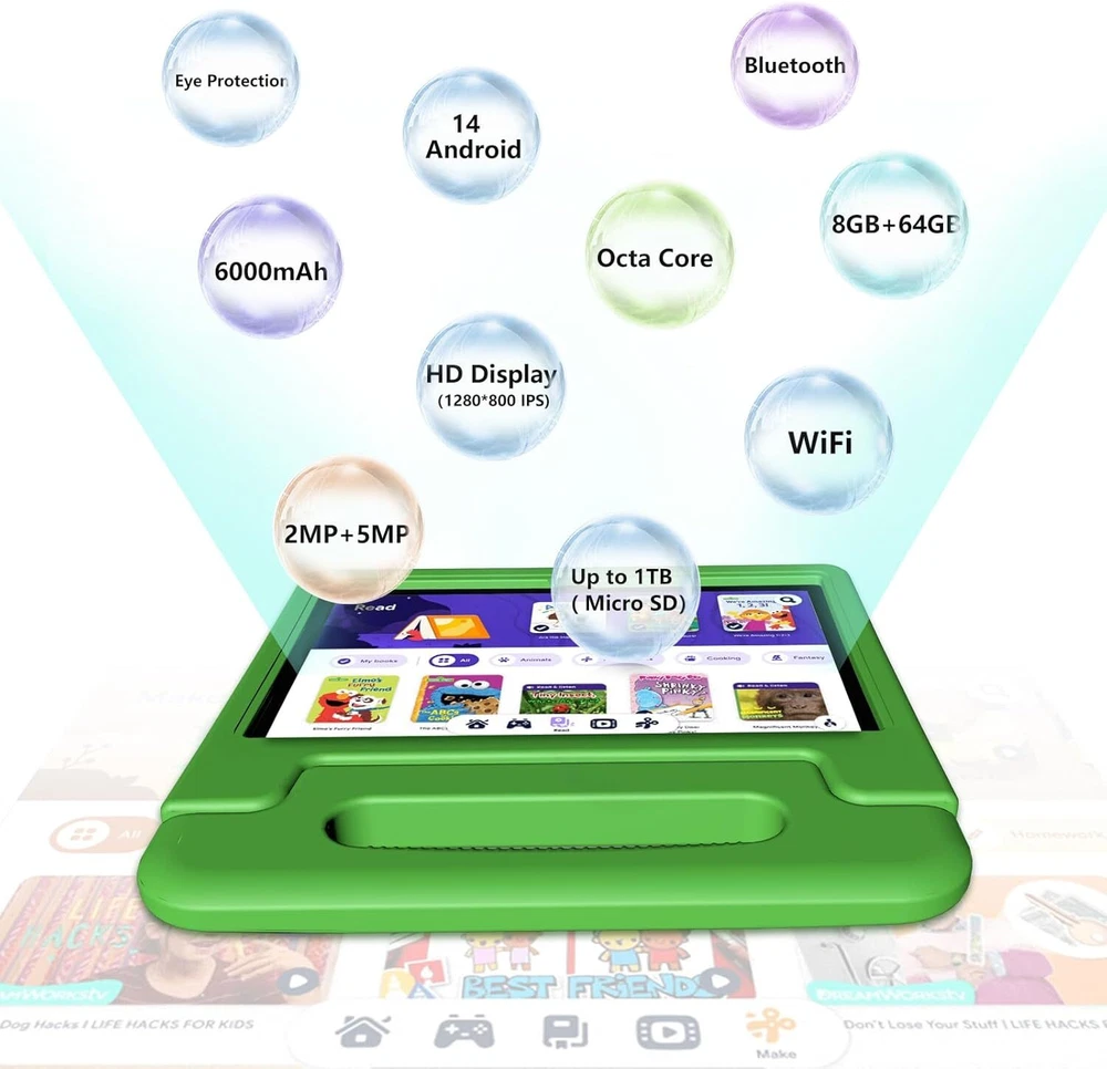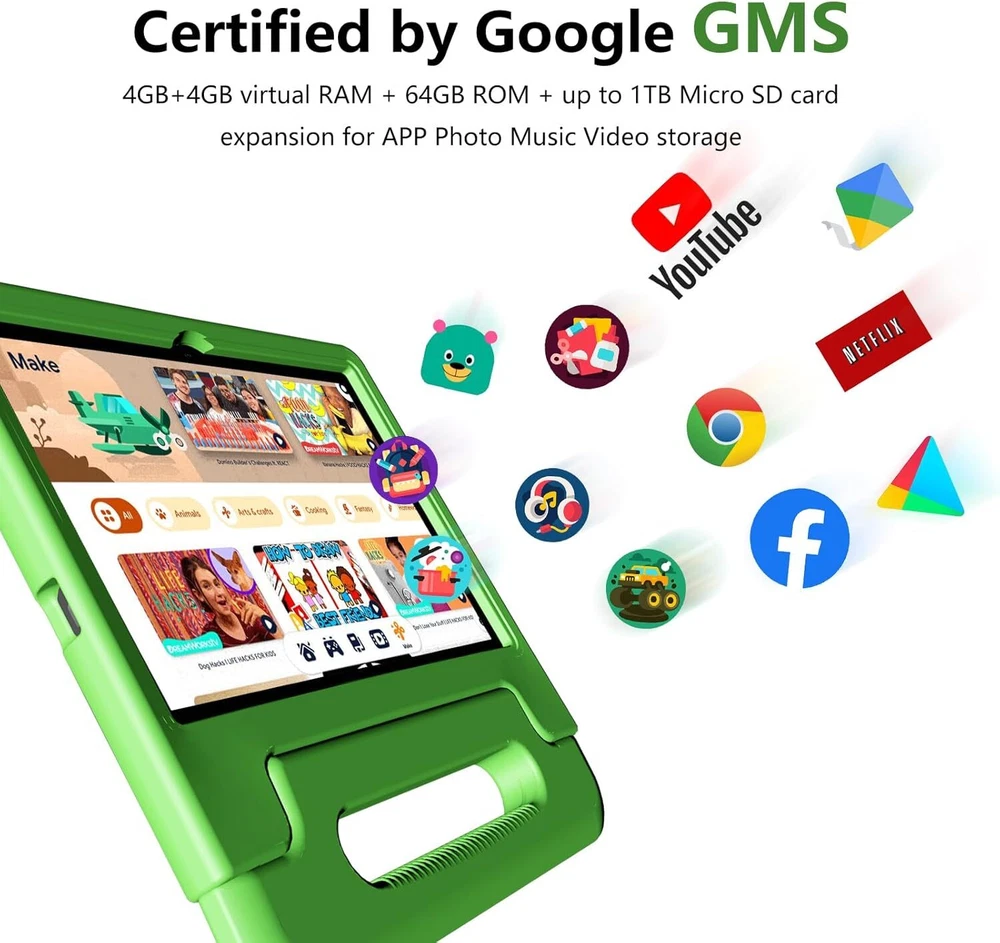 JREN Kids Tablet 10.1 inch Tablet for Kids, Toddler Tablet 8GB+64GB Android 14 Parental Control, 1TB Expand, HD Touchscreen, WiFi, Bluetooth, Protective Case for Kids Learning Tablet - Green Product Details Standing screen display size: 10 Inches Screen Resolution: 1280 x 800 pixels Max Screen Resolution: 1280*800 Pixels Card Description: Integrated Wireless Type: 802.11n Average Battery Life (in hours): 8 Hours Brand: JREN Model Name: J10 Plus Memory Storage Capacity: 64 GB Screen Size: 10 Inches Display Resolution Maximum: 1280*800 Pixels 【Android 14.0 Kids Tablet】 JREN 10.1 inch kids tablet comes with 8GB RAM (4G+4G Virtual) and 64GB ROM, you also can expand the storage to 1TB via the additional SD card, provide enough storage to store all your kids' favorite apps, games, photos, music and videos. Android 14 operation system and octa-core processor enable JREN kids tablet response quickly, combine with 1280*800 IPS HD touch screen let your kids enjoy smooth and vivid tablet using experience. 【GMS Certified & Parental Control Tablet】 JREN tablet for kids is certified by Google GMS, giving full access to popular Google service and apps. It’s pre-installed with Google Kids Space that designed for children over 3 years old, which can meet the diverse children’s learning and entertainment needs. Easy-to-use parental controls allow you filter content, set screen time, APP download permission and track the location, which create a safe online playing and learning environment for kids. 【Long Battery Life Tablet】With built in 6000mAh lithium battery, JREN 10.1 inch kids tablet can support up to 12 hours of reading, watching and listening. It’s an ideal educational and entertainment tablet for kids. Featuring fast charging technology with type C port, this kids tablet can be fully charged in 4 hours when using the provided charger. Besides the hand set screen time, eye caring mode also provide an extra protection for kid’s eye, no worry about the long using of kids tablet. 【Adjustable Stand Tablet for Kids】 This tablet protective case is made of EVA material that protects the tablet from scratches, bumps, drops, etc. Ergonomic handle enable the toddlers carry the tablet easily, equipped with 2MP front camera and 5MP back camera let the kids capture what they see and keep their happy memories. It’s handle can be set as stand which can allow kids for hands-free watching, learning and video call.