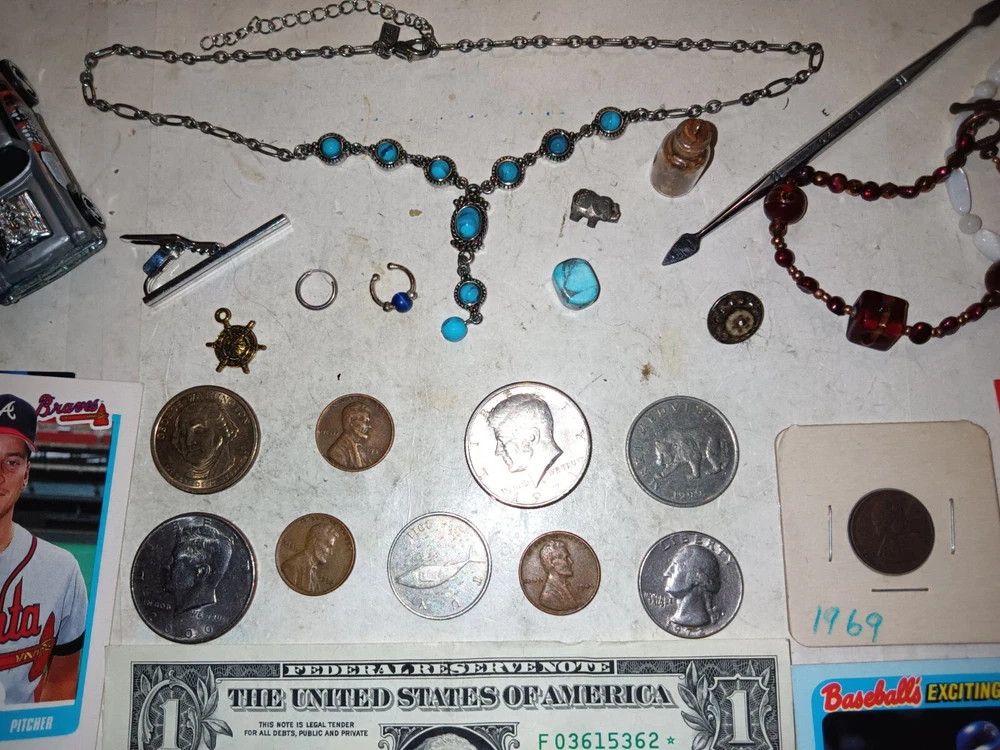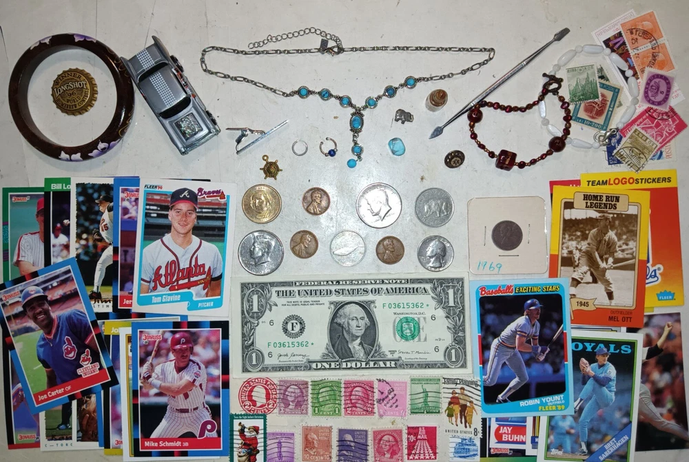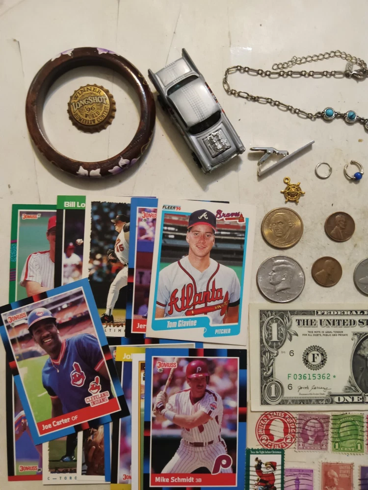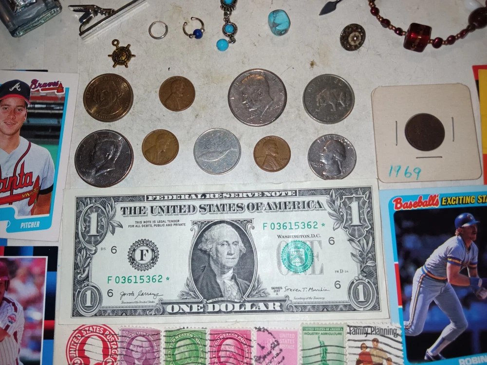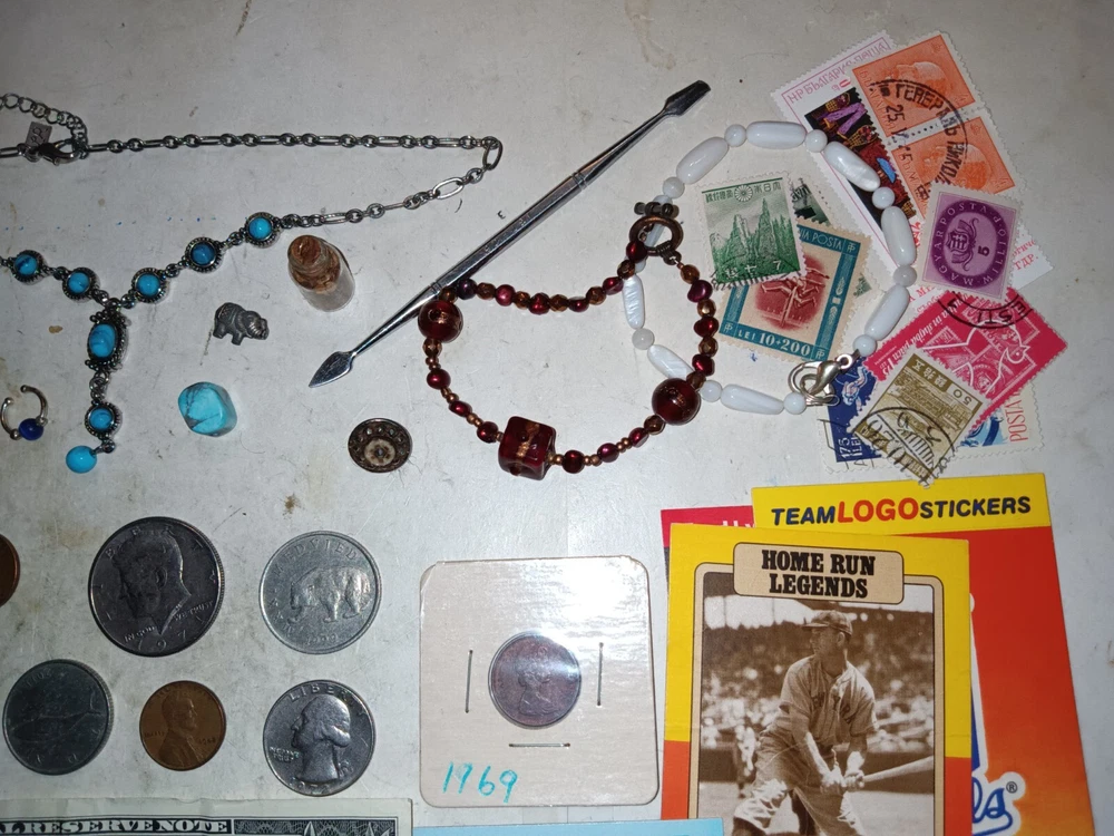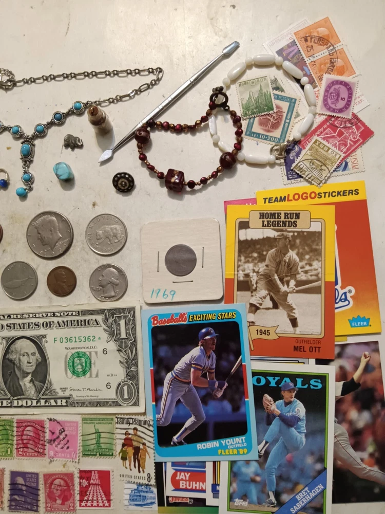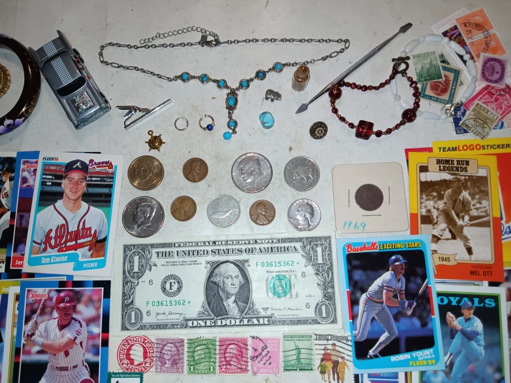 ..... NICE OLD U.S.A. Coins, Old USA stamps, MLB Cards, and Jewelry ITEMS in this lot and include.... . The U.S.A. COINS include: 1946 Wheat cent 1971-D, 2000-P Kennedy halves not silver 1945, 1952 Wheat cents 1972 Washington quarter $1 Presidential coin The JEWELRY Items: .....Earring small circle Silver .....Nose piercing .....Necklace chain and with turquoise .....Turquoise stone .....Bracelets .....Pendants__0ar, elephant .....Tool .....Toy Car .....Tie Clip vintage .....$1 Washington USA bank note series 2017 A .....Old USA Used Stamps 1920's to 1960's .....MLB Sport Cards__1980's, 1990's Mike Smith, Joe Carter, Robin Y I'mount -------------------------------------------------------------------------------------------------------------- Nice items in this lot and the pictures show the EXACT ITEMS that you will receive. I will start at a low price with NO RESERVE Shipping is $5.95 First Class in a protective envelope with a TRACKING NUMBER. I'll ship the item within 4 days. ONLY U.S.A. SHIPPING, I SHIP TO NO OTHER COUNTRIES.
