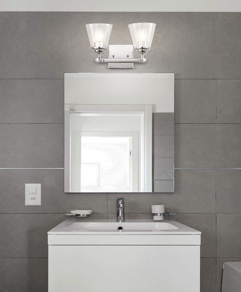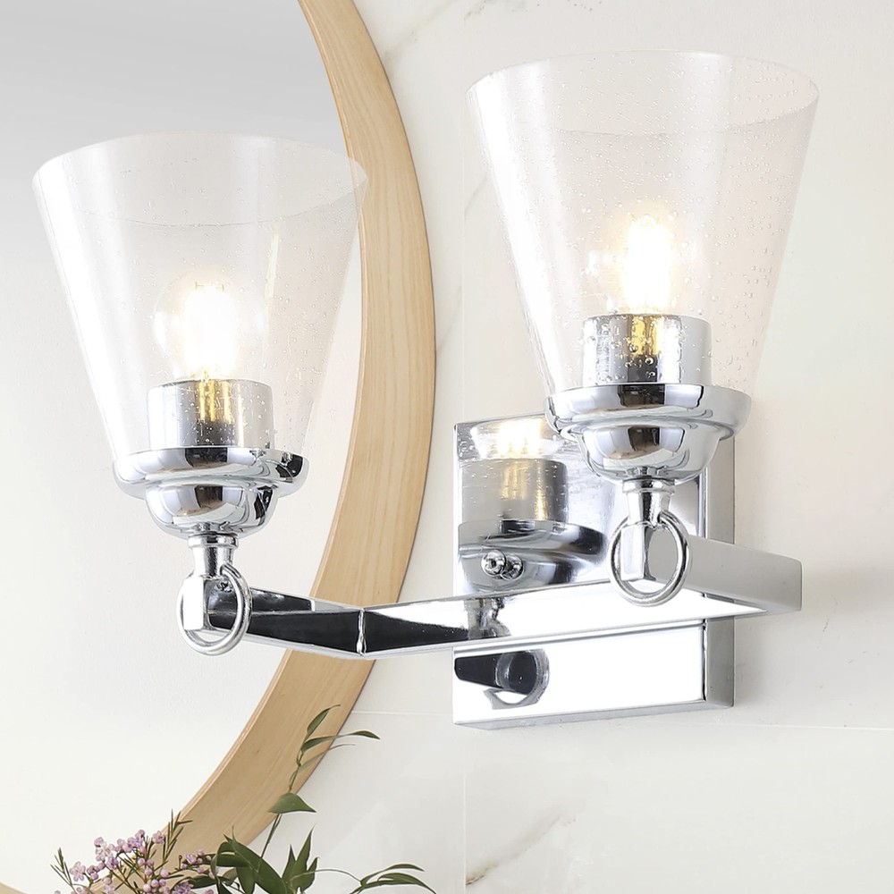 A beautiful upgrade for the vanity, this 2-light sconce delivers an elegant polished chrome frame finish. Two hurricane-style seedy glass shades offer detail and style, while allowing maximum light to illuminate your daily rituals. Also reversible, you can select to hang this light in either north-south orientation, creating versatility for any space. QUALITY CONSTRUCTION: Wall light fixtures are used as general lighting; Available in amazing variety; Replacing old, outdated wall lights is a fast and affordable way to update your home design ENERGY-SAVING LED BULBS INCLUDED: LED bulbs are included with every light fixture; All of our lighting is ETL Listed and meets 120-volt UL standards for safety and quality; Professional installation is recommended for all wall light fixtures SATISFACTION GUARANTEED: Every design is created with uncompromising attention to detail, using only the highest quality components; Based in Soho, New York, designer Jonathan and his talented team create affordable high-end home decor Featuring glass shades with tiny glass bubbles, this hurricane-style bathroom light fits any style of décor Fully reversible, you can choose to hang the sconce in either North-South orientation
