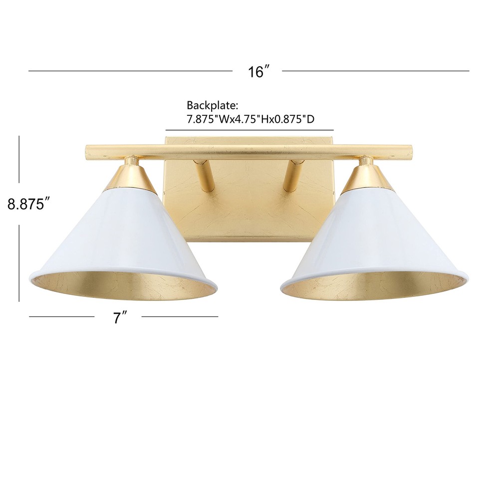 Perfect for above a mirror, this double light sconce or vanity lighting is a contemporary touch that would add style to a variety of spaces. White metal shades and gold leaf accents pair well for a modern update to your powder room or master bath. The plastic cord is easily connected to your home's electrical grid by a licensed electrician. QUALITY CONSTRUCTION: Wall light fixtures are used as general lighting; Available in amazing variety; Replacing old, outdated wall lights is a fast and affordable way to update your home design ENERGY-SAVING LED BULBS INCLUDED: LED bulbs are included with every light fixture; All of our lighting is ETL Listed and meets 120-volt UL standards for safety and quality; Professional installation is recommended for all wall light fixtures SATISFACTION GUARANTEED: Every design is created with uncompromising attention to detail, using only the highest quality components; Based in Soho, New York, designer Jonathan and his talented team create affordable high-end home decor Perfect for powder rooms or bathrooms, these sconces are best suited as vanity lighting Metal shades in white/gold