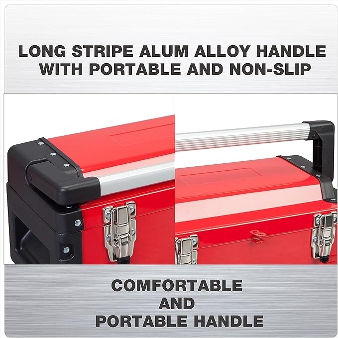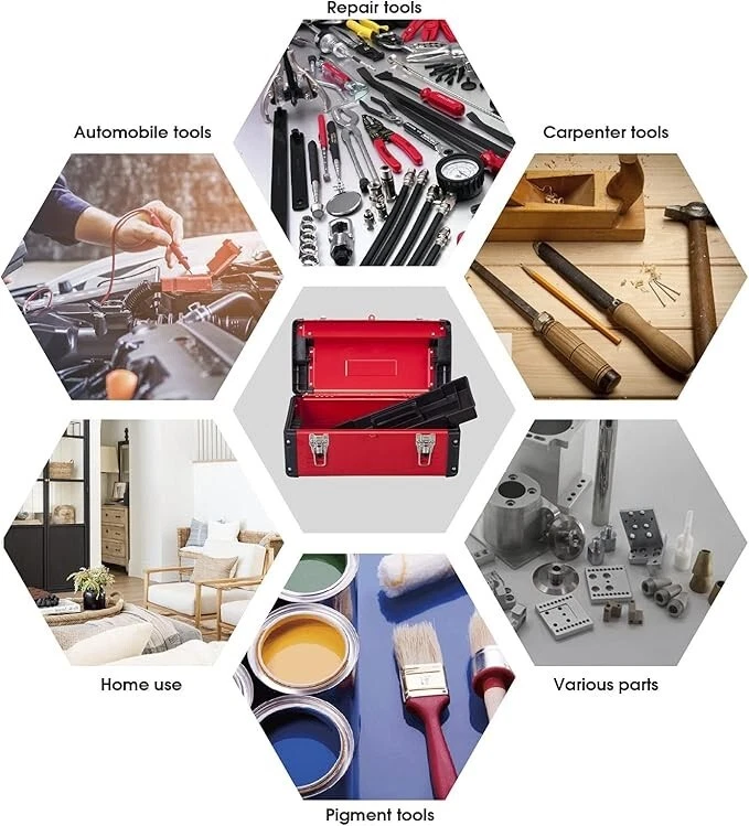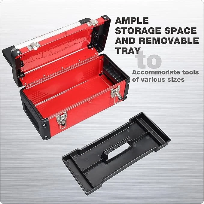 [Measurement and Application]Toolbox outer dimension is 16.14"*8.46"*7.09".Weight:5 LB.Perfect sized storage container.Tool organizer for home、craftsman、garage and car trunk.A small portable tool box for daily demands to help you tackle the toughest jobs [Durable and Structural Design]Tool box organizer is made of high quality steel&hard plastic and aluminum.Make sure steel tool box is sturdy and durable.A removable inner tray with handle divided 4 toolbox compartment can hold our most used tools-screwdrivers,pliers,wrenches,etc.The Roomy bottom compartment can store larger tools [Portable and Protective Toolbox]Long alum alloy handle with stripes increase friction to avoid hand slippage.4 corners of steel tool box are plastic wrapped for protection in case of impact.Toolbox both sides have recessed sections for hand-carrying [Double Security Lock]Lockable tool storage box comes with 2 stainless steel latches.For safety and reliability.More rigorous than the general toolbox, not easy to be accidentally opened [No-Risk Purchasing]Our products are subjected to rigorous testing.If you have any questions, please feel free to contact us.We accept return for no reason.We provide a limited 1-year manufacturer warranty