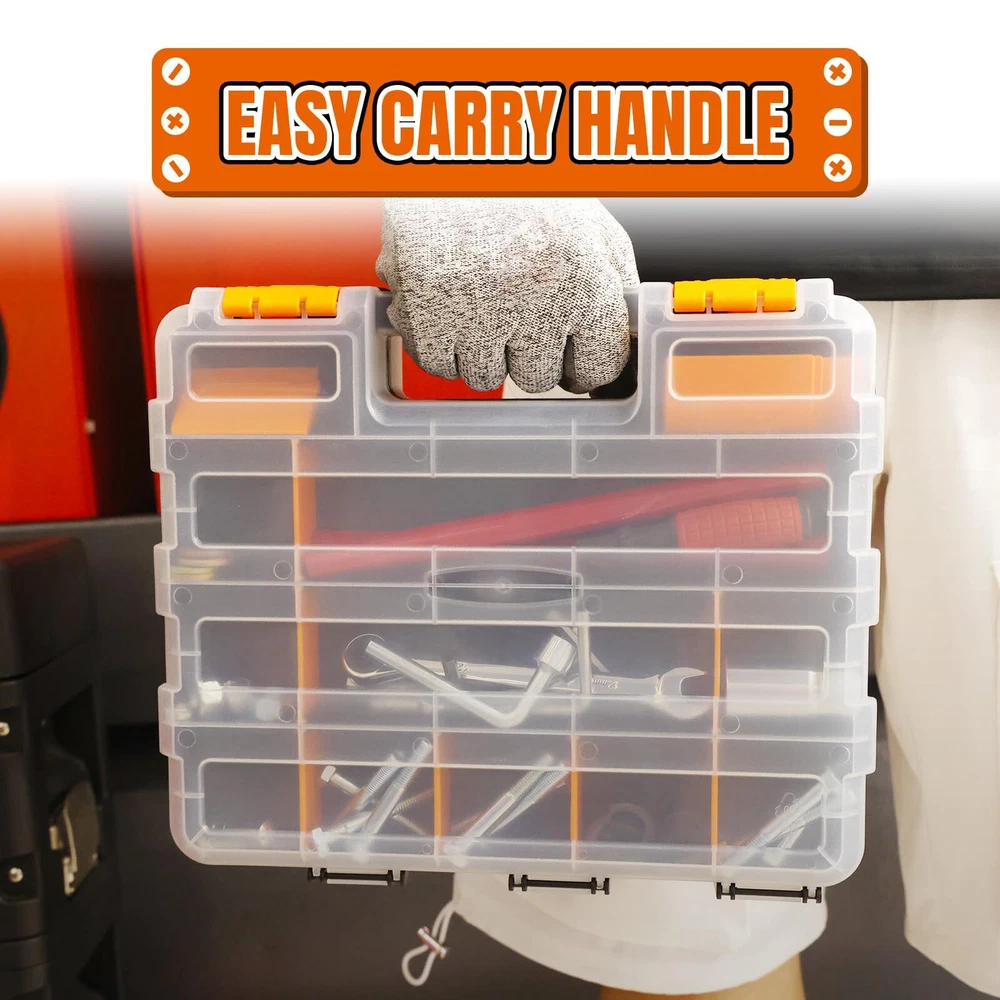Jack Boss Tool Box with Transparent Lid, Double Side 34-Compartments Organizer Box with Removable Dividers for Hardware, Screws, Bolts, Nails, Beads, Jewelry and Fishing Accessories, Orange, 2 Pack Product Size: Outside size with 12.8 x 11 x 3.15 inch. Minimum compartment size: 2.56 x 2.36 inch. It is built to withstand the demands of rugged workstations and hobbyists alike. Customizable Compartments: 34 compartmets tool with 24 removable plastic dividers are easily slide on and off to customize the storage space, for storing tools, bolts, screws, small parts, fishing tackles, crafts and many other items. Double Sided: The tools box with unique detachable double side design offers oversize storage space, ensuring enough room for storing. Transparent Lid: Made it easier to identify the tools or parts inside with a transparent lid, great for personal or professional use. Warranty: It comes with limited 1-year manufacturer warranty. If you have any question, please feel free to contact us. Product Size: Outside size with 12.8 x 11 x 3.15 inch. Minimum compartment size: 2.56 x 2.36 inch. It is built to withstand the demands of rugged workstations and hobbyists alike. Customizable Compartments: 34 compartmets tool with 24 removable plastic dividers are easily slide on and off to customize the storage space, for storing tools, bolts, screws, small parts, fishing tackles, crafts and many other items. Double Sided: The tools box with unique detachable double side design offers oversize storage space, ensuring enough room for storing. Transparent Lid: Made it easier to identify the tools or parts inside with a transparent lid, great for personal or professional use. Warranty: It comes with limited 1-year manufacturer warranty. If you have any question, please feel free to contact us. Shipping from the USA All of our products are shipped from the USA, ensuring quick delivery to your destination. Payment We offer the following payment methods: PayPal, credit card, bank transfer, and eBay's secure payment system. Free Shipping & Free Returns Shipping within the USA is FREE. Additionally, any return is absolutely free for you. Risk-Free Purchase You have the option to return an item within 30 days without any justification. We cover the return shipping costs! Fast Shipping We ship immediately upon receipt of payment. Generally, the package is delivered within 2-3 days in the USA. If it takes longer, we will contact you. Quality and Costs Made in Europe, USA, China No customs fees or additional charges Total satisfaction guarantee Invoice with declared VAT available upon request in .pdf format Feedback Your feedback is very important to us. After you pay for your purchase, you will automatically receive positive feedback from us.