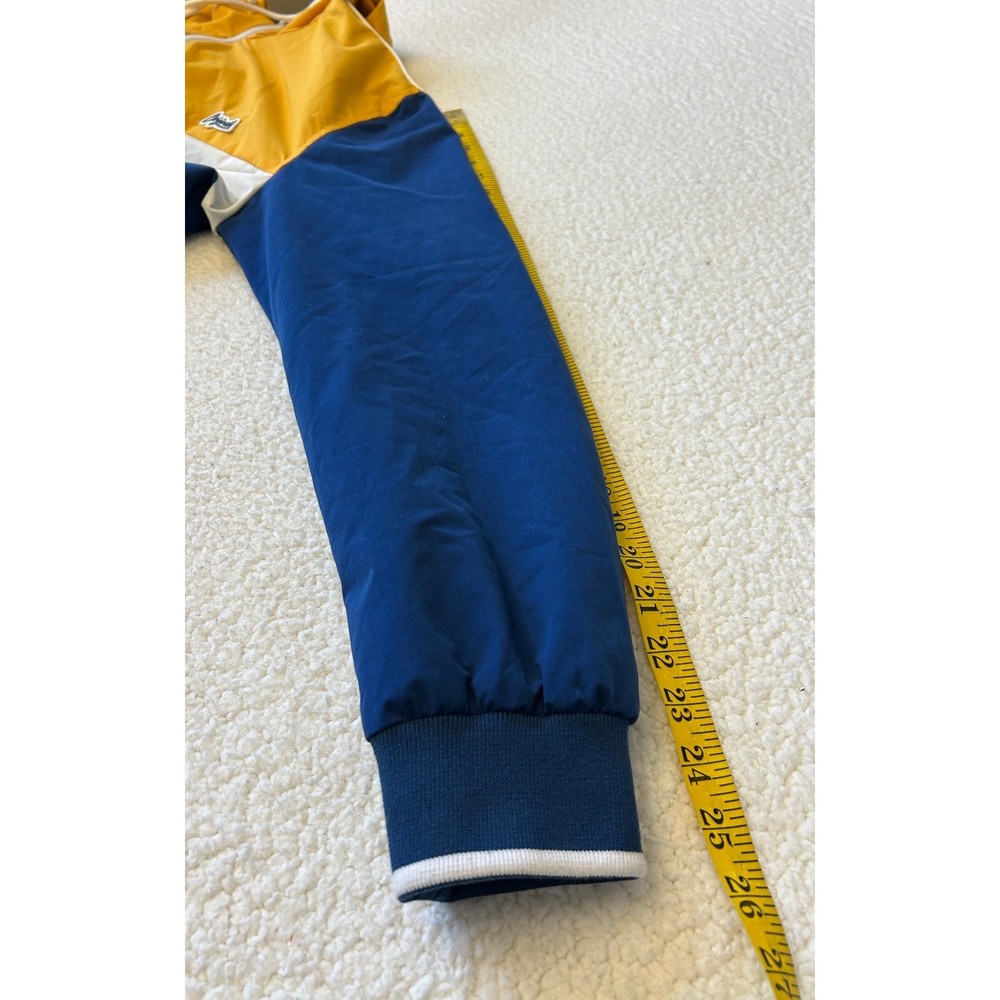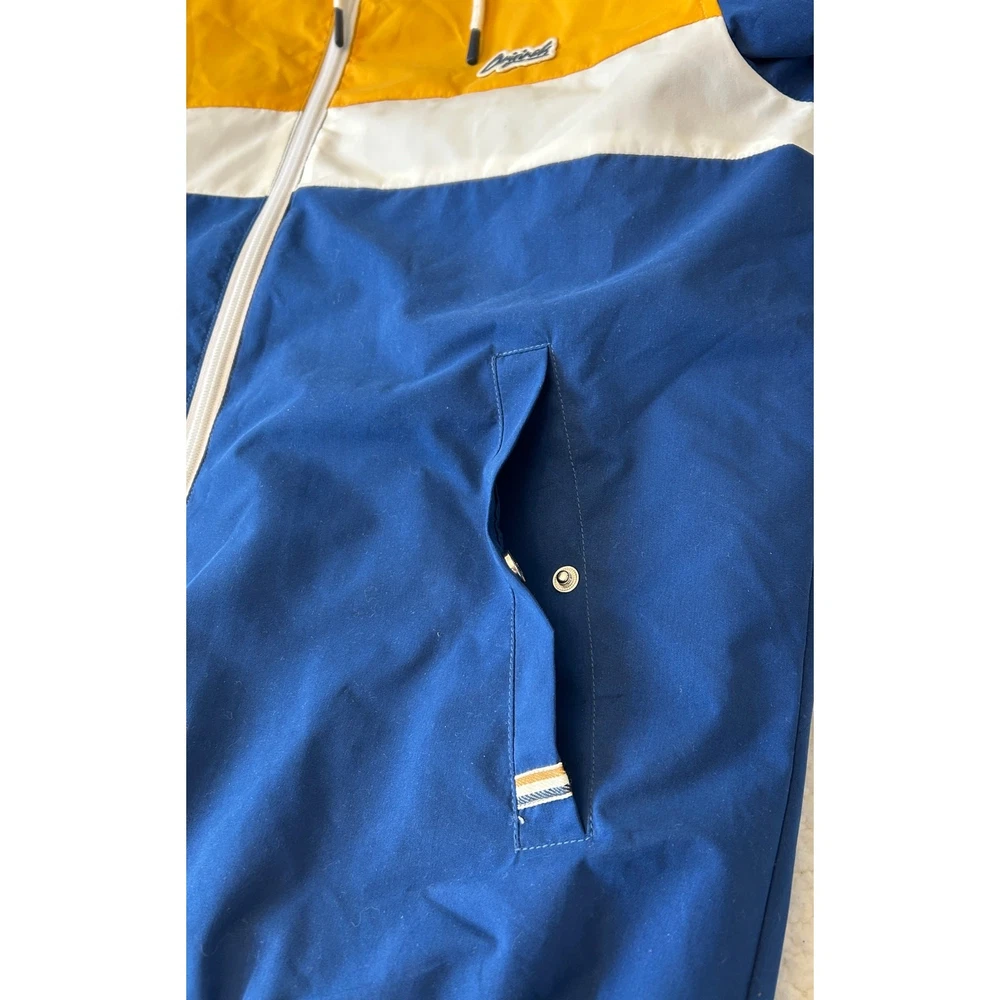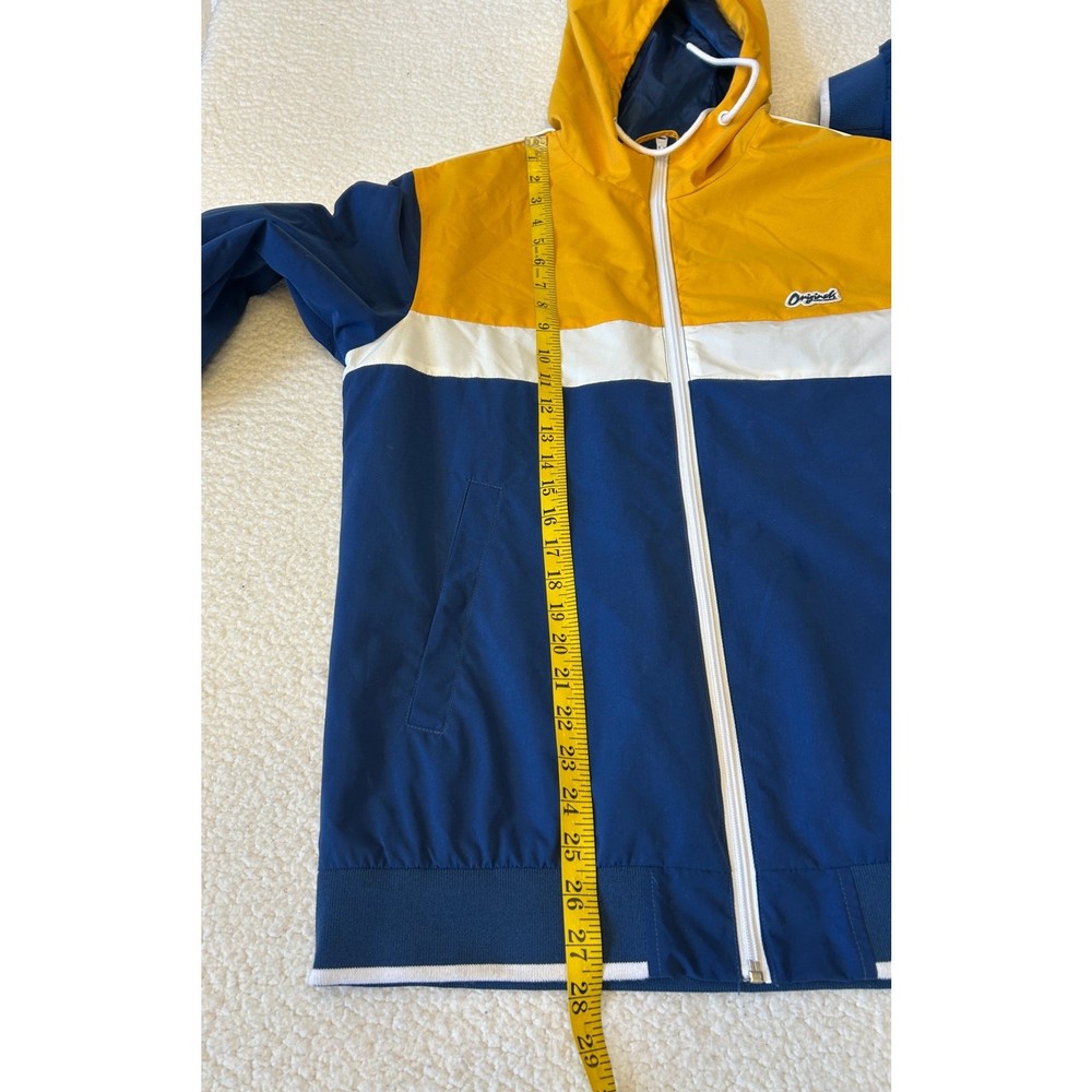 Stay protected from the elements with this awesome Jack & Jones Originals windbreaker! This full-zip hooded jacket features a cool multicolor design that's sure to turn heads. Perfect for those breezy days or light rain, this windbreaker is both practical and stylish. It is in great condition and ready for a new owner. Grab it now and add some flair to your wardrobe! Water Resistant Lightweight **Runs Small** No Tags with Material Content Pit to Pit- 21" Sleeve- 25" Length- 27.5"