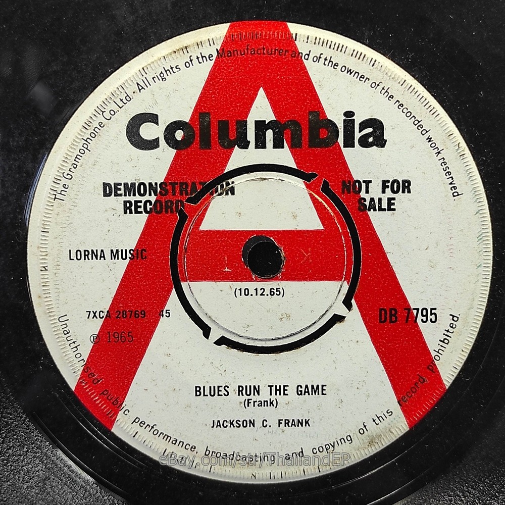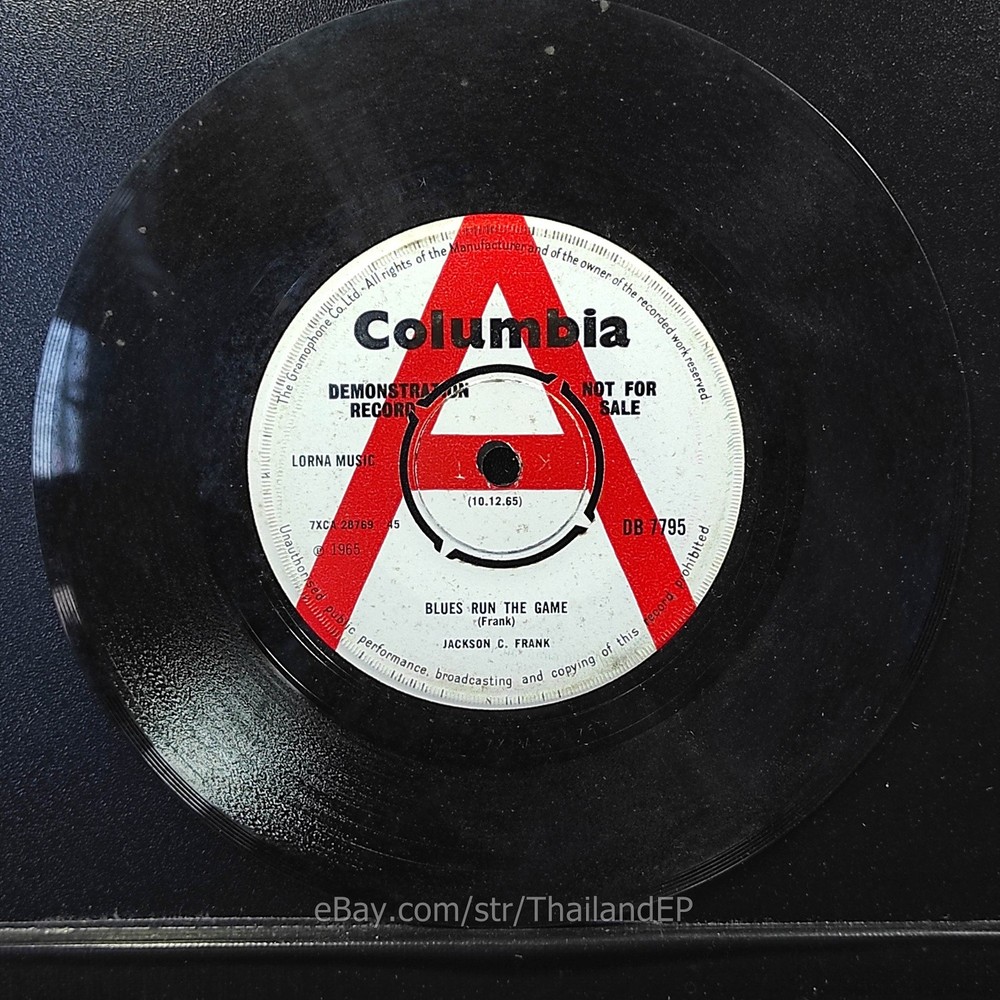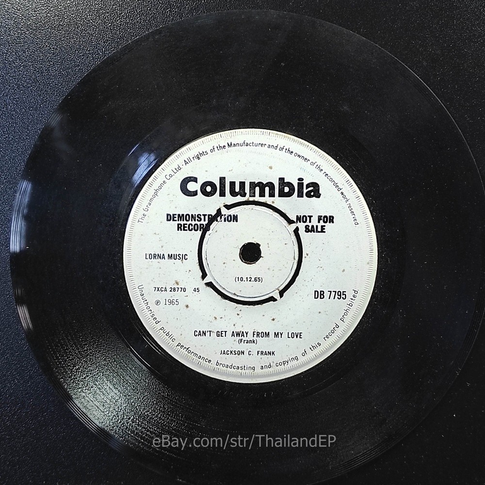 Description Records !!! DETAIL SONG and ARTIST !!! Side : A = Jackson C. Frank - Blues Run The Game / B = Jackson C. Frank - Can't Get Away From My Love Label : Columbia Cat-No : Db 7795 / Year = 1966 Rock, Funk / Soul, Pop-Beat, Mod, Soul Label&Catalogue number : : DB 7795 Country of release : UNITED KINGDOM Condition (Sleeve/Disc) : VG / VG+ Old stock look like Never beed played and pls see picture too. Shipping I am seller in Thailand not USA.So I can not ship 4$ as policy pls understand this real rate from oversea . Price for shipping(Airmail )&Packaging to worldwide only US 14.99 USD .Except Asia and JAPAN only 14.99 USD. You can save cost for combine shipping only 3 USD$ per each. 2xEP=17.99 USD$ , 3xEP=20.99 USD$ . My package very safety by big cardboard don't worry about your's EP/PS/LP. Time delivered 21-45 days . ***All item : have tracking system no need add money*** **For normal shipping (Airmail).Time delivery to ITALY maybe use 1-2 Months, France use 1-2 Months.But Don't worry item will arrived to you sure!!.For fastest and High value you can use Express Mail Service cost for1 EP =39 USD.EP will arrived to you within 5-7 Days. ***All shipment have fully tracking system *** Payment PAYMENT : I accept the follow payment by eBay managed , . My ID eBay provide by eBay .Account will be provide at the end auction.Charges to be covered by winner. If you have question pls email to me anytime i can answer immediatly. I have many EP,PS 7" Thailand Pls Click => View seller's other items Check my feedback , I care and honest all customer.I welcome 0 feedback but contact me first if you will bidding. Good Luck !!!! and Enjoy . 45 RPM / EP/ LP Grading Scale: Mint /NM/ Excellent(VG++) /VG+/ VG /G+ /Good(G) / Fair / Poor / Bad (According Record Collector Magazine (UK)) LOT200-38DB7795