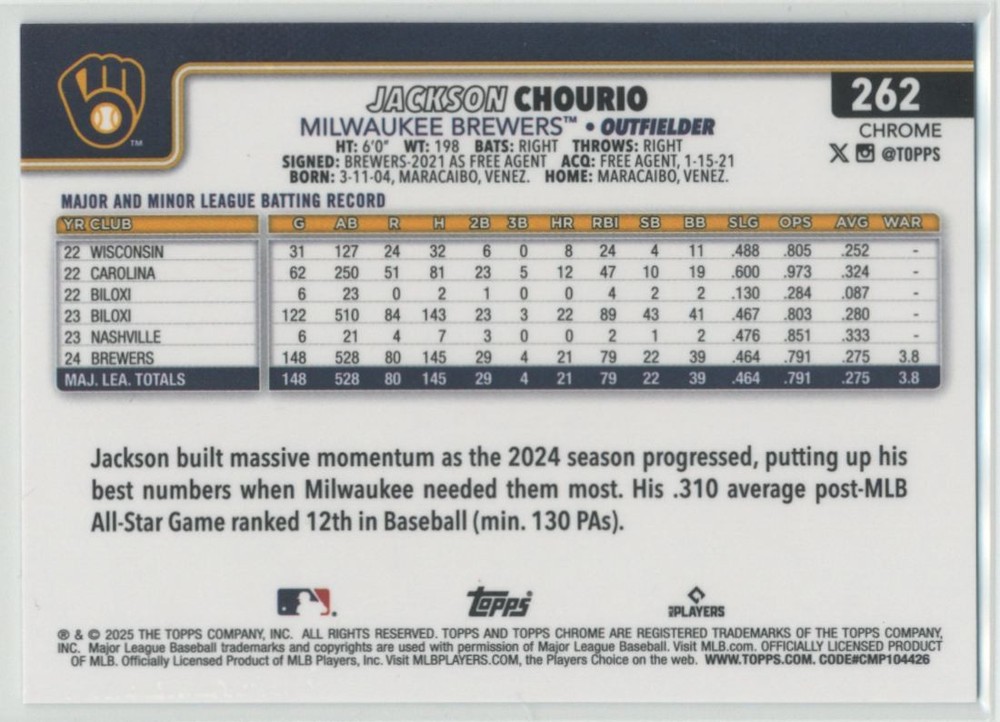 About Me Other Listings Feedback Add to Favorites Contact Me eBay Store Caddy Shack Card Shop Jackson Chourio 2025 Topps Chrome Rookie Cup Blue Lava Refractor /150 #262 No stock photo / These are real scans or pictures Details Description: Jackson Chourio Category: Baseball Year: 2025 Product: Topps Chrome Team: Milwaukee Brewers Card Number: 262 Special: Rookie Cup Blue Lava Refractor Serial Number: /150 Dimensions: 3½" x 2½" SKU: BL B0001 R01 I (20) Shipping Flat $0.99 shipping on every listing. Each additional item ships for only $0.25. FREE SHIPPING on any order of $30 or more! All discounts should combine automatically in shopping cart. Please note, cards must be purchased and paid for on the same order to receive combined shipping discount. Returns and Claims We offer FREE 30-Day Returns on the majority of our listings. If for any reason you are unhappy with your purchase, we proudly offer a full-refund for the item upon it's return as we will provided you a shipping label free of charge. In the case an item was damaged in the mail, please reach out to us via eBay messages and we will glady work with you to resolve any issue. About Us We use high quality scans of actual cards in our inventory. The card pictured is the exact card you will receive unless the listing has multiple quantity. For multi-quantity listings, you will receive the exact card pictured or one in the same condition as listed. If you have any questions or concerns about any of our listings please don't hesitate to reach out via eBay messages. Listing By Kronocard trading cards software v2.9.0.0