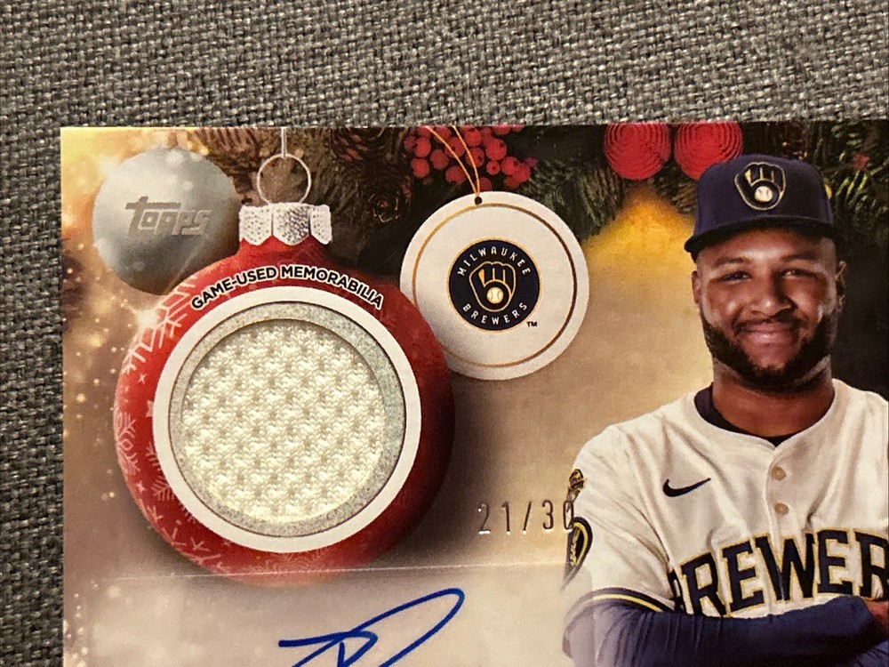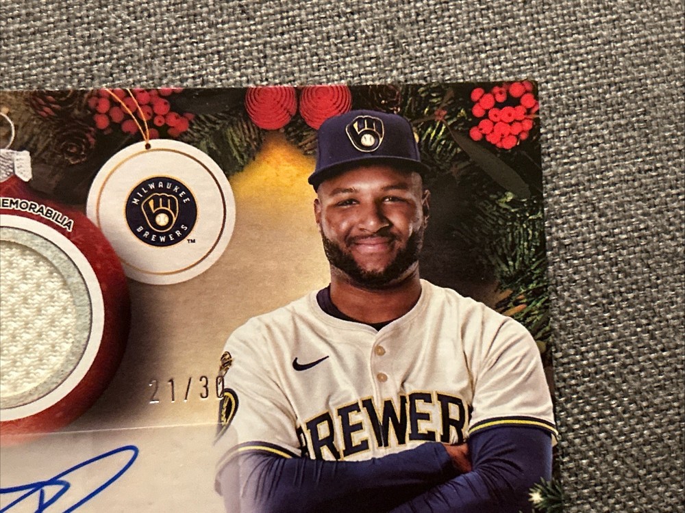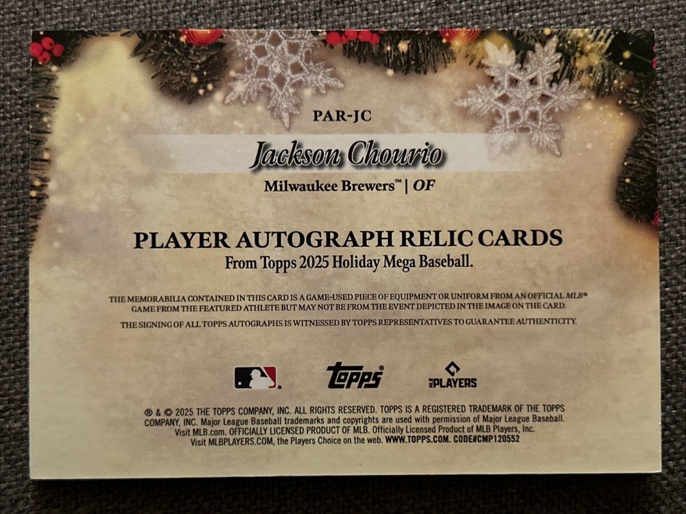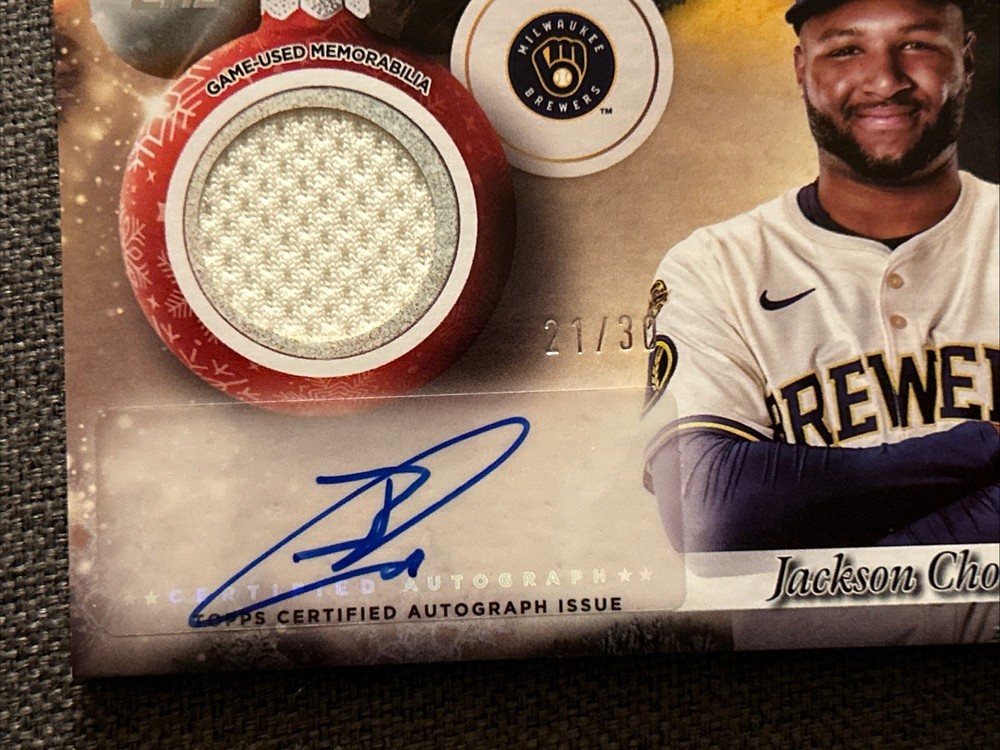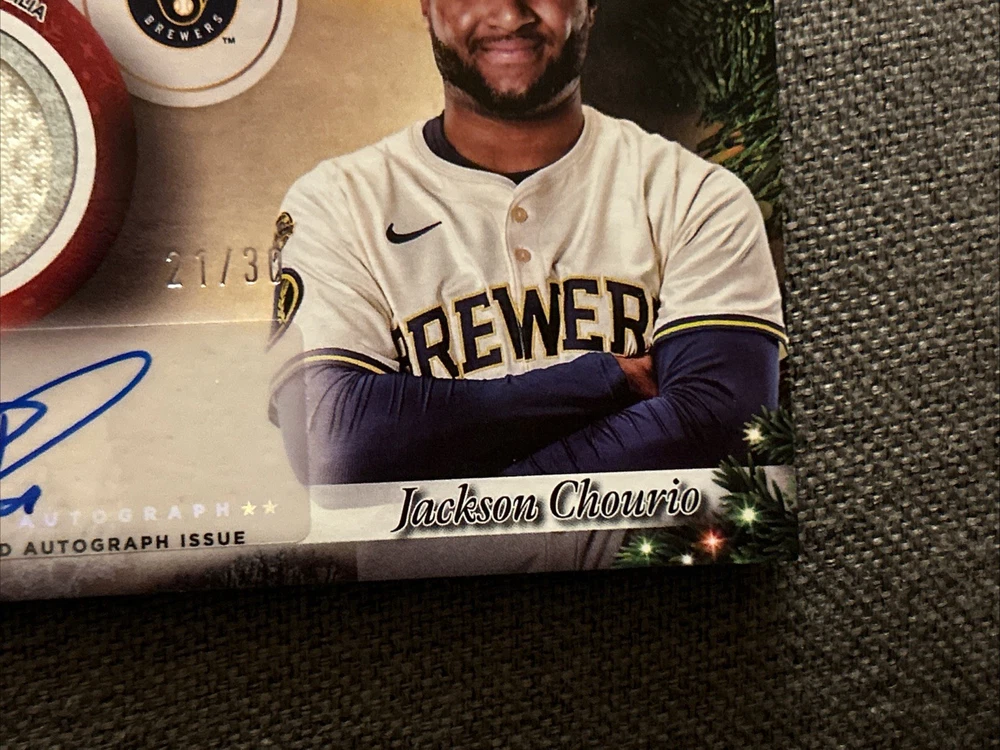 The Jackson Chourio 2025 Topps Holiday Autograph Relic Card is a highly sought-after collectible in the sports trading card world. This card features an authentic autograph from Jackson Chourio, a promising player from the Milwaukee Brewers team in Major League Baseball. It is numbered 21 out of 30, making it a limited edition piece that is sure to excite any baseball card collector. With its unique features such as being part of a special holiday set and including a memorabilia relic, this autographed card is a must-have for fans of Jackson Chourio and baseball trading cards in general.