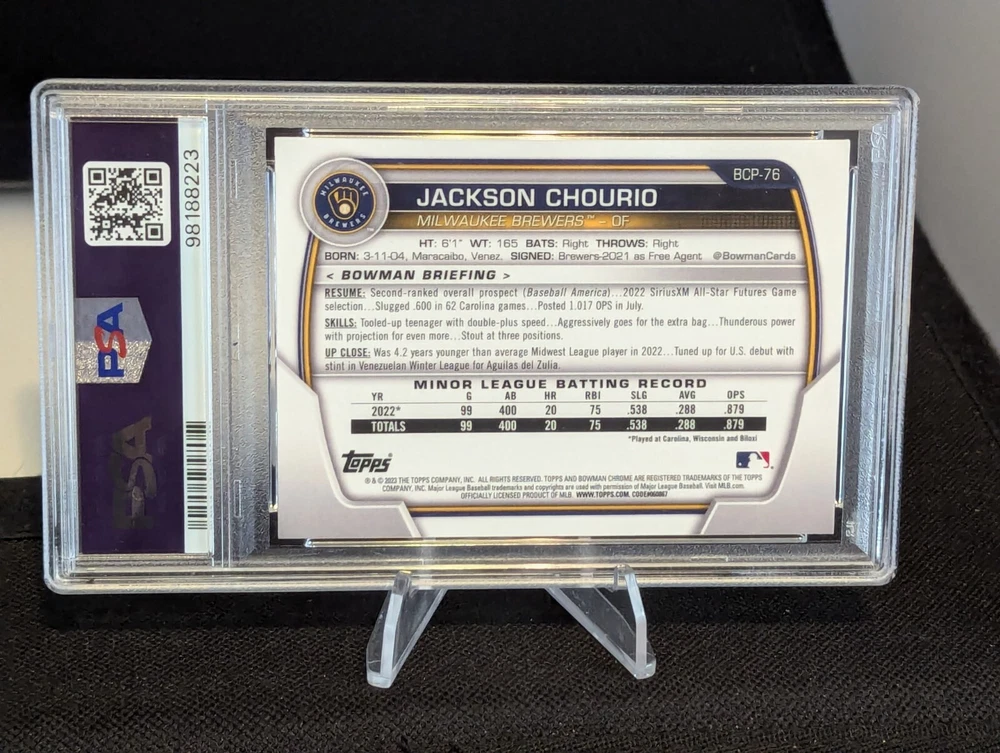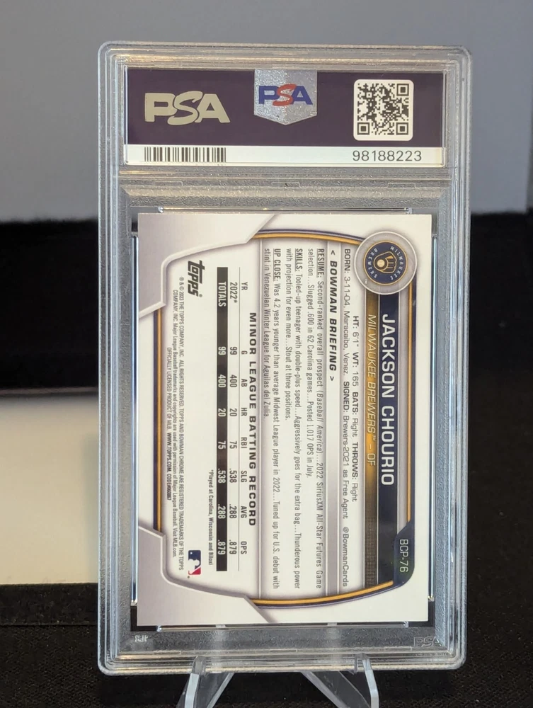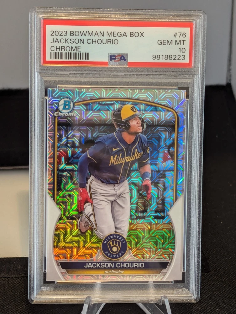 Jackson Chourio RC: 2023 Bowman Chrome PROSPECTS, MEGA BOX MOJO, PSA 10! BREWERS
