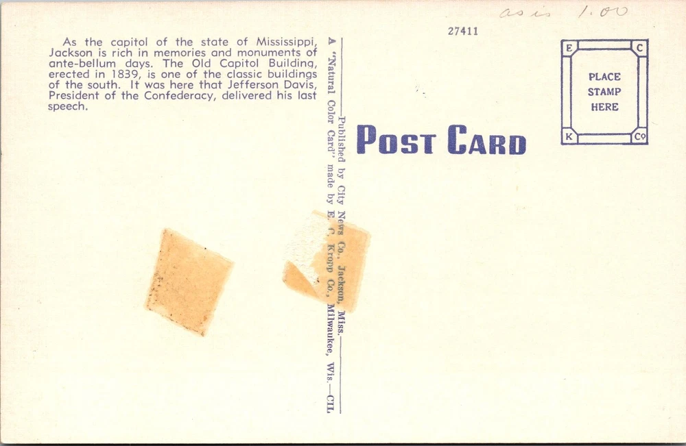 Original/Licensed Reprint: Original City: Jackson Unit of Sale: Single Unit Region: Mississippi Type: Printed (Lithograph) Theme: Cities & Towns Subject: Cities & Towns Country/Region of Manufacture: Unknown Era: Linen (1930-1945) Country: USA Postage Condition: See Image
