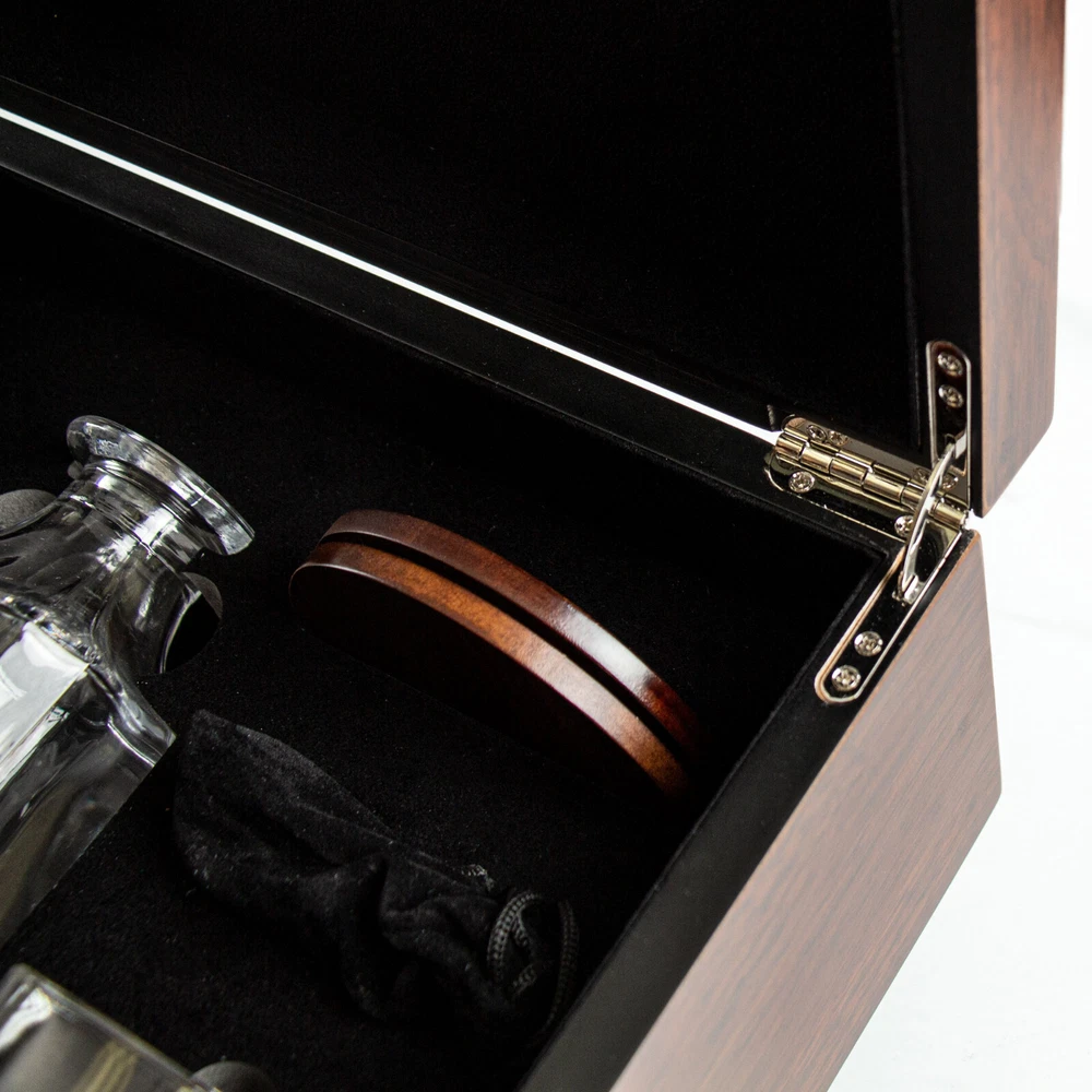 Material: Glass Capacity: 750 ml Brand: Gifts Inscribed Occasion: All Occasions Personalize: No Country/Region of Manufacture: United States Features: Dishwasher Safe, Spill-Proof, With Lid/Stopper Set Includes: Decanter, Glasses, Lid/Stopper Type: Decanter Set MPN: NFL115 Color: Clear