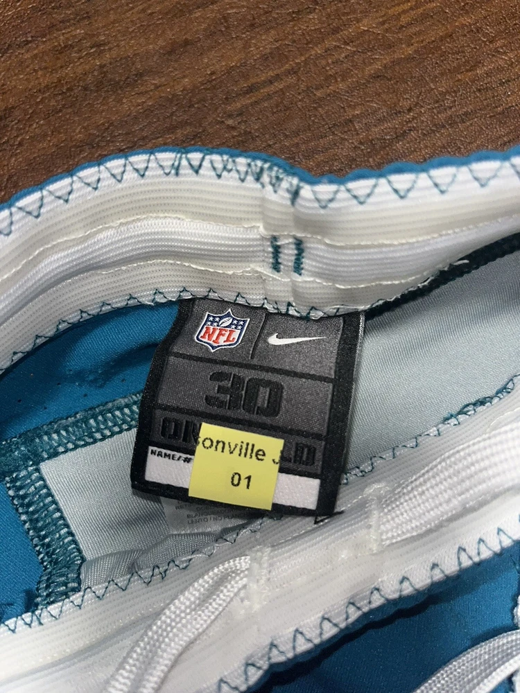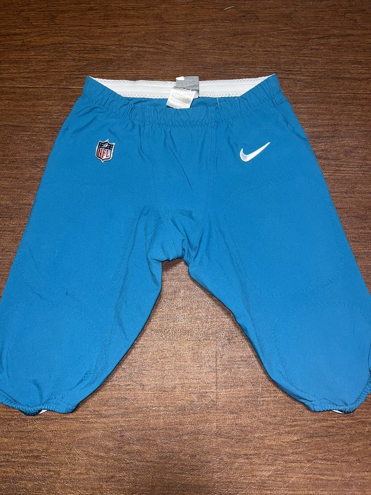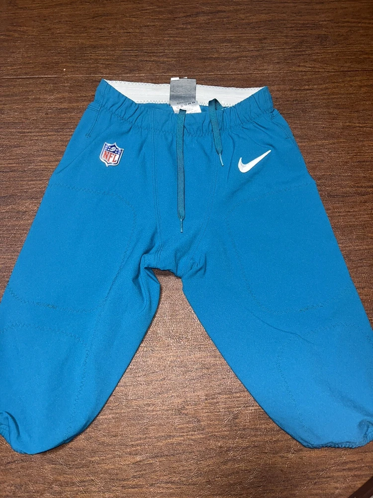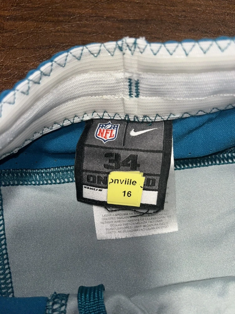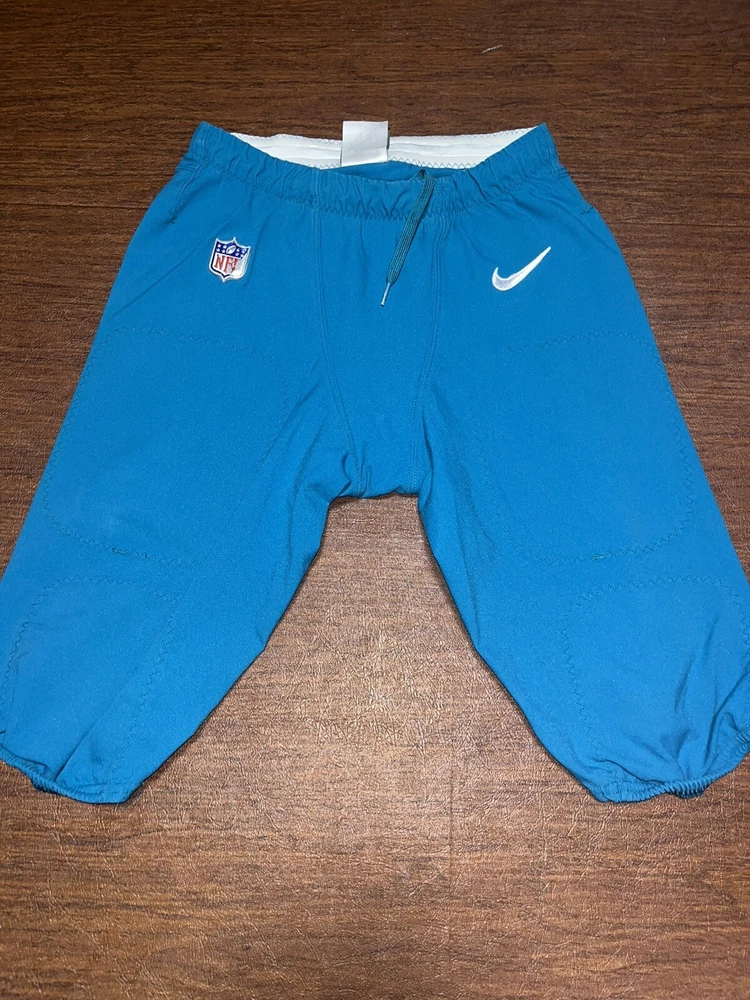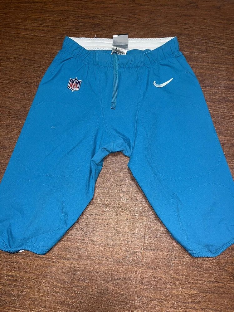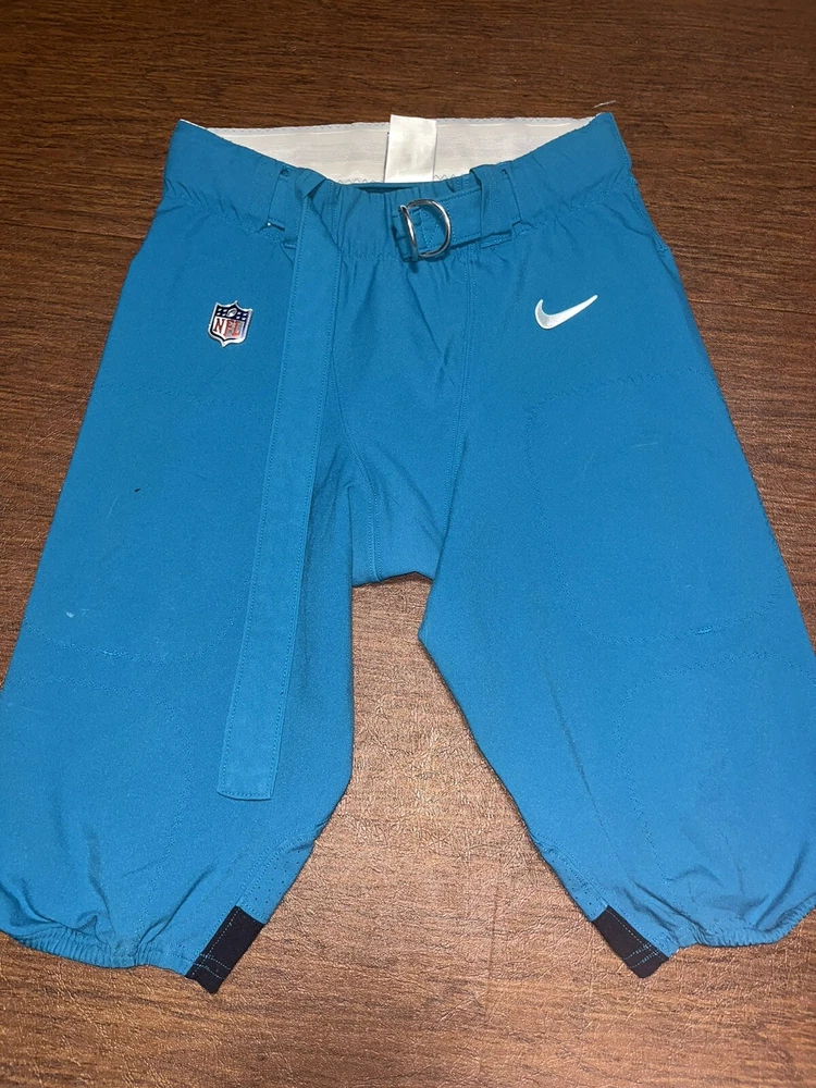 Teal game used pants: Darious Williams #31 (UAB) Foye Oluokun #23 (Yale) Tyson Campbell #32 (Georgia) Travon Walker #44 (Georgia) Travis Etienne #01 (Clemson) Jamal Agnew #39 (San Diego) Andre Cisco #05 (Syracuse) Roy Robertson-Harris #95 (UTEP) Pick one of these pairs!! You do not get them all. These are pants that have a lot of use on them and would be perfect for a mannequin or to wear to practice or the game. Message us any question you might have. We will ship within 48hrs and be to you within a week.