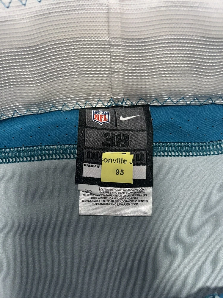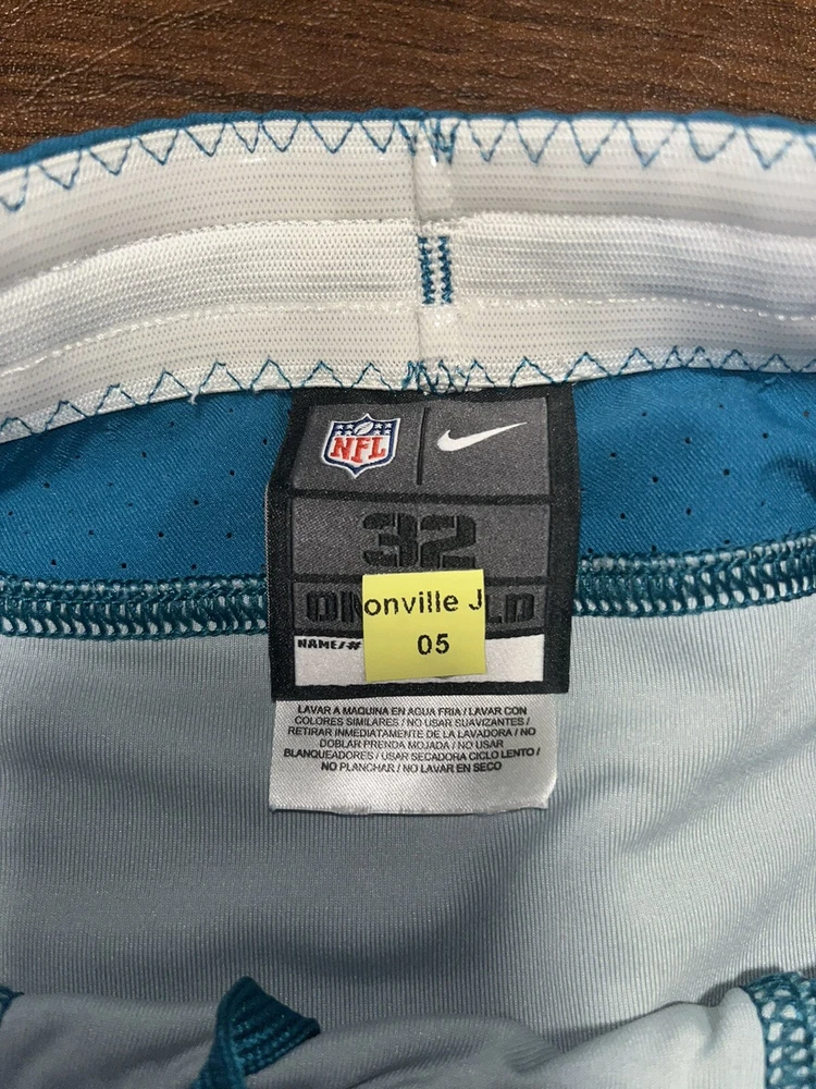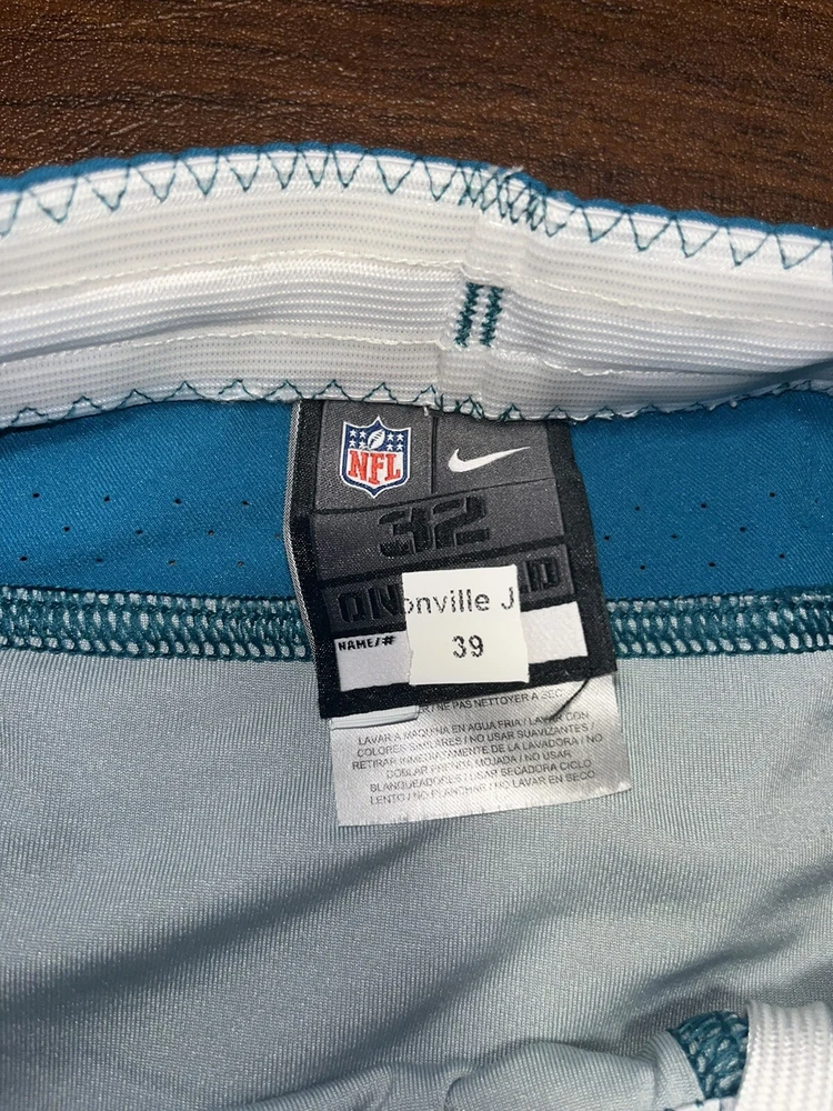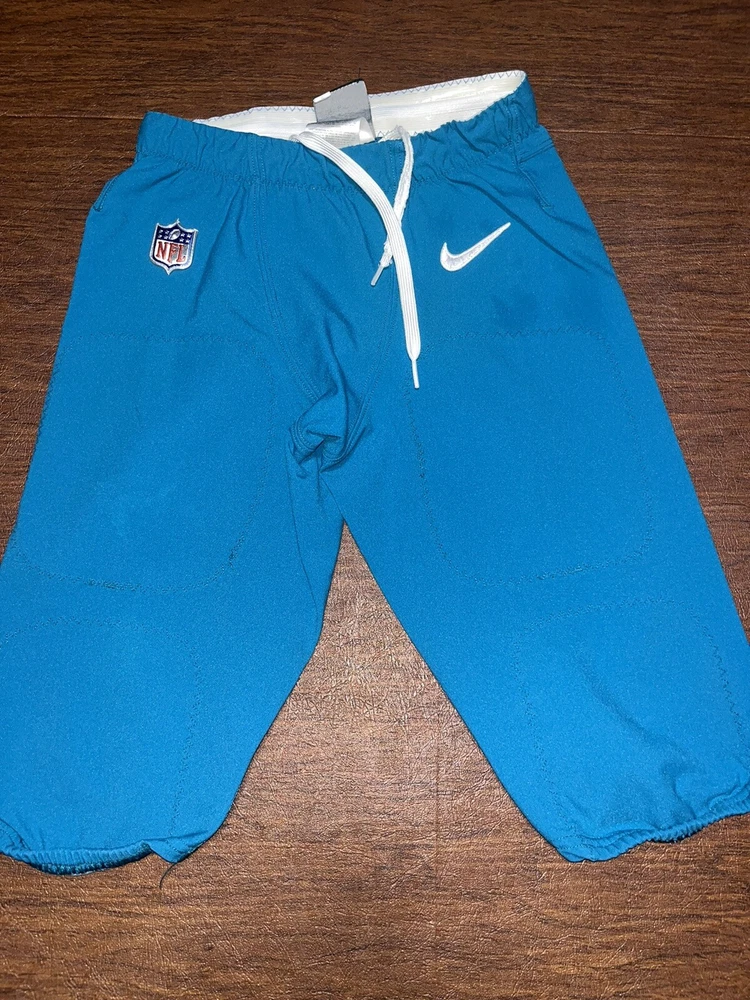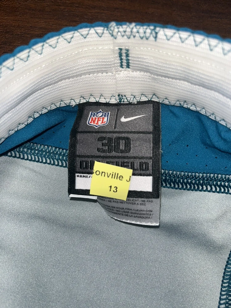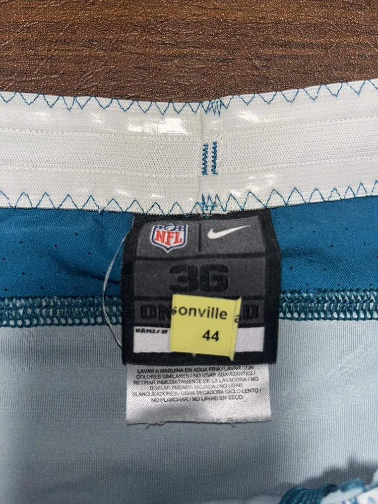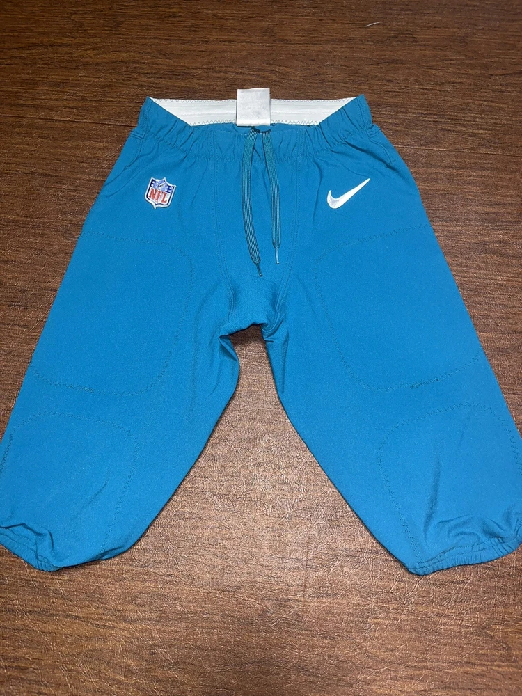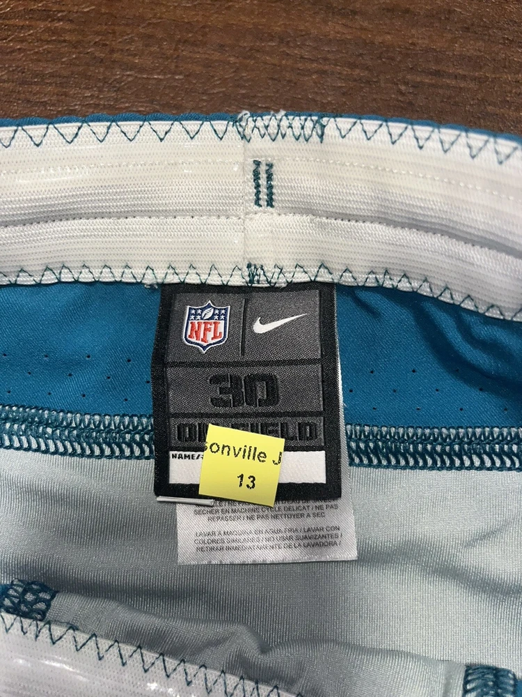 Teal game used pants: Darious Williams #31 (UAB) Foye Oluokun #23 (Yale) Tyson Campbell #32 (Georgia) Travon Walker #44 (Georgia) Travis Etienne #01 (Clemson) Jamal Agnew #39 (San Diego) Andre Cisco #05 (Syracuse) Roy Robertson-Harris #95 (UTEP) Pick one of these pairs!! You do not get them all. These are pants that have a lot of use on them and would be perfect for a mannequin or to wear to practice or the game. Message us any question you might have. We will ship within 48hrs and be to you within a week.