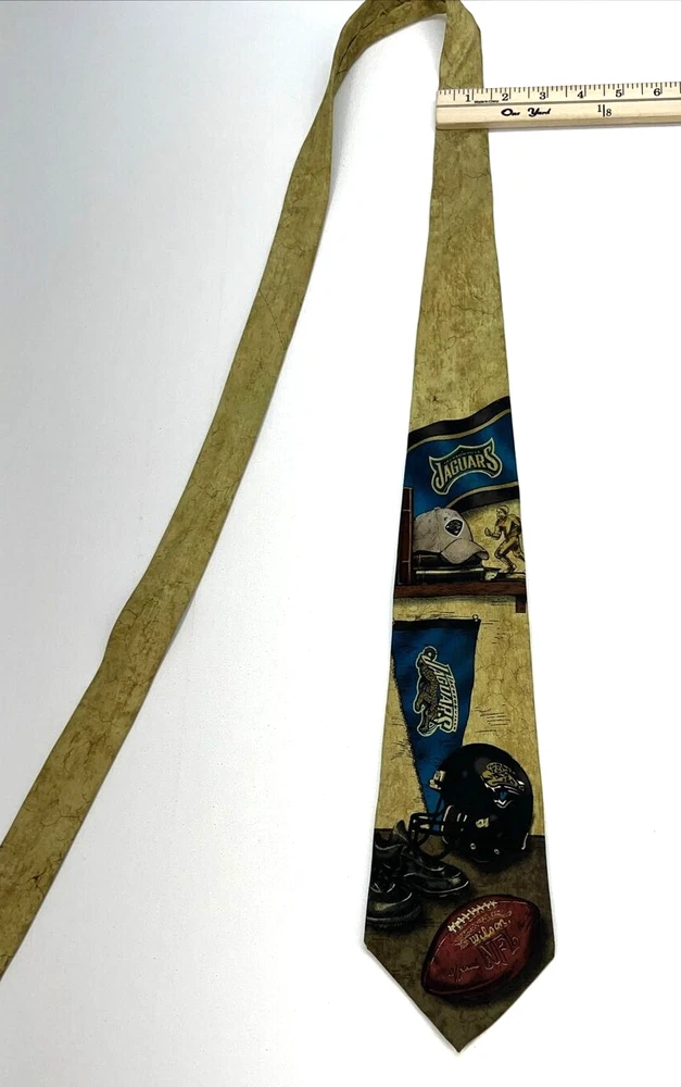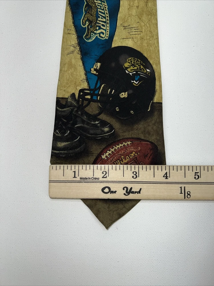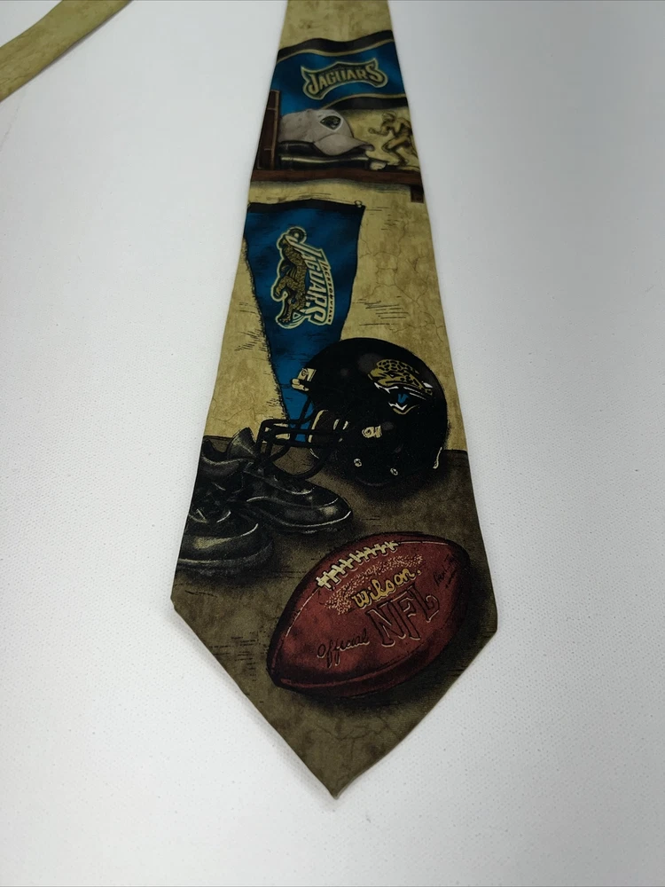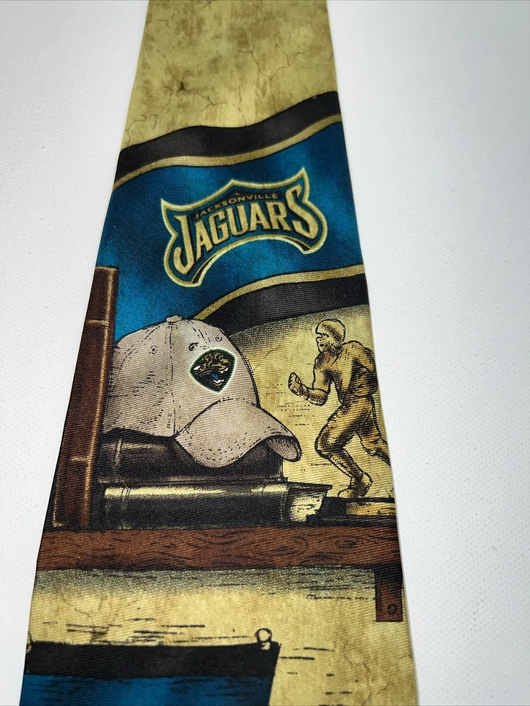 Style: Designer Product: Neck Tie Theme: Formal League: National Football League (NFL) Pattern: Jacksonville Jaguars Seller Notes: “Good Preowned Condition, see pics for details” Item Length: Classic (57"-60") Features: Adjustable UPC: Does Not Apply Team: Jacksonville Jaguars Brand: Eagles Wings Department: Men Color: Multicolor Sport: Football Fabric Type: Woven Item Width: Classic Size: One Size Character: None Type: Tie Country/Region of Manufacture: China Vintage: No Accents: Color gtin13: Does Not Apply Material: Silk