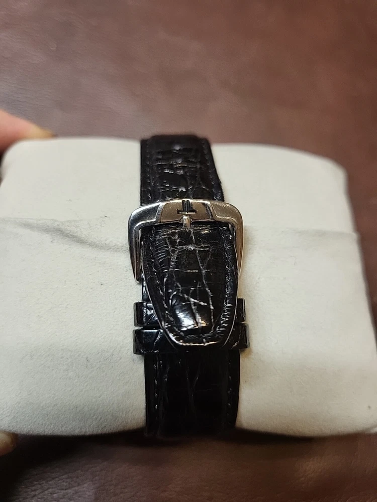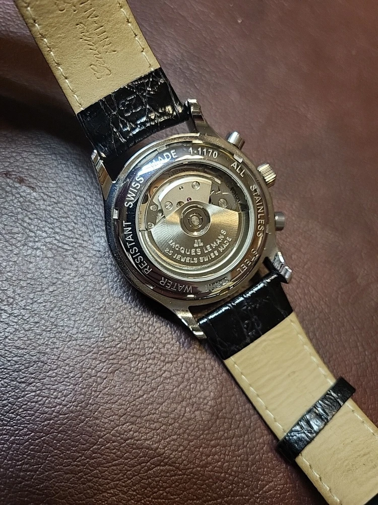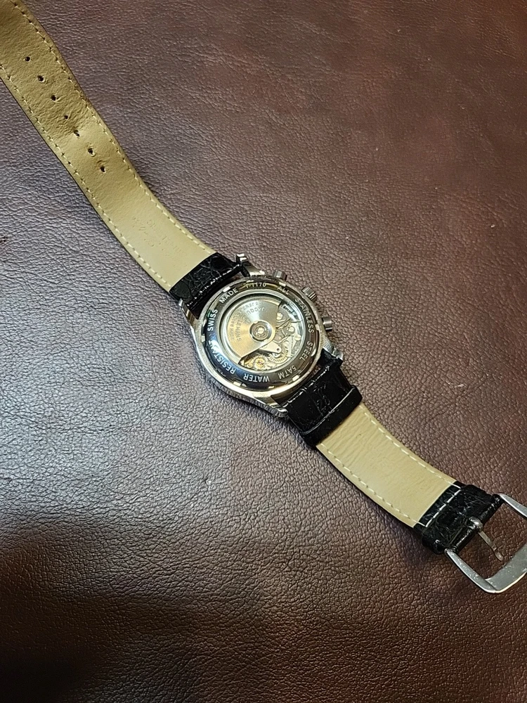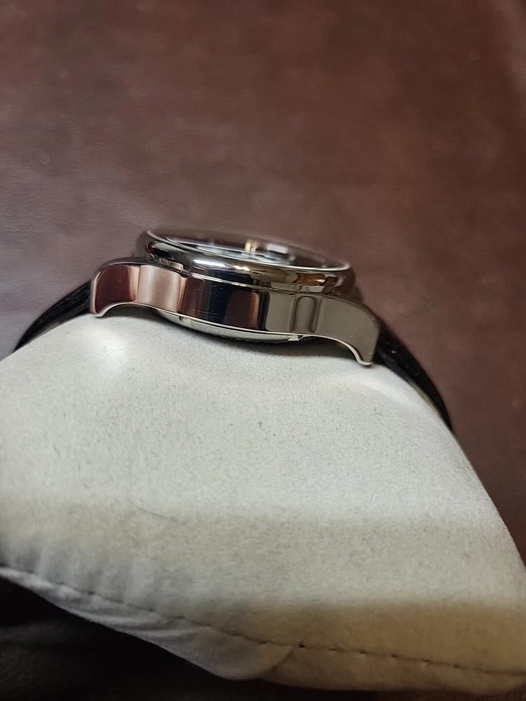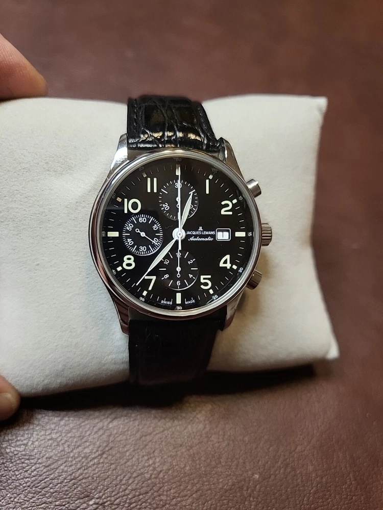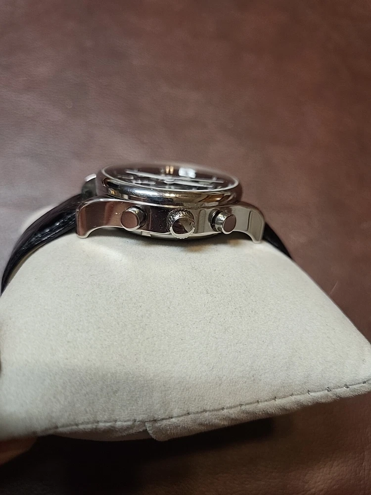 Nice condition maybe worn a handful of time. 40mm case, glossy black dial. Very pretty watch, chronograph functions work and reset as they should.