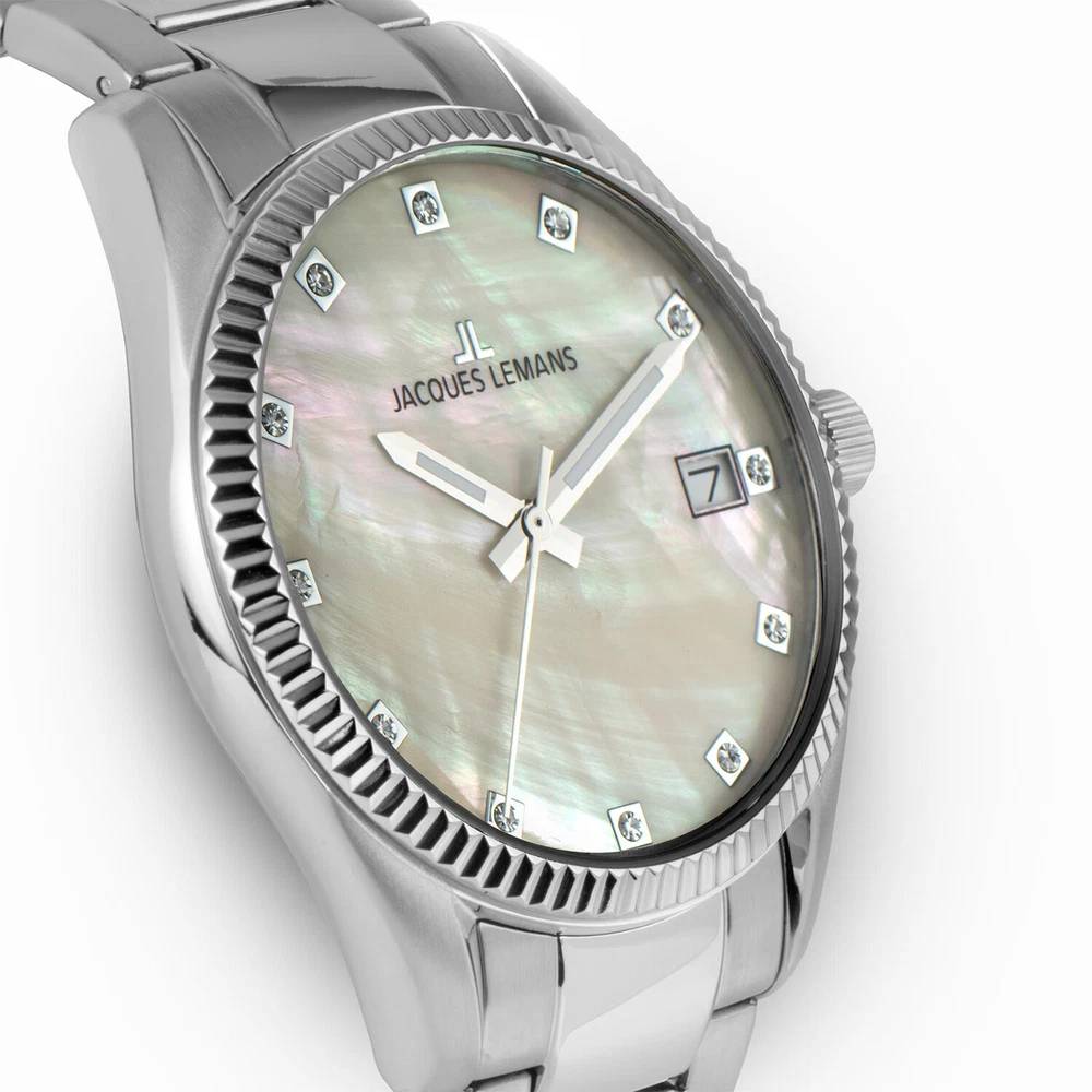 Jacques Lemans Ladies Watch Quartz Derby Stainless Steel/Mother Of Pearl 50-4H The description of this item has been automatically translated. If you have any questions, please feel free to contact us. Jacques Lemans Women's watch quartz Derby stainless steel/mother of pearl 50-4H Decorative women's wristwatch with precise quartz movement, date with quick correction, mother-of-pearl dial, luminescent hands, crystal indices, central second hand, case made of polished stainless steel, matt surface, serrated bezel, screwed case back, fluted crown with logo, hardened mineral glass, bracelet made of partially matted stainless steel , safety folding clasp with push-button and logo, waterproof up to 10 bar, width (without crown) 34 mm, height 8.5 mm Features of the Jacques Lemans watch: Department: Women Strap width: 17 mm Bracelet color: silver Case thickness: 9mm Housing color: silver Case shape: Round Case size: 34 mm Case material: stainless steel Country and region of manufacture: China Maximum wrist circumference: 17.1-18 cm Product type: Women's watches Series: Derby Movement: Quartz Closure: folding clasp with safety bar Water resistance: 10 bar Dial color: White Special features: Date display Mineral glass You can find the large selection of Jacques Lemans watches in the uhrcenter eBay Shop: Jacques Lemans Watches at uhrcenter Notes according to ElektroG You are legally obliged to return old electrical devices. Old electrical devices may not be disposed of with household waste, but must be collected separately. For this purpose, electrical devices are marked with a crossed-out garbage can. The materials contained in old electrical devices can be reused. Please disconnect batteries, accumulators and lamps that are not enclosed in the old electrical device before handing them over. We are legally obliged to take back old electrical devices free of charge. If you purchase a comparable new electrical device, you can send your old electrical device back to us free of charge. When we deliver the new electrical device, we will collect the old device free of charge. This free collection is limited to old devices in the categories heat exchangers, screens, monitors and devices containing screens with a surface area of more than 100 square centimeters and large appliances. Regardless of whether you purchase a new electrical device, you can send an old device that is not larger than 25 cm in any dimension back to us free of charge. If you would like to return an old electrical device to us, please request a shipping label using our contact options listed in the seller's legal notice. Please note that you are responsible for deleting personal data on the devices to be disposed of. Note according to battery law Since our shipments may contain batteries and accumulators, we are obliged under the Battery Act (BattG) to point out the following to you: Batteries and accumulators may not be disposed of with household waste; you are legally obliged to return used batteries and accumulators. Used batteries can contain harmful substances that, if not stored or disposed of properly, can harm the environment or your health. Batteries also contain important raw materials such as iron, zinc, manganese or nickel and can be recycled. After use, you can either send the batteries back to us or return them free of charge in the immediate vicinity (e.g. in stores or in municipal collection points or in our shipping warehouse). The sale in points of sale is limited to the quantities usual for end users and to those used batteries that the distributor carries or has carried in its range as new batteries. The symbol with the crossed out garbage can means that you must not dispose of batteries and rechargeable batteries in household waste. Under this symbol you will also find the following symbols with the following meaning: Pb: Battery contains lead Cd: Battery contains cadmium Hg: Battery contains mercury uhrcenter watches & jewelry top brands Jacques Lemans Women's watch quartz Derby stainless steel/mother of pearl 50-4H Decorative women's wristwatch with precise quartz movement, date with quick correction, mother-of-pearl dial, luminescent hands, crystal indices, central second hand, case made of polished stainless steel, matt surface, serrated bezel, screwed case back, fluted crown with logo, hardened mineral glass, bracelet made of partially matted stainless steel , safety folding clasp with push-button and logo, waterproof up to 10 bar, width (without crown) 34 mm, height 8.5 mm Abteilung Damen Armbandbreite 17 mm Armbandfarbe Silber Armbandmaterial Edelstahl Anzeigeformat Analog Besonderheiten Datumsanzeige Besonderheiten Mineralglas Gehäusedicke 9 mm Gehäusegröße 34 mm Gehäusematerial Edelstahl Herstellungsjahr 2020-Heute Herstellungsland und -region China Marke Jacques Lemans Maximaler Handgelenkumfang 17,1-18 cm Modell Derby Produktart Armbanduhr Stil Klassisch Stil Kleid/Formell Uhrenform Rund Uhrengehäuse-Farbe Silber Uhrwerk Quarz Verschluss Faltschließe mit Sicherheitsbügel Wasserdichtigkeit 10 bar Zifferblattfarbe Weiß EAN 4040662179986