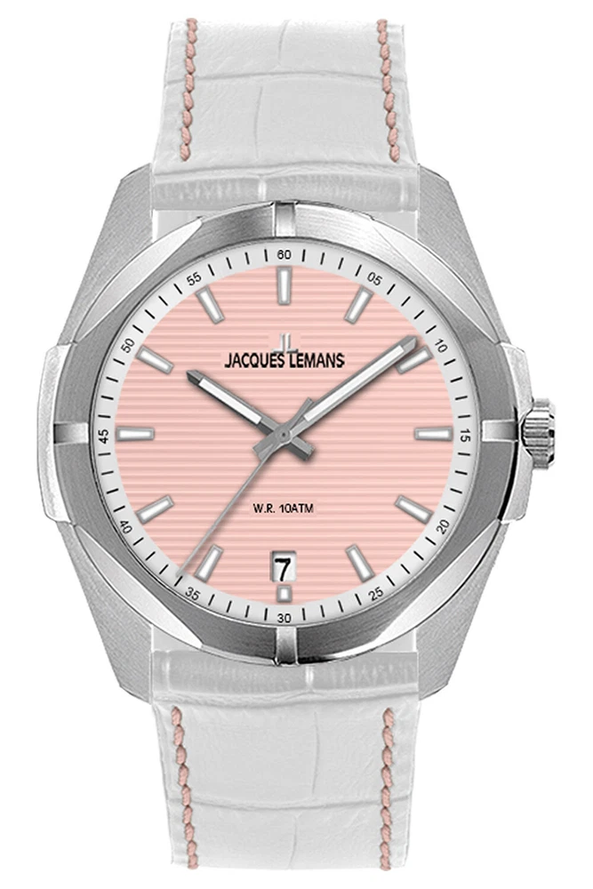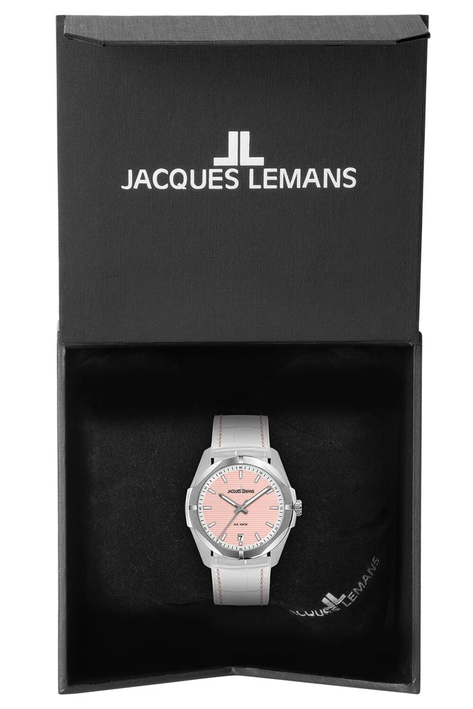 Jacques Lemans Women's Watch Melbourne 10 Bar Waterproof 1-2178G sporty wristwatch for women, battery-operated 3-hand quartz movement, date display with quick correction at the 6 o'clock position, rose-colored structured dial, white dial edge with seconds scale, luminescent indices, hour and minute hands, case made of solid 316L stainless steel, matt, partially polished, Protected crown with engraved logo, screwed case back, scratch-resistant mineral glass, white leather strap Crocodile embossing, padded and pink quilted, 2 loops, suitable for arm circumference 15.5 to 19.5 cm, silver-colored pin buckle with logo engraving, waterproof up to 10 bar, case width 35 mm, case height 8.2 mm Features of the Jacques Lemans watch: Department: Women Strap width: 18 mm Strap color: White Case thickness: 8 mm Case color: silver Case shape: Round Case size: 35 mm Case material: stainless steel Country and region of manufacture: China Maximum wrist circumference: 19.1-20 cm Product type: Women's watches Movement: Quartz Closure: pin buckle Water resistance: 10 bar Dial color: rose Special features: Date display Mineral glass You can find the large selection of Jacques Lemans watches in the uhrcenter eBay Shop: Jacques Lemans Watches at uhrcenter Information according to ElektroG You are legally obliged to return old electrical appliances. Old electrical appliances must not be disposed of in household waste, but must be collected separately. For this reason, electrical appliances are marked with the crossed-out garbage can. The substances contained in old electrical appliances can be reused. Please separate batteries, accumulators and lamps that are not enclosed in the old electrical device before handing it in. We are legally obliged to take back old electrical devices free of charge. You can return your old electrical appliance to us free of charge when you purchase a comparable new electrical appliance. When we deliver the new electrical appliance, we will collect the old appliance free of charge. This free collection is limited to waste equipment in the categories of heat exchangers, screens, monitors and equipment containing screens with a surface area of more than 100 square centimetres, and large appliances. Regardless of whether you purchase a new electrical appliance, you can return an old appliance that is no larger than 25 cm in any dimension to us free of charge. If you would like to return an old electrical device to us, please request a shipping label using the contact details provided in the seller's imprint. Please note that you are responsible for deleting personal data from the devices to be disposed of. Note according to the Battery Act Since our shipments may contain batteries and rechargeable batteries, we are obliged under the Battery Act (BattG) to inform you of the following: Batteries and rechargeable batteries must not be disposed of in household waste; you are legally obliged to return used batteries and rechargeable batteries. Used batteries may contain harmful substances that can harm the environment or your health if not stored or disposed of properly. However, batteries also contain important raw materials such as iron, zinc, manganese or nickel and can be recycled. You can either return the batteries to us after use or return them free of charge to a nearby retailer or municipal collection point or to our shipping warehouse. The sale in sales outlets is limited to the quantities usual for end users and to those used batteries that the distributor has or has had in its range as new batteries. The symbol with the crossed-out garbage can means that you must not dispose of batteries in household waste. Under this symbol you will also find the following symbols with the following meaning: Pb: Battery contains lead Cd: Battery contains cadmium Hg: Battery contains mercury uhrcenter Watches & Jewellery Top Brands Jacques Lemans Women's Watch Melbourne 10 Bar Waterproof 1-2178G sporty wristwatch for women, battery-operated 3-hand quartz movement, date display with quick correction at the 6 o'clock position, rose-colored structured dial, white dial edge with seconds scale, luminescent indices, hour and minute hands, case made of solid 316L stainless steel, matt, partially polished, Protected crown with engraved logo, screwed case back, scratch-resistant mineral glass, white leather strap Crocodile embossing, padded and pink quilted, 2 loops, suitable for arm circumference 15.5 to 19.5 cm, silver-colored pin buckle with logo engraving, waterproof up to 10 bar, case width 35 mm, case height 8.2 mm