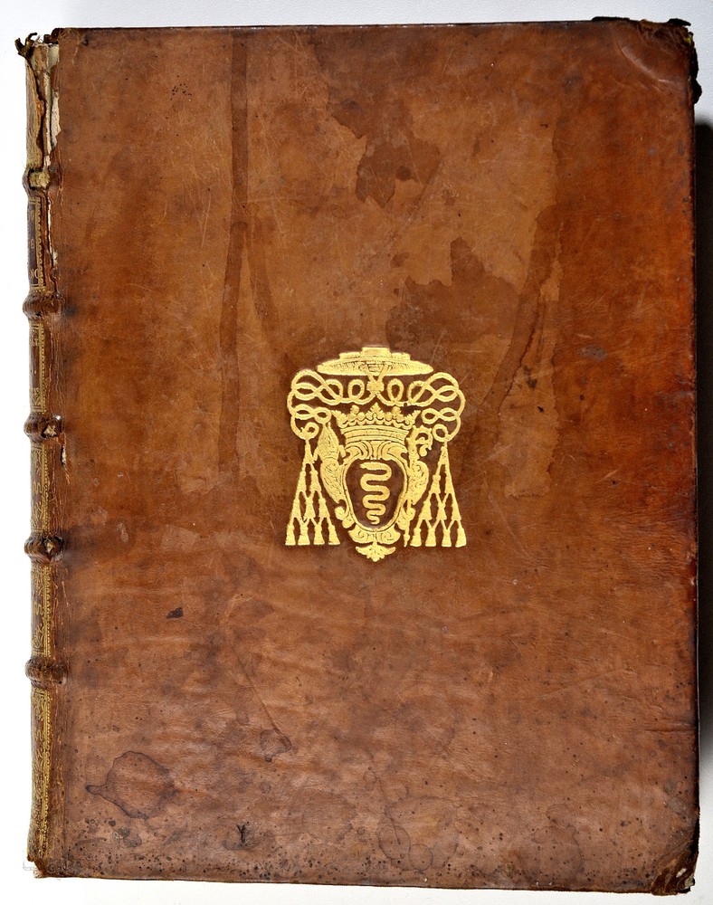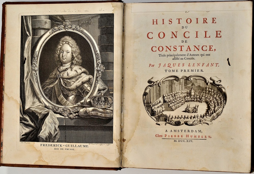 Tirées principalement d'Auteurs qui ont assisté au Concile ___________________ A Amsterdam, chez Pierre humbert, 1714 Deux volumes in 4°, reliure d'époque plein veau marbré, tranches rouges. Armes de Charles-Joachim Colbert de Croissy, évêque de Montpellier et neveu de Jean-Baptiste Colbert, sur les plats. La Couleuvre de Colbert dans chaque caisson des dos. (6) XLVIII et 816 pages en pagination continue illustrées de 19 portraits hors texte. Edition originale de cet essai historique édité pour le tricentenaire du Concile de Constance sous la plume impartiale du protestant Jacques Lenfant (1661-1728). C’est au cours de ce concile, convoqué de 1414 à 1418 par l'empereur Sigismond Ier et l'antipape Jean XXIII, qu’est mis fin au grand schisme d'Occident en déclarant hérétiques les réformateurs John Wyclif, Jan Hus et Jérôme de Prague, qui furent brûlés vifs. Coiffes arasées, mors partiellement ou totalement fendus, coins émoussés (voir la photo), quelques mouillures, le haut des pages de titre a été caviardé sans atteinte au texte. Néanmoins exemplaire très présentable. St.Bib3 Listing and template services provided by inkFrog