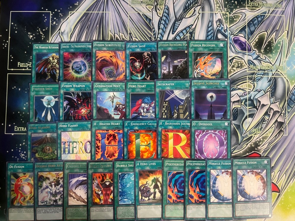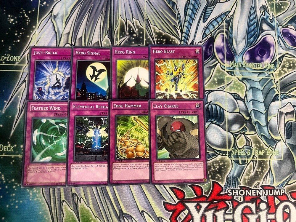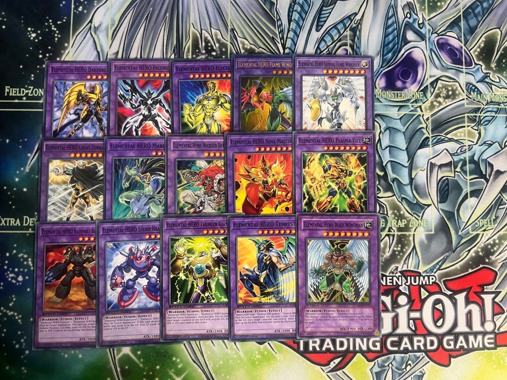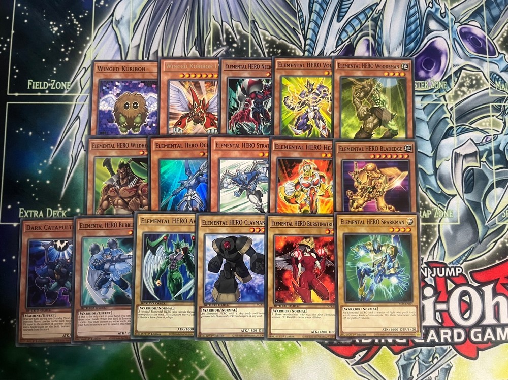 Hello! You are purchasing the deck list below, the cards will be English, real, and near mint to light play condition at worst. All decks are built with the lowest rarities for cards in mind to keep the price of the deck low and affordable for all duelists! Some cards may be in speed duel printing if this is the cheapest available copy of the card, but do not worry these are real cards and legal for tournament use! Purchase with confidence and safety! As an added bonus one pack of card sleeves will be included with your deck! Thanks again and good luck dueling! Now here's the decklist; Monsters: 1| Winged Kuriboh 1| Winged Kuriboh LV9 1| Elemental Hero Sparkman 1| Elemental Hero Avian 1| Elemental Hero Clayman 1| Elemental Hero Burstinatrix 1| Elemental Hero Bubbleman 1| Dark Catapulter 1| Elemental Hero Bladedge 1| Elemental Hero Heat 1| Elemental Hero Stratos 1| Elemental Hero Ocean 1| Elemental Hero Wildheart 1| Elemental Hero Woodsman 1| Elemental Hero Voltic 1| Elemental Hero Necroshade Spells; 1| Duel Academy 1| Skydive Scorcher 1| Skyscraper 1| Hero Heart 1| Generation Next 1| Fusion Weapon 1| Feather Shot 1| Fusion Recovery 1| Fusion Recycling Plant 1| Fusion Sage 1| Fusion Substitute 1| Sabitel - The Philosopher's Stone 1| The Warrior Returning Alive 1| Hero Flash!! 1| H - Heated Heart 1| E - Emergency Call 1| R - Righteous Justice 1| O - Oversoul 1| A Hero Lives 1| Bubble Shuffle 1| Burst Return 1| Cyclone Boomerang 1| Double Hero Attack 1| De-Fusion 2| Miracle Fusion 2| Polymerization Traps: 1| Clay Charge 1| Edge Hammer 1| Elemental Recharge 1| Feather Wind 1| Hero Blast 1| Hero Ring 1| Hero Signal 1| Justi-Break Extra Deck: 1| Elemental Hero Wild Wingman 1| Elemental Hero Tempest 1| Elemental Hero Thunder Giant 1| Elemental Hero Steam Healer 1| Elemental Hero Rampart Blaster 1| Elemental Hero Plasma Vice 1| Elemental Hero Nova Master 1| Elemental Hero Necroid Shaman 1| Elemental Hero Mariner 1| Elemental Hero Great Tornado 1| Elemental Hero Shining Flare Wingman 1| Elemental Hero Flame Wingman 1| Elemental Hero Electrum 1| Elemental Hero Escuridao 1| Elemental Hero Darkbright