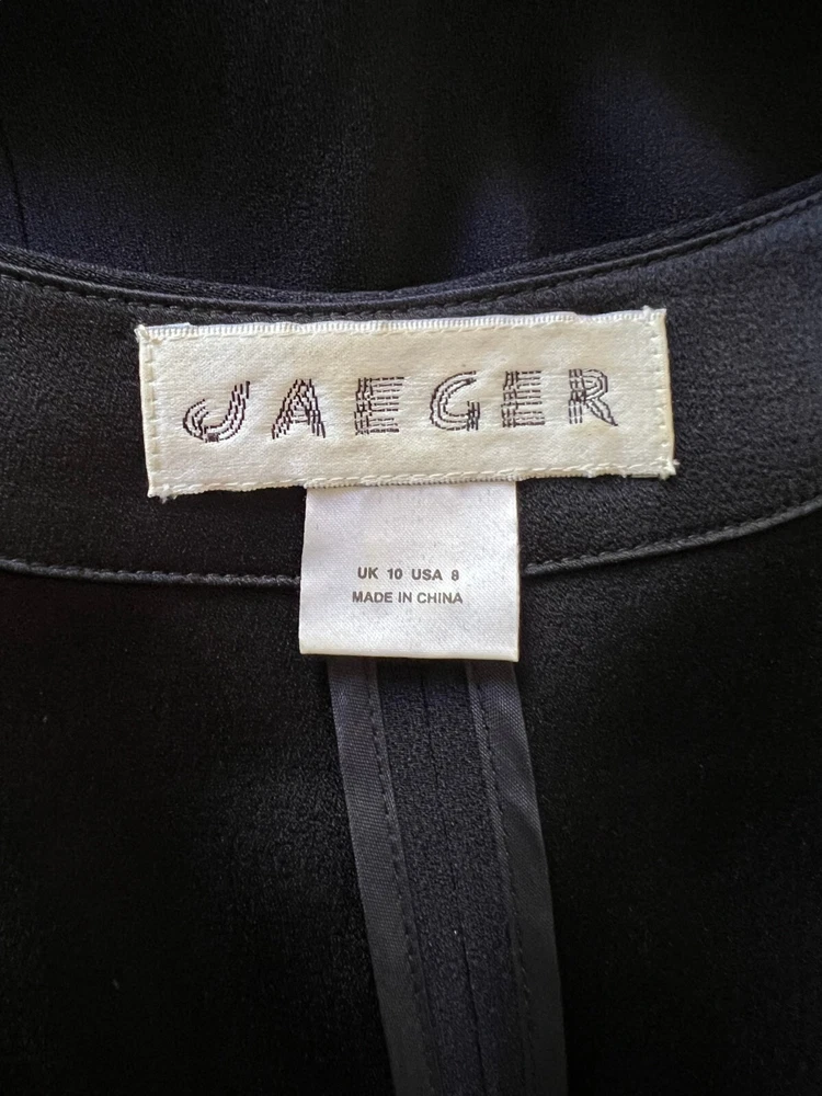 Size: 10 Jacket/Coat Length: Long Size Type: Regular Brand: Jaeger Theme: 90s, City, Designer, London, Retro, Wedding Seller Notes: “No signs of wear” Closure: Hook & Eye Season: Autumn, Spring, Summer, Winter Type: Jacket Occasion: Business, Casual, Formal, Party/Cocktail, Travel Style: Basic Jacket Department: Women Colour: Navy Outer Shell Material: Viscose Vintage: No Fabric Type: Crepe Pattern: No Pattern
