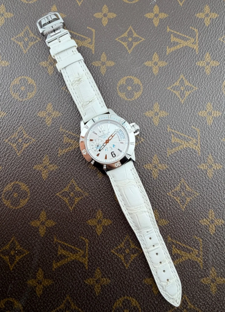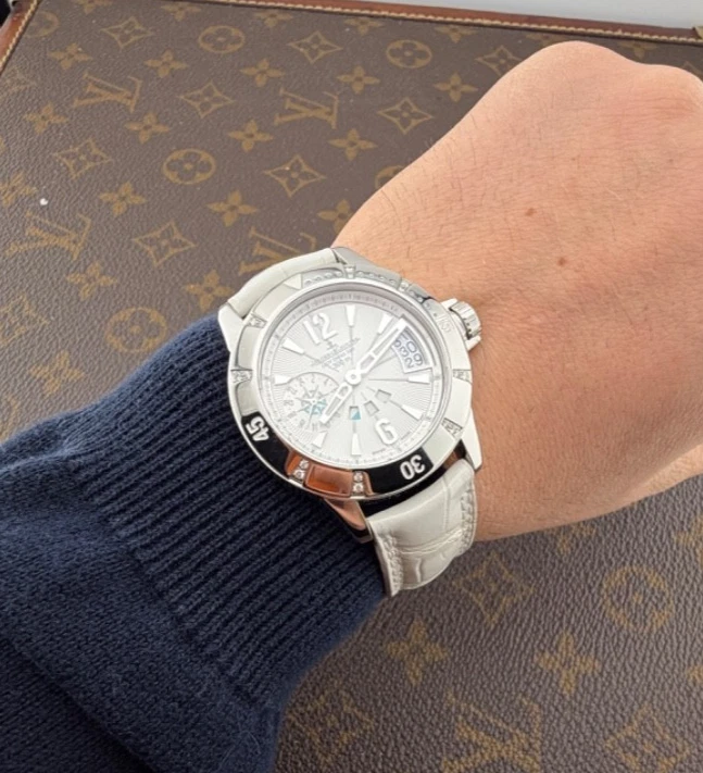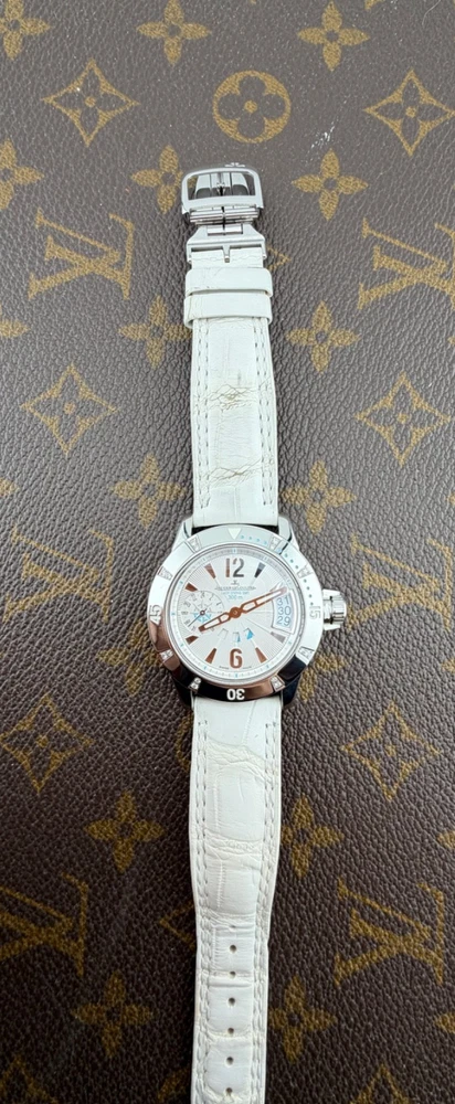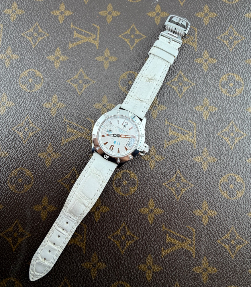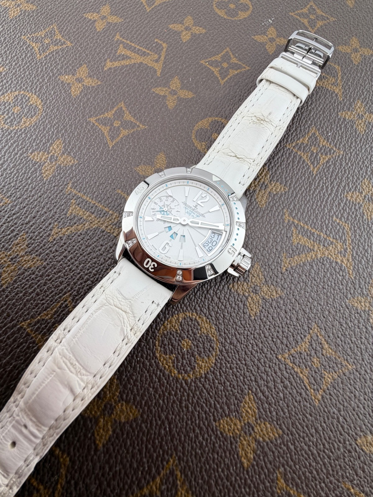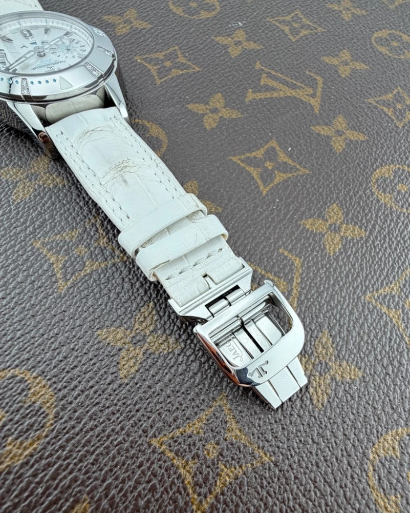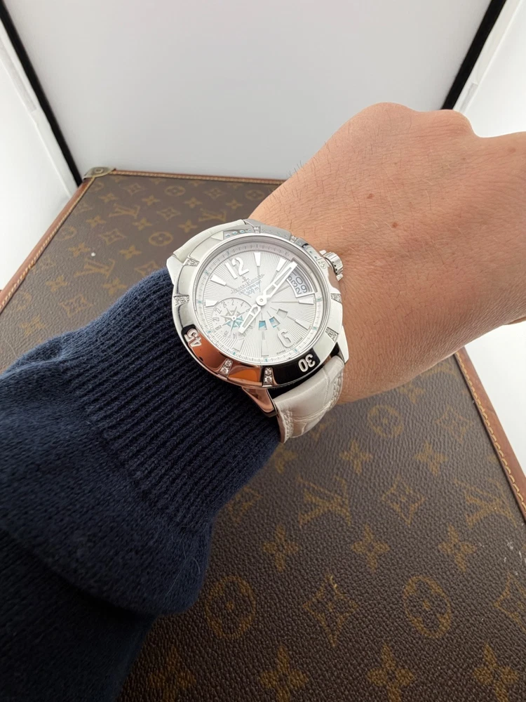 PROPONIAMO; -Marca: JAEGER LE COULTRE LADY DIVING GMT -Cassa: ACCIAIO INOX DA 38,5 MM , FONDELLO VITE ORIGINALE -Movimento :ORIGINALE JLC CALIBRO 971 D -Vetro:ZAFFIRO -Corona:ORIGINALE CON CHIUSURA -Ghiera: GIREVOLE CON INCASSATURA DI DIAMANTI VERI -Tasti: NO -Quadrante:BIANCO ORIGINALE -Lancette: ORIGINALI -Cinturino/Bracciale: CINTURINO ORIGINALE JLC DA 19 CM BIANCO , DOPPIA CHIUSURA DEPLOYANTE ORIGINALE JLC ACCIAIO 16MM + 1 CINTURINO NUOVO DI RISERVA -Scatola e documenti: NOSTRA BOX VIAGGIO (CON GARANZIA CARD 1 ANNO)+ GARANZIA ORIGINALE -Condizioni : OTTIME -Revisionato:SI -Uomo/donna/unisex:UOMO PER QUALSIASI DUBBIO CONTATTATEMI ,RISPONDEREMO IL PRIMA POSSIBILE Perché sceglierci per i vostri acquisti?? Perché offriamo orologi autentici, valutazioni trasparenti e competenza professionale maturata dal 2018. Ogni acquisto è garantito da controlli accurati, serietà e passione per l’orologeria di valore. RAGUSA RICCARDO